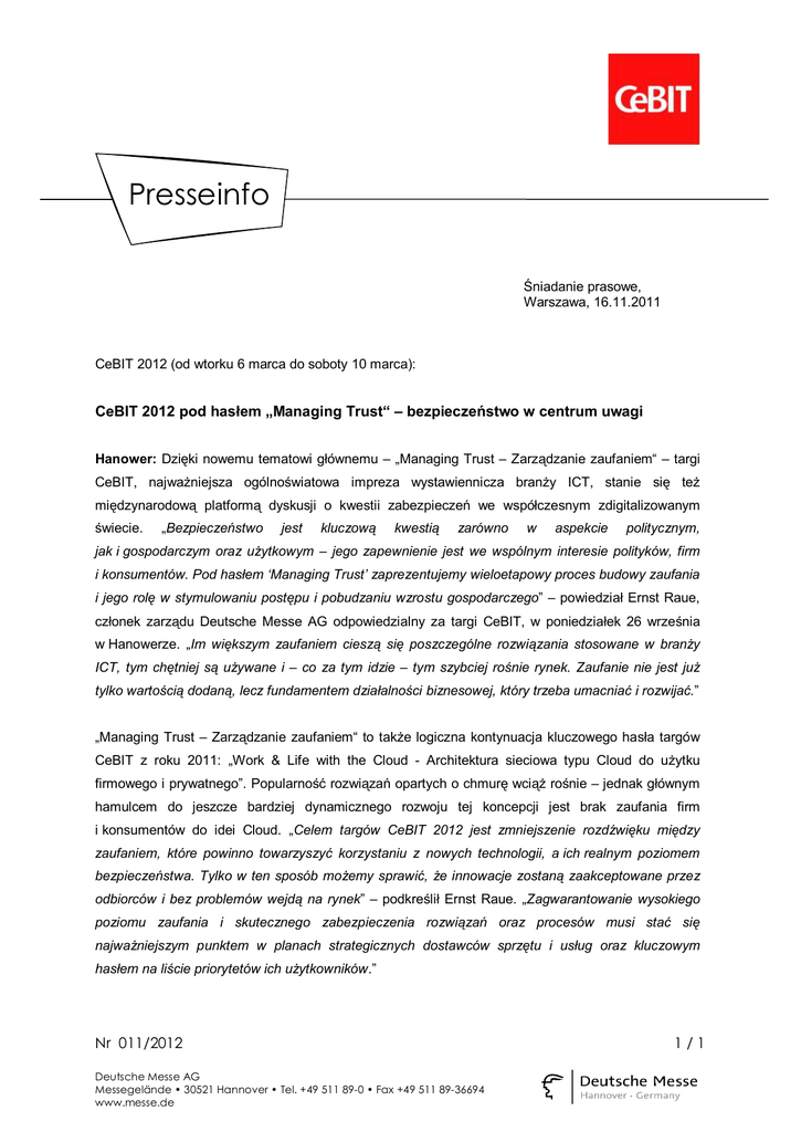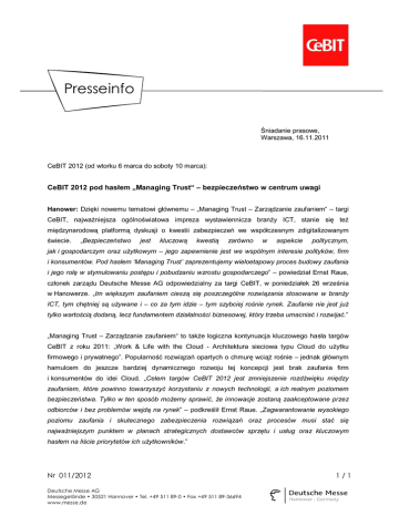 Presseinfo Śniadanie prasowe, Warszawa, 16.11.2011 CeBIT 2012 (od wtorku 6 marca do soboty 10 marca): CeBIT 2012 pod hasłem „Managing Trust“ – bezpieczeństwo w centrum uwagi Hanower: Dzięki nowemu tematowi głównemu – „Managing Trust – Zarządzanie zaufaniem“ – targi CeBIT, najważniejsza ogólnoświatowa impreza wystawiennicza branży ICT, stanie się też międzynarodową platformą dyskusji o kwestii zabezpieczeń we współczesnym zdigitalizowanym świecie. „Bezpieczeństwo jest kluczową kwestią zarówno w aspekcie politycznym, jak i gospodarczym oraz użytkowym – jego zapewnienie jest we wspólnym interesie polityków, firm i konsumentów. Pod hasłem ‘Managing Trust’ zaprezentujemy wieloetapowy proces budowy zaufania i jego rolę w stymulowaniu postępu i pobudzaniu wzrostu gospodarczego” – powiedział Ernst Raue, członek zarządu Deutsche Messe AG odpowiedzialny za targi CeBIT, w poniedziałek 26 września w Hanowerze. „Im większym zaufaniem cieszą się poszczególne rozwiązania stosowane w branży ICT, tym chętniej są używane i – co za tym idzie – tym szybciej rośnie rynek. Zaufanie nie jest już tylko wartością dodaną, lecz fundamentem działalności biznesowej, który trzeba umacniać i rozwijać.” „Managing Trust – Zarządzanie zaufaniem“ to także logiczna kontynuacja kluczowego hasła targów CeBIT z roku 2011: „Work & Life with the Cloud - Architektura sieciowa typu Cloud do użytku firmowego i prywatnego”. Popularność rozwiązań opartych o chmurę wciąż rośnie – jednak głównym hamulcem do jeszcze bardziej dynamicznego rozwoju tej koncepcji jest brak zaufania firm i konsumentów do idei Cloud. „Celem targów CeBIT 2012 jest zmniejszenie rozdźwięku między zaufaniem, które powinno towarzyszyć korzystaniu z nowych technologii, a ich realnym poziomem bezpieczeństwa. Tylko w ten sposób możemy sprawić, że innowacje zostaną zaakceptowane przez odbiorców i bez problemów wejdą na rynek” – podkreślił Ernst Raue. „Zagwarantowanie wysokiego poziomu zaufania i skutecznego zabezpieczenia rozwiązań oraz procesów musi stać się najważniejszym punktem w planach strategicznych dostawców sprzętu i usług oraz kluczowym hasłem na liście priorytetów ich użytkowników.” Nr 011/2012 Deutsche Messe AG Messegelände • 30521 Hannover • Tel. +49 511 89-0 • Fax +49 511 89-36694 www.messe.de 1/1 Nr 011/2012 Wybór hasła „Managing Trust“ na kluczowy temat targów CeBIT 2012 poprzedziły liczne konsultacje z ekspertami z całego świata. W proces ten włączeni zostali managerowie najwyższego szczebla z firm teleinformatycznych z różnych krajów oraz przedstawiciele przedsiębiorstw będących głównymi odbiorcami tego typu rozwiązań, a także – po raz pierwszy – użytkownicy indywidualni. Wydarzenia ostatnich miesięcy pokazały, że obecnie nie wystarcza już zainstalowanie firewalla czy programu antywirusowego w komputerze. Koniecznością staje się kompleksowe podejście do zabezpieczeń – stworzenie spójnego systemu bezpieczeństwa i zadbanie o to, co nazywamy zarządzaniem zaufaniem (Trust Management). CeBIT aktywnie angażuje się w ten proces. Tematyka imprezy, która odbędzie się w dniach 6 – 10 marca 2012 w Hanowerze, obejmie szerokie spektrum zagadnień: omówione zostaną zarówno zabezpieczenia fizyczne, jak i bezpieczeństwo procesów i rozwiązań, a także zaufanie użytkowników do poszczególnych systemów oraz kwestie polityczno-gospodarcze, takie jak ochrona danych i dóbr osobistych. W centrum uwagi znajdą się też problemy związane ze zwalczaniem przestępczości internetowej. O tym, jak bardzo wzrosła świadomość związana z zapewnieniem lepszego poziomu bezpieczeństwa w sieci, świadczy choćby aktualny raport przygotowany przez firmę Symantec. Według przedstawionych tam danych, Internetowi przestępcy spowodowali w ubiegłym roku na świecie straty finansowe w wysokości 114 miliardów dolarów. Po doliczeniu czasu i nakładów poniesionych w związku z tymi atakami przez poszkodowane firmy i użytkowników, wartość strat wzrasta do 388 miliardów dolarów. Skala przestępstw rośnie między innymi w związku z coraz większą popularnością urządzeń mobilnych – takich jak smartphone’y czy tablety. Dostęp do wrażliwych danych handlowych staje się bowiem dzięki nim coraz łatwiejszy również dla przestępców, którzy mogą zaatakować wszędzie i o każdej porze. Bezpieczeństwo sieciowe rodzi szereg zupełnie nowych wyzwań. „Szczególnie w kontekście używania urządzeń mobilnych musimy przemyśleć wiele kwestii. Zajmiemy się nimi w ramach targów CeBIT. Jako platforma, na której producenci prezentują innowacje w zakresie produktów i usług branżowych, są one idealnym miejscem do zajęcia się tematyką zabezpieczeń. Ponadto atmosfera imprezy sprzyja dialogowi w atmosferze zaufania” – podkreślił szef targów CeBIT. Hasło „Managing Trust” widoczne będzie we wszystkich halach, stanie się też mottem wielu wydarzeń specjalnych. Dodatkowo przykłady zabezpieczeń oraz scenariuszy działania – zarówno w odniesieniu do bezpieczeństwa fizycznego, jak i do bezpieczeństwa ICT – zaprezentowane zostaną w specjalnym obszarze tematycznym „CeBIT Security World” w hali 12. Wywiad z szefem targów CeBIT, Frankiem Pörschmannem, przybliżający temat wiodący imprezy, znajdą Państwo na stronie www.cebit.de/de/leitthema-2012. Nr 011/2012 Deutsche Messe AG Messegelände • 30521 Hannover • Tel. +49 511 89-0 • Fax +49 511 89-36694 www.messe.de 2/2 Nr 011/2012 O targach CeBIT Targi CeBIT to najważniejsza ogólnoświatowa platforma spotkań przedstawicieli branży teleinformatycznej i gospodarki cyfrowej. Od roku 1986 odbywają się one jako samodzielna impreza wystawiennicza. Organizowane są co roku na wiosnę w Hanowerze przez Deutsche Messe AG. Dzięki jedynej w swoim rodzaju formule łącz