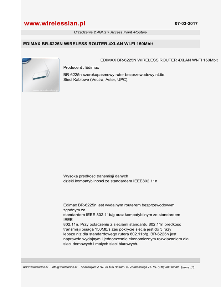 www.wirelesslan.pl 07-03-2017 Urzadzenia 2,4GHz > Access Point /Routery EDIMAX BR-6225N WIRELESS ROUTER 4XLAN WI-FI 150Mbit EDIMAX BR-6225N WIRELESS ROUTER 4XLAN WI-FI 150Mbit Producent : Edimax BR-6225n szerokopasmowy ruter bezprzewodowy nLite. Sieci Kablowe (Vectra, Aster, UPC). Wysoka predkosc transmisji danych dzieki kompatybilnosci ze standardem IEEE802.11n Edimax BR-6225n jest wydajnym routerem bezprzewodowym zgodnym ze standardem IEEE 802.11b/g oraz kompatybilnym ze standardem IEEE 802.11n. Przy polaczeniu z sieciami standardu 802.11n predkosc transmisji osiaga 150Mb/s zas pokrycie siecia jest do 3 razy lepsze niz dla standardowego rutera 802.11b/g. BR-6225n jest naprawde wydajnym i jednoczesnie ekonomicznym rozwiazaniem dla sieci domowych i malych sieci biurowych. www.wirelesslan.pl - [email protected] - Konsorcjum ATS, 26-600 Radom, ul. Zeromskiego 75, tel. (048) 383 00 30 Strona 1/5 www.wirelesslan.pl 07-03-2017 Szerokie mozliwosci wspoldzielenia polaczenia internetowego Dzieki wbudowanej funkcji NAT (translacja adresow) Edimax BR-6225n pozwala na wspoldzielenie polaczenia internetowego przez maksymalnie 253 uzytkownikow podlaczonych przewodowo badz bezprzewodowo. Zdalny badz lokalny system zarzadzania System zarzadzania Edimax EZView pozwala na zmiane ustawien rutera zarowno z poziomu sieci LAN jak i za posrednictwem internetu. Urzadzenia kompatybilne z UpnP sa automatycznie wykrywane zas informacje o nich mozna uzyskac za posrednictwem interfejsu rutera. Dzieki temu mozliwa jest latwa zmiana ich adresow IP, zarzadzanie przydzialem pasma, otwieranie portow lub dodawanie urzadzen do DMZ. Obsluga trybu polaczenia WISP (bezprzewodowy ISP) Urzadzenie moze zostac podlaczone do punktu dostepu dostawcy internetu za posrednictwem sieci bezprzewodowej. Dzialajac w takim trybie BR-6225n pozwala nie tylko na podlaczenie klientow przewodowych ale rowniez tworzy siec bezprzewodowa udostepniajac w ten www.wirelesslan.pl - [email protected] - Konsorcjum ATS, 26-600 Radom, ul. Zeromskiego 75, tel. (048) 383 00 30 Strona 2/5 www.wirelesslan.pl 07-03-2017 sposob internet wszystkim klientom bezprzewodowym. Latwa w uzyciu, wielojezyczna plyta konfiguracyjna* Na dolaczonej plycie CD znajduje sie unikalny, wielojezyczny kreator konfiguracji. Poprzez proste podazanie za animowanymi wskazowkami uzytkownik moze w ciagu kilku minut skonfigurowac polaczenie internetowe! Praktyczny sprzetowy wylacznik sieci bezprzewodowej oraz przycisk WPS (Wi-Fi Protected Setup) Edimax BR-6225n jest wyposazony w przelacznik WPS oraz wylacznik sieci bezprzewodowej. Dzieki temu mozna latwo kontrolowac dzialanie sieci bezprzewodowej oraz konfigurowac jej zabezpieczenia. Czasowe wylaczenie sieci bezprzewodowej jest mozliwe bez ingerencji w ustawienia rutera za posrednictwem jego panelu konfiguracyjnego.* Plyta instalacyjna EZmax obsluguje jedynie rutery Edimax. www.wirelesslan.pl - [email protected] - Konsorcjum ATS, 26-600 Radom, ul. Zeromskiego 75, tel. (048) 383 00 30 Strona 3/5 www.wirelesslan.pl 07-03-2017 Zgodnosc ze standardami bezprzewodowymi 802.11g and 802.11b Wbudowany sprzetowy wylacznik sieci bezprzewodowej Kompatybilnosc ze standardem 802.11n - predkosc do 150Mb/s Obsluga trybu WISP (bezprzewodowy ISP) Wielojezyczny kreator EZmax Obsluga EZView www.wirelesslan.pl - [email protected] - Konsorcjum ATS, 26-600 Radom, ul. Zeromskiego 75, tel. (048) 383 00 30 Strona 4/5 www.wirelesslan.pl 07-03-2017 Obsluga WMM, WEP, WPA, WPA2, DDNS, QoS, filtrowania IP/MAC, DMZ oraz Virtual Server www.wirelesslan.pl - [email protected] - Konsorcjum ATS, 26-600 Radom, ul. Zeromskiego 75, tel. (048) 383 00 30 Strona 5/5