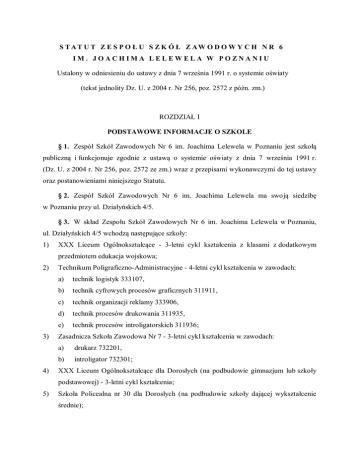 S TAT U T Z E S P O Ł U S Z K Ó Ł Z AW O D O W Y C H N R 6 IM. JOACHIMA LELEWELA W POZNANIU Ustalony w odniesieniu do ustawy z dnia 7 września 1991 r. o systemie oświaty (tekst jednolity Dz. U. z 2004 r. Nr 256, poz. 2572 z późn. zm.) ROZDZIAŁ I PODSTAWOWE INFORMACJE O SZKOLE § 1. Zespół Szkół Zawodowych Nr 6 im. Joachima Lelewela w Poznaniu jest szkołą publiczną i funkcjonuje zgodnie z ustawą o systemie oświaty z dnia 7 września 1991 r. (Dz. U. z 2004 r. Nr 256, poz. 2572 ze zm.) wraz z przepisami wykonawczymi do tej ustawy oraz postanowieniami niniejszego Statutu. § 2. Zespół Szkół Zawodowych Nr 6 im. Joachima Lelewela ma swoją siedzibę w Poznaniu przy ul. Działyńskich 4/5. § 3. W skład Zespołu Szkół Zawodowych Nr 6 im. Joachima Lelewela w Poznaniu, ul. Działyńskich 4/5 wchodzą następujące szkoły: 1) XXX Liceum Ogólnokształcące - 3-letni cykl kształcenia z klasami z dodatkowym przedmiotem edukacja wojskowa; 2) 3) 4) Technikum Poligraficzno-Administracyjne - 4-letni cykl kształcenia w zawodach: a) technik logistyk 333107, b) technik cyfrowych procesów graficznych 311911, c) technik organizacji reklamy 333906, d) technik procesów drukowania 311935, e) technik procesów introligatorskich 311936; Zasadnicza Szkoła Zawodowa Nr 7 - 3-letni cykl kształcenia w zawodach: a) drukarz 732201, b) introligator 732301; XXX Liceum Ogólnokształcące dla Dorosłych (na podbudowie gimnazjum lub szkoły podstawowej) - 3-letni cykl kształcenia; 5) Szkoła Policealna nr 30 dla Dorosłych (na podbudowie szkoły dającej wykształcenie średnie); Statut Zespołu Szkół Zawodowych Nr 6 im. Joachima Lelewela w Poznaniu 6) -2- Szkoła może kształcić w ramach kwalifikacyjnych kursów zawodowych (KKZ), których program nauczania uwzględnia podstawę programową kształcenia w zawodach, w zakresie jednej kwalifikacji, których ukończenie umożliwia przystąpienie do egzaminu potwierdzającego kwalifikacje w zawodzie w zakresie tej kwalifikacji. § 4. Organem prowadzącym szkołę jest Miasto Poznań, a organem sprawującym nadzór pedagogiczny jest Wielkopolski Kurator Oświaty. § 5. Dyrektor szkoły, w porozumieniu z Radą Pedagogiczną, Samorządem Uczniowskim i Radą Rodziców, z uwzględnieniem zainteresowań uczniów oraz możliwości organizacyjnych szkoły, wyznacza na początku etapu edukacyjnego dla danego oddziału liceum ogólnokształcącego od dwóch do czterech przedmiotów ujętych w podstawie programowej w zakresie rozszerzonym. Dyrektor, po zasięgnięciu opinii Rady Pedagogicznej, Samorządu Uczniowskiego i Rady Rodziców, uwzględniając zawód, w którym kształci technikum, zainteresowania uczniów oraz możliwości organizacyjne, kadrowe i finansowe technikum, ustala przedmioty realizowane w zakresie rozszerzonym, spośród których uczeń realizuje dwa przedmioty wskazane przez szkołę. § 6. Do podstawowych dokumentów regulujących pracę szkoły oprócz Statutu należą: Plan Pracy Szkoły i Plan Wychowawczy, Wewnątrzszkolne Ocenianie i Wewnątrzszkolny System Oceniania Zachowania oraz Regulamin Wystawiania Oceny Zachowania, Wewnątrzszkolny System Doradztwa Zawodowego, Regulamin Rady Pedagogicznej, Szkolny Program Profilaktyki, Regulamin Samorządu Uczniowskiego, Regulamin Rady Rodziców, Regulamin Przyjmowania Uczniów do ZSZ Nr 6 im. J. Lelewela, Szkolny Zestaw Programów Nauczania, Regulamin Organizacyjny ZSZ Nr 6 im. J. Lelewela. ROZDZIAŁ II CELE I ZADANIA SZKOŁY § 7. 1. Do podstawowych zadań szkoły należą: 1) kształcenie i wychowywanie młodzieży w oparciu o zasady demokracji, tolerancji, sprawiedliwości i wolności; 2) budzenie i kształtowanie poczucia tożsamości narodowej, etnicznej, językowej i religijnej; 3) przekazywanie wiedzy i umiejętności niezbędnych do ukończenia szkoły, zdania egzaminu maturalnego oraz zdobycia określonego zawodu, z tym, że zagadnienia Statut Zespołu Szkół Zawodowych Nr 6 im. Joachima Lelewela w Poznaniu -3- związane z egzaminem maturalnym oraz egzaminem potwierdzającym kwalifikacje w zawodzie regulują odrębne procedury; 4) umożliwienie absolwentom dokonania świadomego wyboru dalszego kierunku kształcenia lub drogi zawodowej; 5) rozwijanie zainteresowań i uzdolnień uczniów oraz stwarzanie warunków do realizacji indywidualnych programów nauczania i ukończenia szkoły w skróconym czasie poprzez organizację różnych form aktywności pozalekcyjnej uczniów w szkole; 6) sprawowanie opieki nad uczniami poprzez zapewnienie im prozdrowotnych warunków życia i pracy w szkole, udzielanie pomocy psychologicznej i pedagogicznej; 7) upowszechnianie wiedzy ekologicznej i kształcenie właściwych postaw wobec problemów ochrony środowiska; 8) stwarzanie warunków sprzyjających procesowi uspołecznienia życia szkoły i demokratyzacji w systemie jej kierowania; 9) kierowanie się w działaniach dydaktyczno-wychowawczych dobrem uczniów, troską o ich zdrowie i poszanowaniem godności osobistej; 10) umożliwianie uczniom nauki religii lub etyki w atmosferze pełnej tolerancji wyznaniowej; 11) udzielanie uczniom pomocy psychologicznej i pedagogicznej przez pedagoga szkolnego, psychologa i doradcę zawodowego, polegającej w szczególności na: a) rozpoznawaniu i zaspokajaniu indywidualnych potrzeb rozwojowych i edukacyjnych ucznia oraz rozpoznawaniu indywidualnych możliwości psychofizycznych ucznia, b) podejmowaniu działań wychowawczych i profilaktycznych wynikających z programu wychowawczego szkoły i programu profilaktyki, o których mowa w odrębnych przepisach oraz wspieraniu nauczycieli w tym zakresie, c) prowadzeniu edukacji prozdrowotnej i promocji zdrowia wśród uczniów, nauczycieli i rodziców, d) wspieraniu uczniów metodami aktywizującymi w dokonywaniu wyboru kierunku dalszego kształcenia, zawodu i planowaniu kariery zawodowej oraz udzielaniu informacji w tym zakresie, e) wspieraniu nauczycieli w organizowaniu Wewnątrzszkolnego Systemu Doradztwa oraz 