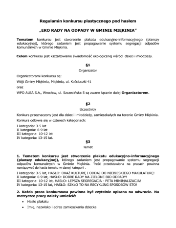 Regulamin konkursu plastycznego pod hasłem „EKO RADY NA ODPADY W GMINIE MIĘKINIA” Tematem konkursu jest stworzenie plakatu edukacyjno-informacyjnego (planszy edukacyjnej), którego zadaniem jest propagowanie systemu segregacji odpadów komunalnych w Gminie Miękinia. Celem konkursu jest kształtowanie świadomość ekologicznej wśród dzieci i młodzieży. §1 Organizator Organizatorami konkursu są: Wójt Gminy Miękinia, Miękinia, ul. Kościuszki 41 oraz WPO ALBA S.A., Wrocław, ul. Szczecińska 5 są zwane łącznie dalej Organizatorem. §2 Uczestnicy Konkurs przeznaczony jest dla dzieci i młodzieży, zamieszkałych na terenie Gminy Miękinia. Konkurs odbywa się w czterech kategoriach: I kategoria: 3-5 lat II kategoria: 6-9 lat III kategoria: 10-12 lat IV kategoria: 13-15 lat. §3 Temat 1. Tematem konkursu jest stworzenie plakatu edukacyjno-informacyjnego (planszy edukacyjnej), którego zadaniem jest propagowanie systemu segregacji odpadów komunalnych w Gminie Miękinia. Treść przedstawiona na pracach powinna nawiązywać do hasła tematu w danej kategorii . I kategoria: 3-5 lat, HASŁO: OKAŻ KULTURĘ I ODDAJ DO NIEBIESKIEGO MAKULATURĘ! II kategoria: 6-9 lat, HASŁO: DOBRE RADY NA ZIELONE BIO ODPADY! III kategoria: 10-12 lat, HASŁO: LEPSZA SEGREGACJA - PETA MINIMALIZACJA! IV kategoria: 13-15 lat, HASŁO: SZKŁO TO NA RECYKLING SPOSOBÓW STO! 2. Każda praca konkursowa powinna być czytelnie opisana na odwrocie. Na metryczce pracy należy umieścić: Hasło plakatu Imię, nazwisko i adres zamieszkania dziecka Wiek dziecka Imię i nazwisko rodzica/opiekuna Adres mailowy i numer telefonu rodzica/opiekuna §4 Konkurs 1. Konkurs zostanie ogłoszony w dniu 9 lipca 2015 roku i będzie trwał do 31 lipca 2015 roku. 2. Począwszy od dnia ogłoszenia Konkursu, Organizator będzie publikować informacje o Konkursie w wybranych przez siebie środkach masowego przekazu. 3. Zadaniem uczestników jest zaprojektowanie oryginalnego plakatu, który będzie mógł być wykorzystany przez Urząd Gminy Miękinia i WPO ALBA S.A. do celów edukacyjno promocyjnych. 4. Plakaty nie mogą zawierać treści wulgarnych i obscenicznych oraz naruszać powszechnie przyjętych norm etycznych. 5. Każdy uczestnik może zgłosić do konkursu 1 pracę konkursową. 6. Nie można zgłosić do Konkursu pracy, która jest pracą zbiorową. 7. Plakat należy zaprojektować w formacie A3 (297mmx420 mm) lub A2 (420mmx594mm). Technika wykonania prac konkursowych jest dowolna np. malarstwo, grafika, rysunek, college na płaskim podłożu umożliwiającym prezentację w antyramie. 8. Prace konkursowe wraz z formularzami zgłoszenia muszą zostać złożone w siedzibie Organizatora Konkursu: Biuro Obsługi Klienta w Urzędzie Gminy Miękinia, z dopiskiem „EKO RADY NA ODPADY W GMINIE MIĘKINIA”, do dnia 31 lipca 2015 roku do godziny 14.00. Prace, które dotrą po tym terminie, nie będą oceniane. 9. Niezachowanie przez uczestnika określonych w pkt. 4-8 warunków formalnych lub technicznych zgłoszenia może spowodować odrzucenie projektu przez Organizatora. 10. Nadesłane prace nie podlegają zwrotowi. §5 Ogłoszenie wyników konkursu 1. Prace konkursowe oceni Komisja Konkursowa powołana przez Organizatora konkursu, składająca się z przedstawicieli Organizatora (po 2 przedstawicieli z każdej strony). 2. Ogłoszenie wyników Konkursu nastąpi do dnia 10 sierpnia 2015 roku poprzez stronę internetową Gminy Miękinia: www.miekinia.pl, WPO ALBA S.A.: http://www.wroclaw.alba.com.pl/, portal ekopraktyczni.pl i 3. Komisja Konkursowa przy ocenie zgłoszonych prac stosować będzie następujące kryteria: zgodność tematu pracy z tematyką konkursową, wartość artystyczna i jasność przekazu, oryginalność podejścia do tematu i pomysł na plakat, wartość merytoryczna i walory edukacyjne pracy. 4. Komisja Konkursowa uznaje głos przewodniczącego za decydujący w sytuacji, kiedy w czasie głosowania nastąpi równy podział oddanych głosów. 6. Decyzja Komisji Konkursowej jest nieodwołalna. §6 Nagrody 1. Komisja Konkursowa wyłoni po 3 laureatów w każdej kategorii konkursowej. 2. Nagrodą dla każdego laureata będzie organizatorów: nagroda rzeczowa ufundowana przez I miejsce z każdej kategorii: aparat fotograficzny, II miejsce z każdej kategorii: plecak szkolny, III miejsce z każdej kategorii: sprzęt sportowy. 3. Laureatom nie przysługują roszczenia o wypłatę równowartości pieniężnej uzyskanych nagród. §7 Prawa autorskie 1. Rodzic/Opiekun prawny autora pracy wyraża zgodę na bezpłatne przeniesienie na Organizatora majątkowych praw autorskich do projektu na polach eksploatacji wskazanych w art. 50 ustawy z dnia 4 lutego 1994 r. o prawie autorskim i prawach pokrewnych. 2. Zgoda na przeniesienie autorskich praw majątkowych do plakatu następuje poprzez zgłoszenie projektu do Konkursu i dołączenie oświadczenia, że uczestnik akceptuje warunki regulaminu Konkursu 3. Odpowiednio do zapisów ust. 1, tj. przeniesienia na Organizatora majątkowych praw autorskich do plakatów, Organizator zastrzega sobie prawo do przeprowadzania ekspozycji plakatów na terenie całego kraju. 4. Wszyscy uczestnicy Konkursu, poprzez zgłoszenie plakatu do Konkursu i dołączenie oświadczenia, że akceptują warunki regulaminu Konkursu, wyrażają zgodę na bezpłatne eksponowanie wybranych przez Komisję Konkursową plakatów na pokonkursowej wystawie, oraz na bezpłatną publikację i eksponowanie prac konkursowych, bądź ich fragmentów w prasie, Internecie do celów promocyjnych i edukacyjnych; a także na wykorzystanie prac w całości lub części jako plakaty, ulotki, broszury wydawane przez Organizatora. §8 Ochrona danych osobowych 1. Uczestnicy Konkursu wyrażają zgodę na przetwarzanie ich danych osobowych w rozumieniu ustawy z dnia 29 sierpnia 1997 r. o ochronie danych osobowych (Dz. U. Nr 133, poz. 833) w celach prowadzenia Konkursu, wyłonienia laureatów i przyznania nagrody, wydawania,