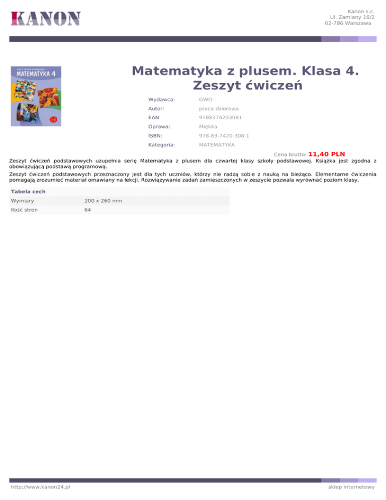 Kanon s.c. Ul. Zamiany 16/2 02-786 Warszawa Matematyka z plusem. Klasa 4. Zeszyt ćwiczeń Wydawca: GWO Autor: praca zbiorowa EAN: 9788374203081 Oprawa: Miękka ISBN: 978-83-7420-308-1 Kategoria: MATEMATYKA Cena brutto: 11,40 PLN Zeszyt ćwiczeń podstawowych uzupełnia serię Matematyka z plusem dla czwartej klasy szkoły podstawowej. Książka jest zgodna z obowiązującą podstawą programową. Zeszyt ćwiczeń podstawowych przeznaczony jest dla tych uczniów, którzy nie radzą sobie z nauką na bieżąco. Elementarne ćwiczenia pomagają zrozumieć materiał omawiany na lekcji. Rozwiązywanie zadań zamieszczonych w zeszycie pozwala wyrównać poziom klasy. Tabela cech Wymiary 200 x 260 mm Ilość stron 64 http://www.kanon24.pl sklep internetowy