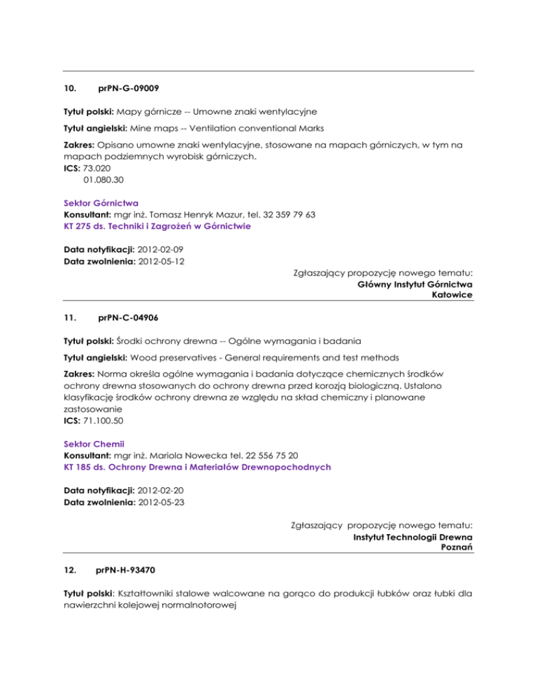 10. prPN-G-09009 Tytuł polski: Mapy górnicze -- Umowne znaki wentylacyjne Tytuł angielski: Mine maps -- Ventilation conventional Marks Zakres: Opisano umowne znaki wentylacyjne, stosowane na mapach górniczych, w tym na mapach podziemnych wyrobisk górniczych. ICS: 73.020 01.080.30 Sektor Górnictwa Konsultant: mgr inż. Tomasz Henryk Mazur, tel. 32 359 79 63 KT 275 ds. Techniki i Zagrożeń w Górnictwie Data notyfikacji: 2012-02-09 Data zwolnienia: 2012-05-12 Zgłaszający propozycję nowego tematu: Główny Instytut Górnictwa Katowice 11. prPN-C-04906 Tytuł polski: Środki ochrony drewna -- Ogólne wymagania i badania Tytuł angielski: Wood preservatives - General requirements and test methods Zakres: Norma określa ogólne wymagania i badania dotyczące chemicznych środków ochrony drewna stosowanych do ochrony drewna przed korozją biologiczną. Ustalono klasyfikację środków ochrony drewna ze względu na skład chemiczny i planowane zastosowanie ICS: 71.100.50 Sektor Chemii Konsultant: mgr inż. Mariola Nowecka tel. 22 556 75 20 KT 185 ds. Ochrony Drewna i Materiałów Drewnopochodnych Data notyfikacji: 2012-02-20 Data zwolnienia: 2012-05-23 Zgłaszający propozycję nowego tematu: Instytut Technologii Drewna Poznań 12. prPN-H-93470 Tytuł polski: Kształtowniki stalowe walcowane na gorąco do produkcji łubków oraz łubki dla nawierzchni kolejowej normalnotorowej Tytuł angielski: Hot rolled steel shapes for the fishplate production and fishplates for standardgauge track Zakres: Określono ogólne wymagania, badania i wymiary dla kształtowników stalowych walcowanych na gorąco służących do produkcji łubków i łubków do szyn kolejowych ICS: 45.080 Sektor Hutnictwa Konsultant: mgr inż. Dorota Jarosz tel. 32 359 79 63 KT 146 ds. Kształtowników Stalowych Data notyfikacji: 2012-02-23 Data zwolnienia: 2012-05-26 Zgłaszający propozycję nowego tematu: ArcelorMittal Poland S.A. Zakład Huta Królewska Dąbrowa Górnicza 13. prPN-G-02100 Tytuł polski: Górnictwo odkrywkowe -- Pas zagrożenia i pas ochronny wyrobisk odkrywkowych -- Użytkowanie i szerokość Tytuł angielski: Opencast mining -- Threat strip and protective strip of round open pits -Application and width Zakres: W niniejszej normie określono sposób użytkowania pasa zagrożenia i pasa ochronnego oraz szerokości tych pasów wzdłuż obrzeża wyrobiska odkrywkowego, zabezpieczającego obiekty stałe lub tereny położone w pobliżu wyrobisk odkrywkowych przed zagrożeniami związanymi z działalnością eksploatacyjną lub poeksploatacyjną oraz zabezpieczającego wyrobiska przed zagrożeniami związanymi z użytkowaniem obiektów stałych ICS: 73.020 Sektor Górnictwa Konsultant: mgr inż. Krzysztof Rakowski tel. 32 359 79 66 KT 227 ds. Górnictwa Odkrywkowego Data notyfikacji: 2012-02-20 Data zwolnienia: 2012-05-23 Zgłaszający propozycję nowego tematu: POLTEGOR-projekt Sp.z o.o. Wrocław 14. prPN-C-04375-1 Tytuł polski: Badanie stałych i ciekłych paliw -- Oznaczanie ciepła spalania w bombie kalorymetrycznej i obliczanie wartości opałowej -- Część 1: Postanowienia ogólne, aparatura, metody Tytuł angielski: Testing of solid and liquid fuels - Determining the gross calorific value using the bomb calorimeter, and calculation of net calorific value - Part 1: General information, apparatus, methods Zakres: W niniejszej normie określono metodę oznaczania ciepła spalania paliw stałych i ciekłych w bombie kalorymetrycznej oraz sposób obliczania wartości opałowej tych paliw. Jej ustalenia mogą odnosić się również do innych materiałów stałych i ciekłych. Wyznaczone przy pomocy niniejszej normy wartości ciepła spalania i wartości opałowej służą np. do obliczenia bilansów energetycznych. Są również podstawą przy ustalaniu cen. W przypadku paliw wartości liczbowe odnoszą się do ciepła spalania Ho,v, ustalonego przy stałej objętości, ewentualnie do wartości opałowej obliczonej dla stałego ciśnienia Hu,p. ICS: 75.080 Sektor Chemii Konsultant: mgr inż. Magdalena Wienczatek, tel. 22 556 75 19 KT 222 ds. Przetworów Naftowych i Cieczy Eksploatacyjnych Data notyfikacji: 2012-02-09 Data zwolnienia: 2012-05-12 Zgłaszający propozycję nowego tematu: Instytut Nafty i Gazu Kraków 15. prPN-C-04375-2 Tytuł polski: Badanie stałych i ciekłych paliw -- Oznaczanie ciepła spalania w bombie kalorymetrycznej i obliczanie wartości opałowej -- Część 2: Metoda z zastosowaniem kalorymetru izoperibolicznego lub kalorymetru z płaszczem statycznym Tytuł angielski: Testing of solid and liquid fuels -- Determining the gross calorific value by the bomb calorimeter and calculation of net calorific value -- Part 2: Method using the isoperibol or static-jacket calorimeter Zakres: W niniejszej normie określono metodę oznaczania ciepła spalania paliw stałych i ciekłych w bombie kalorymetrycznej z zastosowaniem kalorymetru izoperibolicznego lub kalorymetru z płaszczem statycznym oraz obliczania wartości opałowej tych paliw. Metodę można również stosować do innych materiałów stałych i ciekłych. ICS: 75.080 Sektor Chemii Konsultant: mgr inż. Magdalena Wienczatek, tel. 22 556 75 19 KT 222 ds. Przetworów Naftowych i Cieczy Eksploatacyjnych Data notyfikacji: 2012-02-09 Data zwolnienia: 2012-05-12 Zgłaszający propozycję nowego tematu: Instytut Nafty i Gazu Kraków 16. prPN-C-04375-3 Tytuł polski: Badanie paliw stałych i ciekłych -- Oznaczanie ciepła spalania w bombie kalorymetrycznej i obliczanie wartości opałowej -- Część 3: Metoda z zastosowaniem kalorymetru z płaszczem adiabatycznym Tytuł angielski: Testing of solid and liquid fuels - Determination of gross calorific value by the bomb calorimeter and calculation of net calorific value - Part 3: Method using adiabatic jacket Zakres: W niniejszej normie opisano metodę oznaczania ciepła spalania w bombie kalorymetrycznej z regulowanym lub statycznym płaszczem adiabatycznym oraz obliczania wartości op