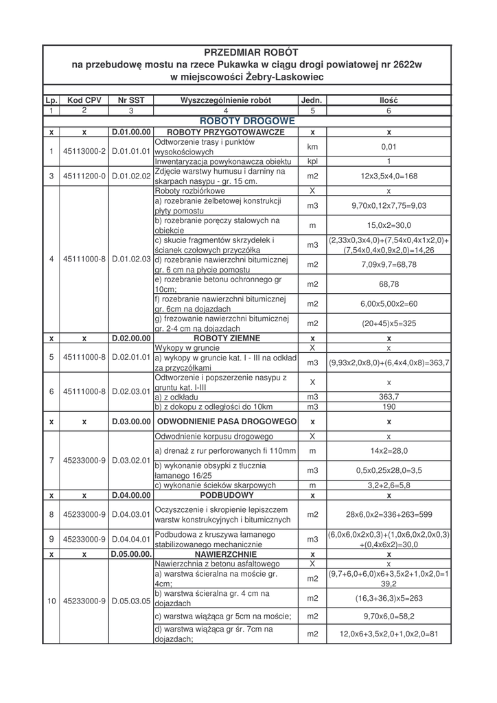 PRZEDMIAR ROBÓT na przebudow mostu na rzece Pukawka w ci gu drogi powiatowej nr 2622w w miejscowo ci ebry-Laskowiec Lp. 1 Kod CPV 2 Nr SST 3 Wyszczególnienie robót 4 Jedn. 5 x x D.01.00.00 ROBOTY PRZYGOTOWAWCZE Odtworzenie trasy i punktów wysoko ciowych Inwentaryzacja powykonawcza obiektu Zdj cie warstwy humusu i darniny na skarpach nasypu - gr. 15 cm. Roboty rozbiórkowe a) rozebranie elbetowej konstrukcji płyty pomostu b) rozebranie por czy stalowych na obiekcie c) skucie fragmentów skrzydełek i cianek czołowych przyczółka d) rozebranie nawierzchni bitumicznej gr. 6 cm na płycie pomostu e) rozebranie betonu ochronnego gr 10cm; f) rozebranie nawierzchni bitumicznej gr. 6cm na dojazdach g) frezowanie nawierzchni bitumicznej gr. 2-4 cm na dojazdach ROBOTY ZIEMNE Wykopy w gruncie a) wykopy w gruncie kat. I - III na odkład za przyczółkami Odtworzenie i popszerzenie nasypu z gruntu kat. I-III a) z odkładu b) z dokopu z odległo ci do 10km x x km 0,01 kpl 1 m2 12x3,5x4,0=168 X x m3 9,70x0,12x7,75=9,03 m 15,0x2=30,0 m3 (2,33x0,3x4,0)+(7,54x0,4x1x2,0)+ (7,54x0,4x0,9x2,0)=14,26 m2 7,09x9,7=68,78 m2 68,78 m2 6,00x5,00x2=60 m2 (20+45)x5=325 x X x x m3 (9,93x2,0x8,0)+(6,4x4,0x8)=363,7 X x m3 m3 363,7 190 x x Odwodnienie korpusu drogowego X x a) drena z rur perforowanych fi 110mm m 14x2=28,0 m3 0,5x0,25x28,0=3,5 m x 3,2+2,6=5,8 x m2 28x6,0x2=336+263=599 1 3 4 x 45113000-2 D.01.01.01 45111200-0 D.01.02.02 45111000-8 D.01.02.03 x D.02.00.00 5 45111000-8 D.02.01.01 6 45111000-8 D.02.03.01 x 7 x 8 x D.03.00.00 ODWODNIENIE PASA DROGOWEGO 45233000-9 D.03.02.01 x ROBOTY DROGOWE b) wykonanie obsypki z tłucznia łamanego 16/25 c) wykonanie cieków skarpowych D.04.00.00 PODBUDOWY 45233000-9 D.04.03.01 Oczyszczenie i skropienie lepiszczem warstw konstrukcyjnych i bitumicznych Podbudowa z kruszywa łamanego stabilizowanego mechanicznie x x D.05.00.00. NAWIERZCHNIE Nawierzchnia z betonu asfaltowego a) warstwa cieralna na mo cie gr. 4cm; b) warstwa cieralna gr. 4 cm na 10 45233000-9 D.05.03.05 dojazdach 9 45233000-9 D.04.04.01 c) warstwa wi ca gr 5cm na mo cie; d) warstwa wi dojazdach; ca gr r. 7cm na m3 x X m2 Ilo 6 (6,0x6,0x2x0,3)+(1,0x6,0x2,0x0,3) +(0,4x6x2)=30,0 x x (9,7+6,0+6,0)x6+3,5x2+1,0x2,0=1 39,2 m2 (16,3+36,3)x5=263 m2 9,70x6,0=58,2 m2 12,0x6+3,5x2,0+1,0x2,0=81 1 x 2 x 11 45112000-5 12 45112000-5 x x 13 45233000-9 14 45233000-9 x x 15 45233000-9 16 45233000-9 17 45233000-9 3 4 D.06.00.00 ROBOTY WYKO ROBOTY DROGOWE CZENIOWE Umocnienie powierzchniowe skarp D.06.01.01 nasypu i rowów przez humusowanie z obsianiem traw ; Umocnienie koryta rzeki podwójn D.06.01.02 kiszk faszynow fi 20cm URZ DZENIA BEZPIECZE STWA D.07.00.00 RUCHU Tymczasowa organizacja ruchu na czas D.07.03.01 robót. D.07.05.01 Stalowe bariery ochronne SP-09/D/2 D.08.00.00. ELEMENTY ULIC Kraw nik kamienny 30x20cm na D.08.01.01 dojazdach; Chodnik z kostki brukowej o grubo ci 8 D.08.02.02 cm na podsypce cementowo piaskowej gr 10cm; Obrze a betonowe chodnikowe 8 x 30 D.08.03.01 cm. 5 x 6 x m2 12,0x3,5x4+40,0x2,0x1=248 m 2x40=80 x x kpl 1,00 m x 20x4=80 x m 18,3x2,0=36,6 m2 9,0+9,0+2,3+2,3=22,6 m 3,5x2x2+5,5x4,0+1,6x2,0+0,6x2,0 +1,4x2,0+3,5x2,0=50,2 FUNDAMENTOWANIE Roboty ziemne przy fundamentowaniu a) wbicie grodzic stalowych G46 ZBROJENIE Zbrojenie betonu stal klasy A - IIIN (BSt 500S) a) poszerzenia przyczółka, skrzydełka, płaszcz przyczółka b) płyt przej ciowych c) płyty pomostu d) kap chodnikowych e) fundamentu oporu stozka BETON Beton klasy B 40 w deskowaniu: a) płyty pomostu b) kap chodnikowych Beton klasy B 30 w deskowaniu: a) poszerzenia przyczółka, skrzydełka, płaszcz przyczółka b) płyt przej ciowych x x m2 x x x 9,2x2,0x3,0+2,1x4,0x3,0=80,4 x X x kg 3416 kg kg kg kg x X m3 m3 X 1988 3486 575 305 x X 19,01 4,66 X m3 42,00 m3 c) fundamentu oporu sto ka m3 x X 4x0,3x6,94x2=16,65 (4,6x2+1,2x2+5,0x2+1,2x2)x0,24 =5,76 (3,7+0,44+0,23x0,1x6,94)x2+(4,6 x2+1,2x2+5,0x2+1,2x2)x0,1+(4x1 x2x0,1)+(0,4x2x4x0,1)=12,2 x X t 3,00 t 0,86 t 5,38 szt. 9x4=36 m2 (1,33x6x9,7)+(1,47x2x9,7)+(0,95x 4x7x0,966)=131,62 ROBOTY MOSTOWE x x M.11.00.00 18 45111000-8 M.11.01.01 x x M.12.00.00 19 45221000-2 M.12.01.01 x x M.13.00.00 20 45221000-2 M.13.01.01 Beton klasy B 10 pod płyty przej ciowe, 21 45221000-2 M.13.02.01 fundament oporu sto ka, schody, poszerzenia przyczółków x x M.14.00.00. KONSTRUKCJE STALOWE Konstrukcja stalowa ustroju no nego a) nowa konstrukcja stalowa d wigarów głównych ze stali S355J2G3 b) nowa konstrukcja stalowa 22 45221000-2 M.14.01.01. poprzecznic z ceownika C300 c) starou yteczna konstrukcja stalowa ustroju nios cego mostu - belki główne, (obróbka mechaniczna zgodnie z proj.) d) kotwy talerzowe ze stali St3S Oczyszczenie i zabezpieczenie konstrukcji stalowej ustroju nios cego 23 45221000-2 M.14.02.01. powłokami epoksydowopoliuretanowymi gr 320mikronów.; m3 1 X 2 3 M.15.00.00 4 ROBOTY X IZOLACJADROGOWE Izolacja powłokowa epoksydowo24 45221000-2 M.15.01.02 smołowa powierzchni stalowej cianek szczelnych Izolacje z papy termozgrzewalnej a) na płycie pomostu 25 45221000-2 M.15.02.03. b) na ciance zaplecznej i fragmencie płyty przej ciowej 5 X 6 x m2 80,4x2=160,8 X m2 x (9,7x1,75x2)x2+9,7x6=126,1 m2 0,37x2x7,5=5,6 Izolacja bitumiczna wykonana na zimno powierzchni bet. styku z gruntem; m2 (2,98x4)x2+(0,8+1,03+0,35)x7,54 x2+1,33x4=62,04 Uszczelnienie kitem trwale plastycznym 27 45221000-2 M.15.02.06 np. Laterbit BG 40x10mm styku nawierzchni z kraw nikiem m 9,7x2=19,4 X X m 10.46x2=20,92 m 16,12x2=32,24 m 6,94x2=19,88 m2 1,51x10,46+2,83x0,56x4+0,76x10 ,46=30,09 X szt. m X X x 4x2=8 8,45x2+6=14,45 x x szt. 8x2=16 X x m 6,40x2=12,8 m 1,50x2+0,75x2=4,5 X x m 9,7x2=19,4 m 16x4=64 X x m2 3,14x3,5x3,5=38,47 X x m2 m2 8,75x9,7=87,87 5,16x4+(0,4+1,8+0,72+0,46)x8,34 =48,83 0,17x3,2x4=2,18 X x 26 45221000-2 M.15.02.05. Uszczelnienie masa zalewow na gor co a) styk kapy chodnikowej z kraw nikiem 20x30mm 28 45221000-2 M.15.02.07. b) styk kapy chodnikowej z gzymsem polimerobetonowym 20x30mm c) szczelina pomi dzy p