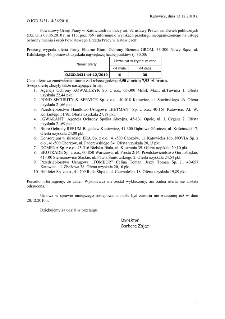 Katowice, dnia 13.12.2010 r. O.IGD.3431-14-36/2010 Powiatowy Urząd Pracy w Katowicach na mocy art. 92 ustawy Prawo zamówień publicznych (Dz. U. z 08.06.2010 r. nr 113, poz. 759) informuje o wynikach przetargu nieograniczonego na usługę ochrony mienia i osób Powiatowego Urzędu Pracy w Katowicach: Przetarg wygrała oferta firmy Elitarne Biuro Ochrony Biznesu GROM, 33-300 Nowy Sącz, ul. Kilińskiego 46, ponieważ uzyskała największą liczbę punktów tj. 30,00: Numer oferty O.IGD.3431-14-12/2010 Liczba pkt w kryterium cena Pkt małe Pkt duże 10 30 Cena ofertowa zamówienia: stawka za 1 roboczogodzinę: 6,50 zł netto; 7,93 zł brutto. Swoją ofertę złożyły także następujące firmy: 1. Agencja Ochrony KOWALCZYK Sp. z o.o., 05-300 Mińsk Maz., ul.Tuwima 1. Oferta uzyskała 22,44 pkt. 2. POND SECURITY & SERVICE Sp. z o.o., 40-018 Katowice, ul. Sowińskiego 46. Oferta uzyskała 21,66 pkt. 3. Przedsiębiorstwo Handlowo-Usługowe „HETMAN” Sp. z o.o., 40-161 Katowice, Al. W. Korfantego 51/9a. Oferta uzyskała 27,18 pkt. 4. „GWARANT” Agencja Ochrony Spółka Akcyjna, 45-131 Opole, ul. J. Cygana 2. Oferta uzyskała 21,69 pkt. 5. Biuro Ochrony RERUM Bogusław Kiesiewicz, 41-300 Dąbrowa Górnicza, ul. Kościuszki 17. Oferta uzyskała 24,00 pkt. 6. Konsorcjum w składzie: ERA Sp. z o.o., 41-500 Chorzów, ul. Katowicka 16b, NOVIA Sp. z o.o., 41-500 Chorzów, ul. Paderewskiego 34. Oferta uzyskała 20,13 pkt. 7. DOMENA Sp. z o.o., 43-316 Bielsko-Biała, ul. Kustronia 39. Oferta uzyskała 20,10 pkt. 8. EKOTRADE Sp. z o.o., 00-850 Warszawa, ul. Prosta 2/14. Przedstawicielstwo Górnośląskie: 41-100 Siemianowice Śląskie, ul. Pawła Śmiłowskiego 2. Oferta uzyskała 24,54 pkt. 9. Przedsiębiorstwo Usługowe „TOMBOR” Celina Toman, Jerzy Toman Sp. J., 40-657 Katowice, ul. Zbożowa 38. Oferta uzyskała 20,10 pkt. 10. Hellfeier Sp. z o.o., 41-709 Ruda Śląska, ul. Czarnoleśna 18. Oferta uzyskała 19,89 pkt. Ponadto informujemy, że żaden Wykonawca nie został wykluczony, ani żadna oferta nie została odrzucona. Umowa w sprawie niniejszego postępowania może być zawarta nie wcześniej niż w dniu 20.12.2010 r. Dziękujemy za udział w przetargu. Dyrektor Barbara Zając 1 Otrzymują: 1. 2. 3. 4. 5. 6. 7. 8. 9. 10. 11. 12. 13. POND SECURITY & SERVICE Sp. z o.o. 40-018 Katowice ul. Sowińskiego 46 Agencja Ochrony KOWALCZYK Sp. z o.o. 05-300 Mińsk Maz. ul.Tuwima 1 Elitarne Biuro Ochrony Biznesu GROM 33-300 Nowy Sącz ul. Kilińskiego 46 Przedsiębiorstwo Handlowo-Usługowe „HETMAN” Sp. z o.o. 40-161 Katowice Al. W. Korfantego 51/9a „GWARANT” Agencja Ochrony Spółka Akcyjna 45-131 Opole ul. J. Cygana 2 Biuro Ochrony RERUM Bogusław Kiesiewicz 41-300 Dąbrowa Górnicza ul. Kościuszki 17 Konsorcjium w składzie: ERA Sp. z o.o. i NOVIA Sp. z o.o. ERA Sp. z o.o. 41-500 Chorzów ul. Katowicka 16b DOMENA Sp. z o.o. 43-316 Bielsko-Biała ul. Kustronia 39 EKOTRADE Sp. z o.o. 00-850 Warszawa ul. Prosta 2/14. Przedstawicielstwo Górnośląskie: 41-100 Siemianowice Śląskie ul. Pawła Śmiłowskiego 2 Przedsiębiorstwo Usługowe „TOMBOR” Celina Toman, Jerzy Toman Sp. J. 40-657 Katowice ul. Zbożowa 38 Hellfeier Sp. z o.o. 41-709 Ruda Śląska ul. Czarnoleśna 18 Strona internetowa i tablica ogłoszeń PUP Katowice a/a 2