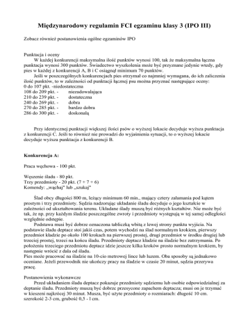 Międzynarodowy regulamin FCI egzaminu klasy 3 (IPO III) Zobacz również postanowienia ogólne egzaminów IPO Punktacja i oceny W każdej konkurencji maksymalna ilość punktów wynosi 100, tak że maksymalna łączna punktacja wynosi 300 punktów. Świadectwo wyszkolenia może być przyznane jedynie wtedy, gdy pies w każdej z konkurencji A, B i C osiągnął minimum 70 punktów. Jeśli w poszczególnych konkurencjach pies otrzymał co najmniej wymagana, do ich zaliczenia ilość punktów, to w zależności od punktacji łącznej psu można przyznać następujące oceny: 0 do 107 pkt. -niedostateczna 108 do 209 pkt. niezadowalająca 210 do 239 pkt. dostateczna 240 do 269 pkt. dobra 270 do 285 pkt. bardzo dobra 286 do 300 pkt. doskonalą Przy identycznej punktacji większej ilości psów o wyższej lokacie decyduje wyższa punktacja z konkurencji C. Jeśli to również nie prowadzi do wyjaśnienia sytuacji, to o wyższej lokacie decyduje wyższa punktacja z konkurencji B. Konkurencja A: Praca węchowa - 100 pkt. Węszenie śladu - 80 pkt. Trzy przedmioty - 20 pkt. (7 + 7 + 6) Komendy: „wąchaj" lub „szukaj" Ślad obcy długości 800 m, leżący minimum 60 min., mający cztery załamania pod kątem prostym i trzy przedmioty. Sędzia nadzorując układanie śladu decyduje o jego kształcie w zależności od ukształtowania terenu. Układane ślady muszą być różnych kształtów. Nie może być tak, że np. przy każdym śladzie poszczególne zwroty i przedmioty występują w tej samej odległości względnie odstępie. Podstawa musi być dobrze oznaczona tabliczką wbitą z lewej strony punktu wyjścia. Na podstawie śladu deptacz stoi jakiś czas, potem wychodzi na ślad normalnym krokiem, pierwszy przedmiot kładzie po około 100 krokach na pierwszej prostej, drugi przedmiot w środku drugiej lub trzeciej prostej, trzeci na końcu śladu. Przedmioty deptacz kładzie na śladzie bez zatrzymania. Po położeniu trzeciego przedmiotu deptacz idzie jeszcze kilka kroków prosto normalnym krokiem, by następnie wrócić z dala od śladu. Pies może pracować na śladzie na 10-cio metrowej lince lub luzem. Oba sposoby są jednakowo oceniane. Jeżeli przewodnik nie ukończy pracy na śladzie w czasie 20 minut, sędzia przerywa pracę. Postanowienia wykonawcze Przed układaniem śladu deptacz pokazuje przedmioty sędziemu lub osobie odpowiedzialnej za deptanie śladu. Przedmioty muszą być dobrzc przesycone zapachem dcptacza; musi on je trzymać w kieszeni najkrócej 30 minut. Musza, być użyte przedmioty o rozmiarach: długość 10 cm. szerokość 2-3 cm, grubość 0,5 - l cm. Wszystkie przedmioty należy oznaczyć numerami startowymi śladu, na klórym będą. kładzione. Przewodnik z psem nie mogą obserwować układania śladu. Dla zachowania jednolitości zapachu na śladzie deptacz nie może zatrzymywać się, szurać nogami, a przedmioty powinien kłaść na samej ścieżce śladu, a nic obok. W międzyczasie przewodnik przygotowuje psa do pracy na śladzie. Po wywołaniu do śladu przewodnik melduje się u sędziego z psem gotowym do pracy węchowej i zgłasza sposób zachowania się psa na przedmiotach - podejmuje czy oznacza. Połączenie tych dwóch sposobów jest błędem. Na znak sędziego pies jest powoli i spokojnie doprowadzany do podstawy śladu wypuszczany na ślad. Przed pracą na śladzie, w czasie nawęszenia i pracy, należy unikać przymusu. Na podstawie śladu należy dać psu dostateczną ilość czasu na nawęszenie zapachu. Należy unikać wszystkiego, co wywoła u psa nadmierne pobudzenie i szturmową pracę na śladzie. Pies ma pracować na śladzie powoli, z nosem przy ziemi. Gdy pies wyjdzie na ślad, przewodnik stoi w miejscu wypuszczając stopniowo luźną linkę aż do odejścia psa na odległość 10 m. W czasie pracy na śladzie przewodnik zachowuje odległość 10 m również wtedy, gdy pies pracuje luzem. Jeśli przewodnik przy znalezieniu przedmiotu nie wypuszcza linki z ręki, to musi ona zwisać swobodnie. Gdy pies znajdzie przedmiot, musi go bez pomocy przewodnika natychmiast zaznaczyć lub podjąć. Przy podejmowaniu przedmiotu pies może stać, usiąść lub przyjść do przewodnika. Jakiekolwiek wyjście z przedmiotem w przód, jak również podejmowanie przedmiotu przy warowaniu, jest błędne. Pies może zaznaczać przedmioty warując, siedząc lub stojąc. Po znalezieniu przez psa przedmiotu, przewodnik kładzie linkę na ziemię i idzie natychmiast do psa. Znaleziony przedmiot pokazuje sędziemu podnosząc go w ręce do góry. Od tego punktu przewodnik kontynuuje ze swoim psem pracę na śladzie, postępując podobnie jak przy wyjściu z podstawy śladu. Po ukończeniu pracy na śladzie należy okazać znalezione przedmioty sędziemu. Dozwolone jest, aby przewodnik udał się w kierunku psa, który podjął przedmiot. Błędem jest wyjście psa w przód z podjętym przedmiotem. Linka ma być przymocowana do szorek lub łańcuszka. Możliwość pracy bez linki zostaje zachowana. Używanie dodatkowych rzemieni jest zabronione. Sposób prowadzenia linki pozostawia się przewodnikowi. Obwąchiwanie tabliczki oznaczającej podstawę śladu nie jest błędem. Jeżeli przewodnik oddali się od śladu na odległość przekraczającą maksymalną długość linki, następuje przerwanie pracy na śladzie. Jeżeli pies opuści linię śladu i jest wstrzymywany przez przewodnika, sędzia nakazuje przewodnikowi podążać za psem. Przy powtórnym tego typu zdarzeniu następuje przerwanie pracy na śladzie. Ocena Złe nawęszenie, niepokój (zabawa), częste krążenie na załamaniach, nieustanne zachęcanie, nieczyste podjęcie lub zaznaczenie oraz upuszczenie przedmiotu będą karane odjęciem do 4 punktów karnych. Powtórne nawęszenie podstawy śladu, silny niepokój, węszenie górnym wiatrem, praca szturmowa, załatwianie się, węszenie za myszami itp. dają w następstwie odjęcie do 8 punktów karnych. Za źle podjęty lub zaznaczony przedmiot