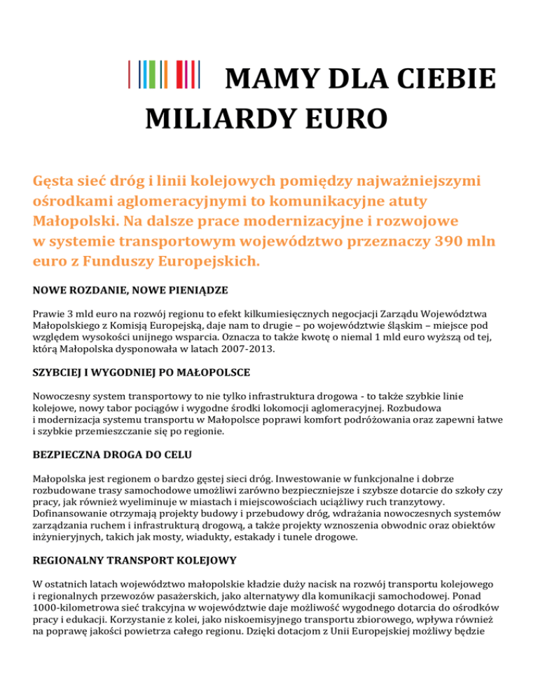 MAMY DLA CIEBIE MILIARDY EURO Gęsta sieć dróg i linii kolejowych pomiędzy najważniejszymi ośrodkami aglomeracyjnymi to komunikacyjne atuty Małopolski. Na dalsze prace modernizacyjne i rozwojowe w systemie transportowym województwo przeznaczy 390 mln euro z Funduszy Europejskich. NOWE ROZDANIE, NOWE PIENIĄDZE Prawie 3 mld euro na rozwój regionu to efekt kilkumiesięcznych negocjacji Zarządu Województwa Małopolskiego z Komisją Europejską, daje nam to drugie – po województwie śląskim – miejsce pod względem wysokości unijnego wsparcia. Oznacza to także kwotę o niemal 1 mld euro wyższą od tej, którą Małopolska dysponowała w latach 2007-2013. SZYBCIEJ I WYGODNIEJ PO MAŁOPOLSCE Nowoczesny system transportowy to nie tylko infrastruktura drogowa - to także szybkie linie kolejowe, nowy tabor pociągów i wygodne środki lokomocji aglomeracyjnej. Rozbudowa i modernizacja systemu transportu w Małopolsce poprawi komfort podróżowania oraz zapewni łatwe i szybkie przemieszczanie się po regionie. BEZPIECZNA DROGA DO CELU Małopolska jest regionem o bardzo gęstej sieci dróg. Inwestowanie w funkcjonalne i dobrze rozbudowane trasy samochodowe umożliwi zarówno bezpieczniejsze i szybsze dotarcie do szkoły czy pracy, jak również wyeliminuje w miastach i miejscowościach uciążliwy ruch tranzytowy. Dofinansowanie otrzymają projekty budowy i przebudowy dróg, wdrażania nowoczesnych systemów zarządzania ruchem i infrastrukturą drogową, a także projekty wznoszenia obwodnic oraz obiektów inżynieryjnych, takich jak mosty, wiadukty, estakady i tunele drogowe. REGIONALNY TRANSPORT KOLEJOWY W ostatnich latach województwo małopolskie kładzie duży nacisk na rozwój transportu kolejowego i regionalnych przewozów pasażerskich, jako alternatywy dla komunikacji samochodowej. Ponad 1000-kilometrowa sieć trakcyjna w województwie daje możliwość wygodnego dotarcia do ośrodków pracy i edukacji. Korzystanie z kolei, jako niskoemisyjnego transportu zbiorowego, wpływa również na poprawę jakości powietrza całego regionu. Dzięki dotacjom z Unii Europejskiej możliwy będzie zakup nowych pociągów, modernizacja linii kolejowych oraz zapewnienie niezbędnej infrastruktury służącej obsłudze podróżnych. KTO MOŻE UBIEGAĆ SIĘ O DOFINANSOWANIE? Projekty mogą składać m.in.: jednostki samorządu terytorialnego jednostki organizacyjne JST Koleje Małopolskie Sp. z o.o. PKP PLK S.A. GDZIE SZUKAĆ INFORMACJI? Urząd Marszałkowski Województwa Małopolskiego - Punkty Informacyjne Funduszy Europejskich: Kraków, ul. Wielicka 72B, tel. (12) 616 0 616, e-mail: [email protected]; Chrzanów, ul. Grunwaldzka 5, tel. (32) 627 23 10; Nowy Sącz, ul. Wazów 3, tel. (18) 442 25 78; Nowy Targ, al. 1000-lecia 35, tel. (18) 540 90 32; Tarnów, ul. Wałowa 37, tel. (14) 628 88 12 Pytaj o: priorytet VII. „Infrastruktura transportowa” Regionalnego Programu Operacyjnego Województwa Małopolskiego na lata 2014-2020 Bądź na bieżąco: www.fundusze.malopolska.pl Funpage na Facebooku: FUNDUSZE EUROPEJSKIE DLA MAŁOPOLSKI
