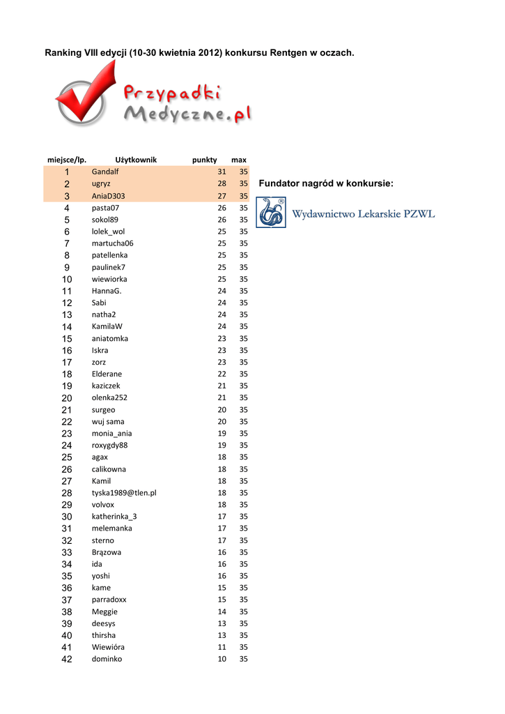 Ranking VIII edycji (10-30 kwietnia 2012) konkursu Rentgen w oczach. miejsce/lp. 1 2 3 4 5 6 7 8 9 10 11 12 13 14 15 16 17 18 19 20 21 22 23 24 25 26 27 28 29 30 31 32 33 34 35 36 37 38 39 40 41 42 Użytkownik Gandalf ugryz AniaD303 pasta07 sokol89 lolek_wol martucha06 patellenka paulinek7 wiewiorka HannaG. Sabi natha2 KamilaW aniatomka Iskra zorz Elderane kaziczek olenka252 surgeo wuj sama monia_ania roxygdy88 agax calikowna Kamil [email protected] volvox katherinka_3 melemanka sterno Brązowa ida yoshi kame parradoxx Meggie deesys thirsha Wiewióra dominko punkty 31 28 27 26 26 25 25 25 25 25 24 24 24 24 23 23 23 22 21 21 20 20 19 19 18 18 18 18 18 17 17 17 16 16 16 15 15 14 13 13 11 10 max 35 35 35 35 35 35 35 35 35 35 35 35 35 35 35 35 35 35 35 35 35 35 35 35 35 35 35 35 35 35 35 35 35 35 35 35 35 35 35 35 35 35 Fundator nagród w konkursie: 43 44 45 46 47 dofi gpszkit taka_ja kuciur Robertos 8 8 8 6 6 35 35 35 35 35 Punkty, które zostaną doliczone do Rankingu Mistrzów (suma z Etapu 1. i 2.) miejsce/lp. 1 2 3 4 5 6 7 8 9 10 11 12 13 14 15 16 17 18 19 20 21 22 23 24 25 26 27 28 29 30 31 32 33 34 35 36 Użytkownik Gandalf ugryz sokol89 aniatomka HannaG. wiewiorka AniaD303 pasta07 paulinek7 Iskra olenka252 patellenka Sabi KamilaW lolek_wol martucha06 Elderane natha2 volvox wuj sama zorz calikowna kaziczek surgeo kame monia_ania katherinka_3 roxygdy88 [email protected] agax Brązowa Kamil parradoxx sterno melemanka ida punkty 50 46 44 42 42 42 41 41 41 40 40 40 40 40 39 39 38 38 37 37 37 35 35 35 34 34 33 33 33 32 32 32 32 32 31 30 Fundator nagrody specjalnej w Rankingu Mistrzów: COMVIDEO.pl 37 38 39 40 41 42 43 44 45 46 47 48 49 50 51 52 53 54 55 56 57 58 59 60 61 62 63 64 65 66 67 68 69 70 71 72 73 74 75 76 77 78 79 80 81 82 83 84 85 86 87 88 Meggie yoshi deesys thirsha Wiewióra dominko taka_ja gpszkit dofi Robertos kuciur czekajka lands zorg EliSa anetQs cathrinax eakz Ewa Szczerba Ewik izulkka Olm palmtopik zoobear anitex anka1508 DonWasyl Jolakra kadaweryna koala Limaks maciejk Asik dorcik edyta evelyn88 kasiai7 Madzia_wu marcin87 martenko maya1112 omega stefadr velo wodzuprowadz Zajonc arachnea milejdi signet kalika88 MarWoz karla 30 30 29 29 27 26 24 23 22 21 20 19 18 18 17 16 16 16 16 16 16 16 16 16 15 15 15 15 15 15 15 15 14 14 14 14 14 14 14 14 14 14 14 14 14 14 13 13 13 13 13 13 89 90 91 92 93 94 95 96 97 98 99 100 101 102 103 104 105 106 107 108 109 110 111 112 113 114 115 116 117 118 119 120 121 122 123 124 125 126 127 128 129 130 131 132 133 134 135 136 137 138 139 140 MagdaLenak slipknota libertador parolena Neuromania marcia erytrocyt luintinwe Klaudyna ansinus obadebeq atma1987 d.m Jarko esdo waszka yanina ratowniczka em_ilka squi sochapawel97 Slayer1990 mmaja ciasteczkowy bawolek monia168 KZalewska Maryla sorry_gregory babel113 blondi kyriakos panda0000 alert-cooperative doktorek89 gusia0311 kinga1412 kasiula sloma18 monifly Nszo Czi dorota.w Nienor kasiul Jesiotr hgiii pcogito emg Skretek netia tucha monamm 13 13 13 13 13 13 13 13 13 13 13 13 13 13 13 13 13 13 12 12 12 12 12 12 12 12 12 12 12 12 12 12 12 12 12 12 12 12 12 12 12 12 11 11 11 11 11 11 11 11 11 11 141 142 143 144 145 146 147 148 149 150 151 152 153 154 155 156 157 158 159 160 161 162 163 164 165 166 167 168 169 170 171 172 173 174 175 176 177 178 179 180 181 182 183 184 185 186 187 188 189 190 191 192 sleed gorylislaw gosia.ef Soleado skakun Magda amadeus.wro Mnichu Kubarro maxgr pielęgniarz Madllen magdalenna student21 potas00 Medico szczurek hagda durchli krol Madziolek coryne liquel meris hawa grzegorzsla bakelit Scurto asia51288 iwoneczka pawel_lyszczak 12olusia forte Marg alioko mducek Anaylil barra patrycja_faryno Piotrr cypuś Tinkerbell harrachovowa lekinspe dudbar adak antonio xavery Star-witness lolcia ahilless aga123 11 11 11 11 11 11 11 11 11 11 11 11 11 11 11 11 11 11 11 11 10 10 10 10 10 10 10 10 10 10 10 10 10 10 10 10 10 10 10 10 10 10 10 10 10 10 10 10 9 9 9 9 193 194 195 196 197 198 199 200 201 202 203 204 205 206 207 208 209 210 211 212 213 214 215 216 217 218 219 220 221 222 223 224 225 226 227 228 229 230 231 232 233 234 235 236 237 238 239 240 241 242 243 244 l_michael_l nodyna gremlin kawa88 osa_88 karolinawgw donka_ona loopfer koniczyna etymk inez Sza paciorella Aragorn ivell kalina_85 hushe ciucia3 Marrta konk Vaylen madziab54 djqlka botten antecki266 soloo student Vanellus radox duga Autsajder krola504 anestetyk Monika6 ekle j.kociolek krypton555 MartaM Aszyn goHa rys olka_strepto mmm Cichy filippo03 amagdaa a.witkowska lamblia johnson annnna dorin90 Tany8nyT 9 9 9 9 9 9 9 9 9 9 9 9 9 9 9 9 9 9 9 9 9 9 9 9 9 8 8 8 8 8 8 8 8 8 8 8 8 8 8 8 8 8 8 8 7 7 7 7 7 7 7 7 245 246 247 248 249 250 251 252 253 254 255 256 257 258 259 260 261 262 263 264 265 266 267 268 269 270 271 272 273 274 275 276 277 278 279 280 281 282 283 284 takapanda Dzast Paulina katr22 m3chal catty Agnieszka Glamowska anuka karolina720 AsiulaS magochaa Gumolit Nagareboshi m.stusinska nya1 annnn ratatus7 piosty madzialenaaa_18 alch1 majka89 iwona1982 necia teofila czlowiecz kaskawlo Rafcook fiolasrpk czupakabra gucio926 Alex amigeo1 czornydanio90 Aneta89 Ramzey ciekawska.dusza rames_k Mateusz Stolarz aaaa6 solupred-oro 7 7 7 7 7 7 7 7 6 6 6 6 6 6 6 6 6 5 5 5 5 5 5 5 5 5 5 4 4 4 4 3 3 3 3 2 2 1 1 1