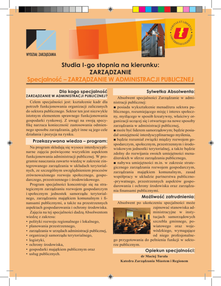 Studia I-go stopnia na kierunku: ZARZĄDZANIE Specjalność – ZARZĄDZANIE W ADMINISTRACJI PUBLICZNEJ Dla kogo specjalność ZARZĄDZANIE W ADMINISTRACJI PUBLICZNEJ? Celem specjalności jest: kształcenie kadr dla potrzeb funkcjonowania organizacji zaliczanych do sektora publicznego. Sektor ten jest niezwykle istotnym elementem sprawnego funkcjonowania gospodarki rynkowej. Z uwagi na swoją specyfikę narzuca konieczność zastosowania odmiennego sposobu zarządzania, gdyż inne są jego cele działania i pozycja na rynku. Przekazywana wiedza – program: Na program składają się wysoce interdyscyplinarne zajęcia poświęcone wszystkim aspektom funkcjonowania administracji publicznej. W programie nauczania zawarto wiedzę w zakresie zintegrowanego zarządzania w układach terytorialnych, ze szczególnym uwzględnieniem procesów zrównoważonego rozwoju społecznego, gospodarczego, przestrzennego i środowiskowego. Program specjalności koncentruje się na strategicznym zarządzaniu rozwojem gospodarczym i społecznym jednostek samorządu terytorialnego, zarządzaniu majątkiem komunalnym i finansami publicznymi, a także na przestrzennych aspektach gospodarowania i ochrony środowiska. Zajęcia na tej specjalności dadzą Absolwentom wiedzę z zakresu: • polityki rozwoju regionalnego i lokalnego, • planowania przestrzennego, • zarządzania w urzędach administracji publicznej, • organizacji samorządu terytorialnego, • logistyki, • ochrony środowiska, • gospodarki majątkiem publicznym oraz • usług publicznych. Sylwetka Absolwenta: Absolwent specjalności Zarządzanie w administracji publicznej: ■ posiada wykształcenie menadżera sektora publicznego, rozumiejącego misję i interes społeczny, myślącego w sposób kreatywny, właściwy organizacji uczącej się i otwartego na nowe sposoby zarządzania w administracji publicznej, ■ może być liderem samorządowym; będzie posiadał umiejętność interdyscyplinarnego myślenia, ■ będzie rozumiał związki między rozwojem gospodarczym, społecznym, przestrzennym i środowiskowym jednostki terytorialnej, a także będzie zdolny do rozwijania swoich umiejętności menadżerskich w sferze zarządzania publicznego, ■ nabywa umiejętności m.in. w zakresie strategicznego zarządzania rozwojem gospodarczym, zarządzania majątkiem komunalnym, zasad współpracy w układzie partnerstwa publiczno-prywatnego, przestrzennych aspektów gospodarowania i ochrony środowiska oraz zarządzania finansami publicznymi. Możliwość zatrudnienia: Absolwent po ukończeniu specjalności może zajmować stanowiska administracyjne w instytucjach samorządowych szczebla gminnego, powiatowego oraz wojewódzkiego, wymagające od niego profesjonalnego przygotowania do pełnienia funkcji w sektorze publicznym. Opiekun specjalności: dr Maciej Turała Katedra Zarządzania Miastem i Regionem Moduły specjalizacyjne Moduł obowiązkowy E/AP Podstawy funkcjonowania administracji publicznej • Finanse publiczne • Samorząd terytorialny • Polityka społeczna • Rachunek społeczno-ekonomiczny • Podmioty użyteczności publicznej • Organizacje pozarządowe • Kadry w administracji publicznej Opiekun: dr Maciej Turała Katedra Zarządzania Miastem i Regionem Moduły specjalizacyjne do wyboru Moduł specjalizacyjny F1/AP Zarządzanie w sektorze administracji publicznej • Organizacja i zarządzanie oświatą • Zarządzanie ochroną zdrowia • Fundusze strukturalne • Zarządzanie jakością w jednostkach administracji publicznej • E-gmina • Zarządzanie środowiskowe • Zarządzanie w obszarze: kultura, sport, rekreacja • System pomocy społecznej Opiekun: dr Maciej Turała Katedra Zarządzania Miastem i Regionem Moduł specjalizacyjny F2/AP Zarządzanie miastem • Logistyka miejska • Infrastruktura miejska • Gospodarka gruntami • Socjologia miasta • Marketing terytorialny • Ekonomika miasta • Gospodarka mieszkaniowa • Infrastruktura społeczna Opiekun: dr Maciej Turała Katedra Zarządzania Miastem i Regionem