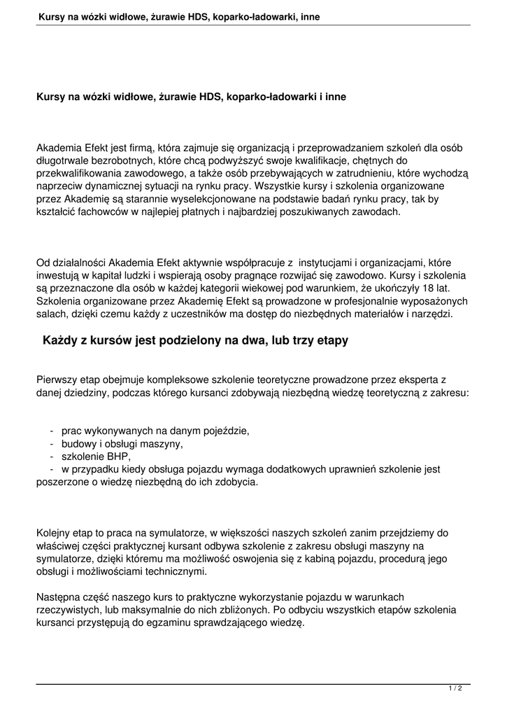Kursy na wózki widłowe, żurawie HDS, koparko-ładowarki, inne Kursy na wózki widłowe, żurawie HDS, koparko-ładowarki i inne Akademia Efekt jest firmą, która zajmuje się organizacją i przeprowadzaniem szkoleń dla osób długotrwale bezrobotnych, które chcą podwyższyć swoje kwalifikacje, chętnych do przekwalifikowania zawodowego, a także osób przebywających w zatrudnieniu, które wychodzą naprzeciw dynamicznej sytuacji na rynku pracy. Wszystkie kursy i szkolenia organizowane przez Akademię są starannie wyselekcjonowane na podstawie badań rynku pracy, tak by kształcić fachowców w najlepiej płatnych i najbardziej poszukiwanych zawodach. Od działalności Akademia Efekt aktywnie współpracuje z instytucjami i organizacjami, które inwestują w kapitał ludzki i wspierają osoby pragnące rozwijać się zawodowo. Kursy i szkolenia są przeznaczone dla osób w każdej kategorii wiekowej pod warunkiem, że ukończyły 18 lat. Szkolenia organizowane przez Akademię Efekt są prowadzone w profesjonalnie wyposażonych salach, dzięki czemu każdy z uczestników ma dostęp do niezbędnych materiałów i narzędzi. Każdy z kursów jest podzielony na dwa, lub trzy etapy Pierwszy etap obejmuje kompleksowe szkolenie teoretyczne prowadzone przez eksperta z danej dziedziny, podczas którego kursanci zdobywają niezbędną wiedzę teoretyczną z zakresu: - prac wykonywanych na danym pojeździe, - budowy i obsługi maszyny, - szkolenie BHP, - w przypadku kiedy obsługa pojazdu wymaga dodatkowych uprawnień szkolenie jest poszerzone o wiedzę niezbędną do ich zdobycia. Kolejny etap to praca na symulatorze, w większości naszych szkoleń zanim przejdziemy do właściwej części praktycznej kursant odbywa szkolenie z zakresu obsługi maszyny na symulatorze, dzięki któremu ma możliwość oswojenia się z kabiną pojazdu, procedurą jego obsługi i możliwościami technicznymi. Następna część naszego kurs to praktyczne wykorzystanie pojazdu w warunkach rzeczywistych, lub maksymalnie do nich zbliżonych. Po odbyciu wszystkich etapów szkolenia kursanci przystępują do egzaminu sprawdzającego wiedzę. 1/2 Kursy na wózki widłowe, żurawie HDS, koparko-ładowarki, inne Najpopularniejsze kursy Kursy zawodowe, które cieszą się największą popularnością wśród osób chętnych do przekwalifikowania się to: - kurs wózków widłowych kurs koparko-ładowarki kurs podestów ruchomych kurs HDS żurawi Akademia Efekt jest jednym z niewielu ośrodków szkoleniowych, który nie wydaje uprawnień przyszłym operatom bez egzaminu. Dlatego absolwenci kursów Akademii bez problemu znajdują zatrudnienie już w pierwszym miesiącu po zakończonym szkoleniu. 2/2