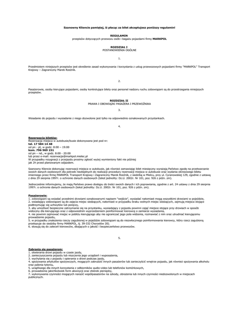 Szanowny Kliencie pamiętaj, iż płacąc za bilet akceptujesz poniższy regulamin! REGULAMIN przepisów dotyczących przewozu osób i bagażu pojazdami firmy MARKPOL ROZDZIAŁ I POSTANOWIENIA OGÓLNE 1. Przedmiotem niniejszych przepisów jest określenie zasad wykonywania i korzystania z usług przewozowych pojazdami firmy "MARKPOL" Transport Krajowy – Zagraniczny Marek Rzeźnik. 2. Pasażerowie, osoby kierujące pojazdami, osoby kontrolujące bilety oraz personel nadzoru ruchu zobowiązani są do przestrzegania niniejszych przepisów. ROZDZIAŁ II PRAWA I OBOWIĄZKI PASAŻERA I PRZEWOŹNIKA 3. Wsiadanie do pojazdu i wysiadanie z niego dozwolone jest tylko na odpowiednio oznakowanych przystankach. 4. Rezerwacja biletów: Rezerwacja miejsca w autobusie/busie dokonywana jest pod nr: tel. 17 584 14 48 od pn - pt, w godz: 8:00 – 19:00 kom. 796 969 151 od pn – nd., w godz. 8:00 - 20:00 lub przez e-mail: [email protected] W przypadku rezygnacji z przejazdu prosimy zgłosić wyżej wymieniony fakt nie później jak 2h przed planowanym odjazdem. Szanowny Kliencie dokonując rezerwacji miejsca w autobusie, jak również zamawiając bilet miesięczny wyrażają Państwo zgodę na przetwarzanie swoich danych osobowych dla potrzeb niezbędnych do realizacji procedury rezerwacji miejsca w autobusie oraz wydania okresowego biletu imiennego przez firmę MARKPOL Transport Krajowy i Zagraniczny Marek Rzeźnik, z siedzibą w Mielcu, przy ul. Cyranowskiej 129, zgodnie z ustawą z dnia 29 sierpnia 1997r. o ochronie danych osobowych (tekst jednolity: Dz.U. 2002r. Nr 101, poz. 926 z późn. zm). Jednocześnie informujemy, że mają Państwo prawo dostępu do treści swoich danych i ich poprawiania, zgodnie z art. 24 ustawy z dnia 29 sierpnia 1997r. o ochronie danych osobowych (tekst jednolity: Dz.U. 2002r. Nr 101, poz. 926 z późn. zm). Pasażerowie: 1. zobowiązani są wsiadać przednimi drzwiami oznakowanymi napisem "wejście", wysiadać natomiast mogą wszystkimi drzwiami w pojeździe, 2. wsiadający zobowiązani są do zajęcia miejsc siedzących, natomiast w przypadku braku wolnych miejsc siedzących, zajmują miejsca stojące podtrzymując się uchwytów lub poręczy, 3. aby umożliwić bezpieczne zatrzymanie się na przystanku, wysiadający z pojazdu powinni zająć miejsce stojące przy drzwiach w sposób widoczny dla kierującego oraz z odpowiednim wyprzedzeniem poinformować kierowcę o zamiarze wysiadania, 4. nie powinni zajmować miejsc w pobliżu kierującego aby nie ograniczać jego pola widzenia, rozmawiać z nim oraz utrudniać kierującemu prowadzenie pojazdu, 5. w przypadku znalezienia rzeczy zagubionej w pojeździe zobowiązani są do niezwłocznego poinformowania kierowcy, który rzecz zagubioną przekazuje do siedziby firmy MARKPOL, tj. 39-332 Chorzelów 20). 6. stosują się do zaleceń kierowców, dbających o jakość i bezpieczeństwo przewozów. 5. Zabrania się pasażerom: 1. otwierania drzwi pojazdu w czasie jazdy, 2. zanieczyszczenia pojazdu lub niszczenia jego urządzeń i wyposażenia, 3. wychylania się z pojazdu i opierania o drzwi podczas jazdy, 4. spożywania artykułów spożywczych, mogących zabrudzić innych pasażerów lub zanieczyścić wnętrze pojazdu, jak również spożywania alkoholu oraz palenia tytoniu, 5. uciążliwego dla innych korzystania z odbiorników audio-video lub telefonów komórkowych, 6. prowadzenia jakichkolwiek form akwizycji oraz zbiórek pieniędzy, 7. wykonywania czynności mogących narazić współpasażerów na szkody, obrażenia lub innych czynności niedozwolonych w miejscach publicznych. 6. Kierujący pojazdem: 1. zobowiązany jest do obsługi Klienta z pełnym zachowaniem kultury osobistej, 2. zobowiązany jest do sprzedaży biletów jednorazowych zgodnie z cennikiem przewoźnika, przy czym bilet każdorazowo wręcza pasażerowi , 3. odmawia sprzedaży biletu osobom nietrzeźwym, mogącym zabrudzić innych pasażerów, osobom agresywnym oraz osobom potencjalnie uciążliwym dla innych pasażerów, 4. może wezwać Policję celem interwencji lub zjechać z trasy przejazdu do najbliższego komisariatu Policji, 5. uprawniony jest do dokonywania czynności kontrolnych i dyscyplinujących wobec pasażerów nie posiadających biletu lub uciążliwych dla innych pasażerów, 6. uprawniony jest do wyprowadzenia z pojazdu pasażerów o których mowa w ust.5, 7. nie odpowiada za opóźnienia pojazdu spowodowane ruchem ulicznym, wypadkami na drodze, warunkami pogodowymi itp. ROZDZIAŁ III ODPOWIEDZIALNOŚĆ ZA SZKODY 7. 1. Pasażer odpowiada za spowodowane z własnej winy uszkodzenia pojazdu lub urządzeń komunikacyjnych, 2. Za zmianę trasy przejazdu lub jego niezasadne zatrzymanie pasażer zobowiązany jest uiścić opłatę dodatkową w wysokości 100 zł. 8. 1. Przewoźnik nie ponosi odpowiedzialności za szkody przez niego nie zawinione, 2. Przewoźnik odpowiada za szkody z zastrzeżeniem ust.1, poniesione przez pasażerów, a wynikające ze stanu technicznego pojazdów. Pasażer zobowiązany jest wówczas zgłosić kierującemu fakt powstania szkody w tym pojeździe. ROZDZIAŁ IV PRZEWÓZ BAGAŻU, PRZESYŁEK I ZWIERZĄT 9. 1. Pasażerowie mogą (za zgodą kierowcy) przewozić w pojazdach zwierzęta trzymane na rękach oraz bagaż podręczny, jeżeli istnieje możliwość umieszczenia go w pojeździe tak, aby nie utrudniał przejścia i nie naraził na zanieczyszczenie odzieży innych pasażerów, nie zagrażał bezpieczeństwu ruchu. 2. Dla przewożonego psa podróżny zobowiązany jest nałożyć kaganiec. 3. Opłacie nie podlegają: - przedmioty stanowiące bagaż podręczny, - zwierzęta trzymane na rękach, - wózki inwalidzkie, wózki dziecięce - złożone, 4. Nadzór nad bagażem ręcznym i zwierzętami, które pasażer przewozi przy sobie w pojeździe należy do pasażera. 5. Przewoźnik nie odpowiada za bagaż znajdujący się w autobusie i lukach bagażowych . 6. Bagaż znajdujący sie w lukach bagażowych autobusu wydawany