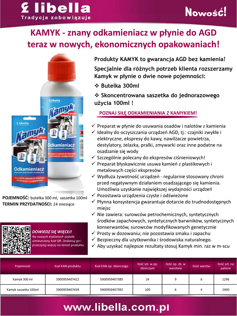 KAMYK - znany odkamieniacz w płynie do AGD teraz w nowych, ekonomicznych opakowaniach! Produkty KAMYK to gwarancja AGD bez kamienia! Specjalnie dla różnych potrzeb klienta rozszerzamy Kamyk w płynie o dwie nowe pojemności: Butelka 300ml Skoncentrowana saszetka do jednorazowego użycia 100ml ! POZNAJ SIŁĘ ODKAMIENIANIA Z KAMYKIEM! Preparat w płynie do usuwania osadów i nalotów z kamienia Idealny do oczyszczania urządzeń AGD, tj.: czajniki zwykłe i elektryczne, ekspresy do kawy, nawilżacze powietrza, destylatory, żelazka, pralki, zmywarki oraz inne podatne na osadzanie się wody Szczególnie polecany do ekspresów ciśnieniowych! Preparat błyskawicznie usuwa kamień z plastikowych i metalowych części ekspresów Wydłuża żywotność urządzeń - regularnie stosowany chroni przed negatywnym działaniem osadzającego się kamienia. Umożliwia uzyskanie największej wydajności urządzeń POJEMNOŚĆ: butelka 300 ml, saszetka 100ml Pozostawia urządzenia czyste i odświeżone Płynna konsystencja gwarantuje dotarcie do trudnodostępnych TERMIN PRZYDATNOŚCI: 24 miesiące miejsc Nie zawiera: surowców petrochemicznych, syntetycznych DOWIEDZ SIĘ WIĘCEJ! środków zapachowych, syntetycznych barwników, syntetycznych Na nowych etykietach została konserwantów, surowców modyfikowanych genetycznie umieszczony kod QR. DOWIEDZ SIĘ WIĘCEJ! Prosty w dozowaniu; nie pozostawia smaku i zapachu Zeskanuj goetykietach i przeczytaj Na nowych została Bezpieczny dla użytkownika i środowiska naturalnego. umieszczony kod QR. Zeskanuj go i więcej na temat produktu. przeczytaj więcej na temat produktu. Aby uzyskać najlepsze rezultaty stosuj Kamyk min. raz w m-scu Pojemność Kod EAN produktu Kod EAN op. zbiorczego Ilość szt. w op. zbiorczym Ilość op. zb. w warstwie Ilość warstw Ilość szt. na palecie Kamyk 300 ml 5900959407422 5900959407385 24 9 6 1296 Kamyk saszetka 100ml 5900959407439 5900959407392 100 6 4 2400