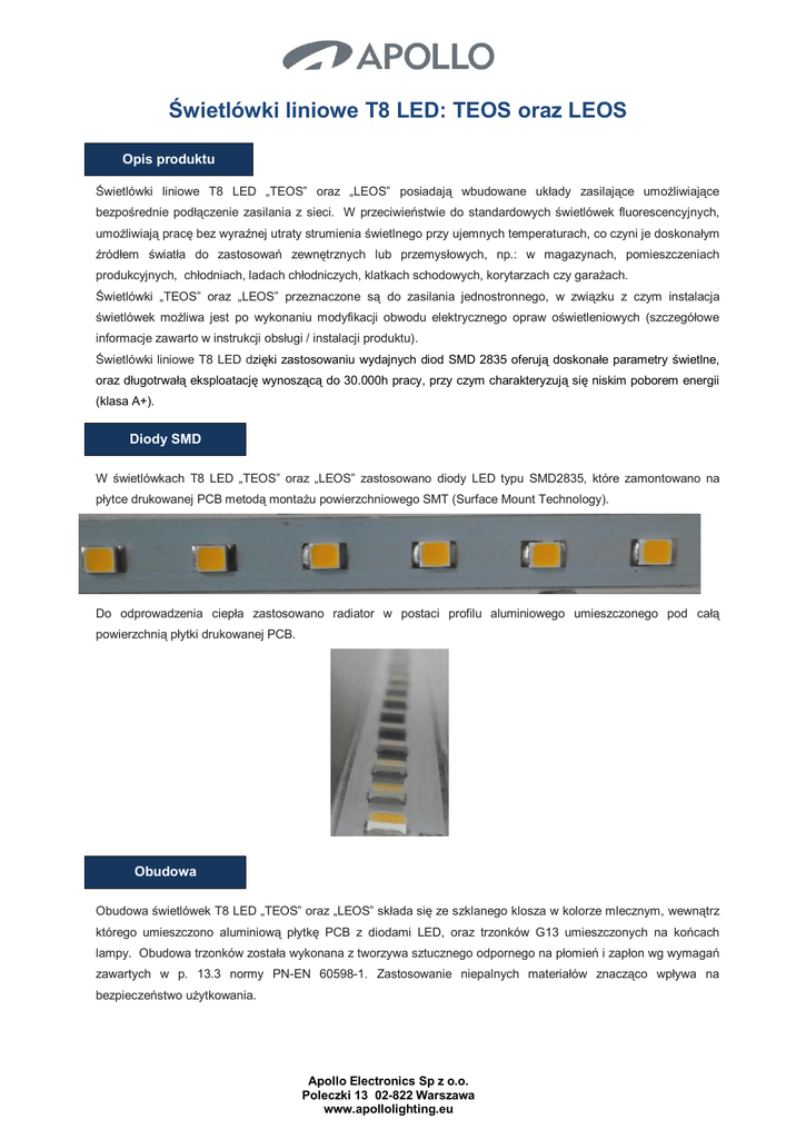 Świetlówki liniowe T8 LED: TEOS oraz LEOS Opis produktu Świetlówki liniowe T8 LED „TEOS” oraz „LEOS” posiadają wbudowane układy zasilające umożliwiające bezpośrednie podłączenie zasilania z sieci. W przeciwieństwie do standardowych świetlówek fluorescencyjnych, umożliwiają pracę bez wyraźnej utraty strumienia świetlnego przy ujemnych temperaturach, co czyni je doskonałym źródłem światła do zastosowań zewnętrznych lub przemysłowych, np.: w magazynach, pomieszczeniach produkcyjnych, chłodniach, ladach chłodniczych, klatkach schodowych, korytarzach czy garażach. Świetlówki „TEOS” oraz „LEOS” przeznaczone są do zasilania jednostronnego, w związku z czym instalacja świetlówek możliwa jest po wykonaniu modyfikacji obwodu elektrycznego opraw oświetleniowych (szczegółowe informacje zawarto w instrukcji obsługi / instalacji produktu). Świetlówki liniowe T8 LED dzięki zastosowaniu wydajnych diod SMD 2835 oferują doskonałe parametry świetlne, oraz długotrwałą eksploatację wynoszącą do 30.000h pracy, przy czym charakteryzują się niskim poborem energii (klasa A+). Diody SMD W świetlówkach T8 LED „TEOS” oraz „LEOS” zastosowano diody LED typu SMD2835, które zamontowano na płytce drukowanej PCB metodą montażu powierzchniowego SMT (Surface Mount Technology). Do odprowadzenia ciepła zastosowano radiator w postaci profilu aluminiowego umieszczonego pod całą powierzchnią płytki drukowanej PCB. Obudowa Obudowa świetlówek T8 LED „TEOS” oraz „LEOS” składa się ze szklanego klosza w kolorze mlecznym, wewnątrz którego umieszczono aluminiową płytkę PCB z diodami LED, oraz trzonków G13 umieszczonych na końcach lampy. Obudowa trzonków została wykonana z tworzywa sztucznego odpornego na płomień i zapłon wg wymagań zawartych w p. 13.3 normy PN-EN 60598-1. Zastosowanie niepalnych materiałów znacząco wpływa na bezpieczeństwo użytkowania. Apollo Electronics Sp z o.o. Poleczki 13 02-822 Warszawa www.apollolighting.eu Układ zasilający Świetlówki liniowe T8 LED „TEOS” oraz „LEOS” zasilane są poprzez wbudowany elektroniczny układ zasilający, dzięki czemu nie ma konieczności stosowania zewnętrznych zasilaczy LED. Układ zasilający umożliwia zasilanie szerszym zakresem napięcia 175–265V, dlatego też świetlówki mogą być instalowane w miejscach narażonych na chwilowe zmiany napięcia w sieci zasilającej. Świetlówki LED można z powodzeniem instalować w powszechnie stosowanych oprawach oświetleniowych po bezpośrednim doprowadzeniu zasilania do oprawek (zgodnie z informacjami zawartymi w instrukcji obsługi / instalacji produktu). Wymiary, podstawowe parametry techniczne - „TEOS” o mocy 9W: - „LEOS” o mocy 18W: Z uwagi na niską energochłonność świetlówki liniowe T8 LED „TEOS” oraz „LEOS” stanowią doskonałą alternatywę w stosunku do dotychczas stosowanych liniowych świetlówek fluorescencyjnych o mocach 18 W oraz 36W. Temperatura barwowa, strumień świetlny Świetlówki liniowe T8 LED oferowane są w trzech barwach światła białego: Oznakowanie wyrobu Temperatura barwowa [K] Strumień świetlny [lm] TEOS T8LED9WWG-G13 3000K 750 TEOS T8LED9NWG-G13 4000K 780 TEOS T8LED9WHTG-G13 6500K 800 LEOS T8LED18WWG-G13 3000K 1670 LEOS T8LED18NWG-G13 4000K 1730 LEOS T8LED18WHTG-G13 6500K 1780 Współczynnik oddawania barw Ra (CRI) Współczynnik oddawania barw Ra (CRI) dla wszystkich modeli świetlówek T8 LED „TEOS” oraz „LEOS” jest wyższy od 70 w związku z czym wyroby te przewidziane są do zastosowań „na zewnątrz” oraz do „zastosowań przemysłowych”. Zgodnie z wymaganiami Rozporządzenia Komisji (UE) Nr 1194/2012 lampy mające wskaźnik oddawania barw większy lub równy 65, oraz mniejszy od 80 ( Ra ≥ 65 oraz Ra < 80) powinny być przeznaczone do użytku na zewnątrz lub do zastosowań przemysłowych. Współczynnik mocy lampy cosφ (PF) Współczynniki mocy lampy cosφ (PF) dla wszystkich modeli świetlówek T8 LED „TEOS” oraz „LEOS” jest wyższy od 0,5. Zgodnie z wymaganiami Rozporządzenia Komisji (UE) Nr 1194/2012 bezkierunkowe oraz kierunkowe lampy LED o mocy większej od 5W i mniejszej lub równej 25W (5W < P ≤ 25W) powinny mieć współczynnik mocy cosφ (PF) wyższy od 0,5. Apollo Electronics Sp z o.o. Poleczki 13 02-822 Warszawa www.apollolighting.eu Dane techniczne TEOS T8LED9WWG-G13 TEOS T8LED9NWG-G13 TEOS T8LED9WHTG-G13 LEOS T8LED18WWG-G13 LEOS T8LED18NWG-G13 LEOS T8LED18WHTG-G13 Napięcie [V] 175 - 265V 50Hz 175 - 265V 50Hz 175 - 265V 50Hz 175 - 265V 50Hz 175 - 265V 50Hz 175 - 265V 50Hz Pobór mocy [W] 9 9 9 18 18 18 Barwa światła ciepła biała neutralna biała zimna biała ciepła biała neutralna biała zimna biała Temperatura barwowa [K] 3000 4000 6500 3000 4000 6500 Strumień świetlny [lm] 750 780 800 1670 1730 1780 Kąt rozsyłu 320° 320° 320° 320° 320° 320° Parametr: Wskaźnik oddawania barw Ra (CRI) > 70 > 70 > 70 > 70 > 70 > 70 > 0,5 > 0,5 > 0,5 > 0,5 > 0,5 > 0,5 Ilość cykli włącz / wyłącz 15.000 15.000 15.000 15.000 15.000 15.000 Czas zapłonu lampy < 0,2s < 0,2s < 0,2s < 0,2s < 0,2s < 0,2s Czas do 60% pełnego strumienia świetlnego < 1s < 1s < 1s < 1s < 1s < 1s Współczynnik mocy cosφ (PF) Żywotność 30.000h 30.000h 30.000h 30.000h 30.000h 30.000h Typ źródła światła LED SMD2835 LED SMD2835 LED SMD2835 LED SMD2835 LED SMD2835 LED SMD2835 Materiał klosza szkło szkło szkło szkło szkło szkło Materiał oprawek poliwęglan (PC) poliwęglan (PC) poliwęglan (PC) poliwęglan (PC) poliwęglan (PC) poliwęglan (PC) Typ trzonka G13 G13 G13 G13 G13 G13 Zabezpieczenie zwarciowe TAK TAK TAK TAK TAK TAK Współpraca ze ściemniaczem NIE NIE NIE NIE NIE NIE Wymiary [mm] 600 x 28 600 x 28 600 x 28 1200 x 28 1200 x 28 1200 x 28 Zużycie prądu / 1000h 9kWh / 1000h 9kWh / 1000h 9kWh / 1000h 18kWh / 1000h 18kWh / 1000h 18kWh / 1000h Klasa efektywności energetycznej Klasa A+ Klasa A+ Klasa 