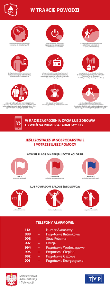 W TRAKCIE POWODZI w miarę możliwości zapobiegaj tworzeniu się atmosfery paniki wyłącz instalację elektryczną i gazową oraz zabezpiecz sieć kanalizacyjną lub szambo w przypadku niebezpieczeństwa natychmiast przemieść się na wyżej położone tereny 50 kg jeśli posiadasz telefon komórkowy, miej go zawsze przy sobie i zadbaj, aby bateria była naładowana włącz radioodbiornik zasilany bateriami na częstotliwość lokalnej stacji radiowej, aby uzyskać najnowsze informacje o sytuacji i sposobach postępowania przygotuj się do ewakuacji; pamiętaj, że osoby dorosłe powinny mieć przy sobie nie więcej niż 50 kg bagażu (do 20 kg na osobę, do 50 kg na rodzinę) miej przy sobie apteczkę pierwszej pomocy i używane przez domowników leki, niezbędny zapas jedzenia i wody pitnej, ciepłe ubrania, śpiwory i koce (zgromadzone w górnych partiach domu) nie używaj wody ze studni ani wody gruntowej - może być skażona nie chodź po obszarach zalanych – szybko płynąca woda może przewrócić dorosłego człowieka; jeśli musisz przekroczyć zalany obszar użyj do badania gruntu przed sobą tyczki W RAZIE ZAGROŻENIA ŻYCIA LUB ZDROWIA DZWOŃ NA NUMER ALARMOWY 112 JEŚLI ZOSTAŁEŚ W GOSPODARSTWIE I POTRZEBUJESZ POMOCY WYWIEŚ FLAGĘ O NASTĘPUJĄCYM KOLORZE: BIAŁA potrzeba ewakuacji CZERWONA potrzeba pomocy medycznej NIEBIESKA potrzeba żywności i wody LUB POWIADOM ZAŁOGĘ ŚMIGŁOWCA: YES NO TAK potrzebna pomoc nie machaj bez sensu NIE wszystko w porządku TELEFONY ALARMOWE: 112 999 998 997 994 993 992 991 – – – – – – – – Numer Alarmowy Pogotowie Ratunkowe Straż Pożarna Policja Pogotowie Wodociągowe Pogotowie Cieplne Pogotowie Gazowe Pogotowie Energetyczne