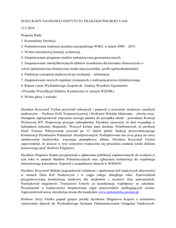 ECHA RADY NAUKOWEJ INSTYTUTU FILOLOGII POLSKIEJ UAM 13 I 2016 Program Rady: 1. Komunikaty Dyrekcji. 2. Podsumowanie realizacji projektu europejskiego POKL w latach 2009 – 2015. 3. Wybór instytutowej komisji wyborczej. 4. Zaopiniowanie programu studiów polonistyczno-germanistycznych. 5. Zaopiniowanie zmodyfikowanych efektów kształcenia dla kierunku Humanistyka w szkole (polonistyczno-historyczne studia nauczycielskie, profil ogólnoakademicki). 6. Punktacja czasopism naukowych po ewaluacji – informacja. 7. Zaopiniowanie nowych regulacji związanych z realizacją procesu dydaktycznego. 8. Raport z prac Wydziałowego Zespołu ds. Analizy Wyników Egzaminów i Procedur Weryfikacji Efektów Kształcenia (w ramach WZOJK). 9. Wolne głosy i wnioski. Dyrektor Krzysztof Trybuś przywitał zebranych i poprosił o uczczenie niedawno zmarłych naukowców – Profesor Zofii Trojanowiczowej i Profesora Witolda Mańczaka – chwilą ciszy. Następnie zaproponował włączenie nowego punktu do porządku obrad – powołanie Komisji Wyborczej IFP. Propozycję przyjęto jednogłośnie. Dyrektor zauważył, że dziś wypadają w kalendarzu imieniny Bogumiły. Wręczył kwiaty pani dziekan. Poinformował, że profesor Józef Tomasz Pokrzywniak przestał po 15 latach pełnić funkcję przewodniczącego Konferencji Dyrektorów Polonistyk Akredytowanych. Podziękowano mu za tę pracę na rzecz zjednoczenia środowiska, wręczając pamiątkowy album. Dyrektor Krzysztof Trybuś zapowiedział, że jeszcze w tym semestrze rozpocznie się procedura nadania tytułu doktora honorowego prof. Rolfowi Fiegutowi. Dyrektor Zbigniew Kopeć przypominał o zgłaszaniu publikacji zaplanowanych do wydania w tym roku w ramach Studiów Polonistycznych oraz zgłaszaniu konferencji do wspólnego instytutowego kalendarza. Poprosił o uzupełnienie danych w WSDON. Dyrektor Krzysztof Skibski pogratulował członkom i opiekunom kół naukowych aktywności w ramach Dnia Kół Naukowych i w ciągu całego ubiegłego roku. Zapowiedział przygotowywaną konferencję naukową dla studentów i uczniów klas patronackich. Podziękował magistrowi Tomaszowi Umerle za koordynację współpracy ze szkołami. Przypomniał o konieczności hospitowania zajęć pracowników podlegających ocenie. Zaprezentował nową, niezależną stronę dla kandydata www.polonistyka-poznan.pl Profesor Jerzy Fiećko poparł gorąco prośbę dyrektora Zbigniewa Kopcia o terminowe wpisywanie danych do Wydziałowego Systemu Dokumentowania Osiągnięć Naukowych. Konieczne jest wczesne raportowanie, ponieważ za tym idzie dofinansowanie działalności Wydziału. Sprawa jest priorytetowa. Następnie, na prośbę Dyrektora Trybusia, podsumowania projektu europejskiego POKL w latach 2009‒2015 dokonał jego kierownik, doktor Mirosław Wobalis. Szeroko przedstawił dokonania projektu w liczbach. W bardzo serdeczny i osobisty sposób podziękował osobom szczególnie zaangażowanym w prace Projektu – profesorowi Jerzemu Kaniewskiemu, odpowiedzialnemu za całą część pracy dotyczącą kontaktów z rynkiem pracy, profesor Bogumile Kaniewskiej – za modernizacje, profesor Katarzynie Meller – za wsparcie, zwłaszcza lokalowe, profesorowi Tomaszowi Mizerkiewiczowi, profesorowi Krzysztofowi Trybusiowi, całemu Zespołowi Projektu oraz wszystkim Pracownikom IFP za to, że udało się zrealizować tak wiele. Dyrektor Krzysztof Trybuś zakończył całą wypowiedź stwierdzeniem: „Brawo my!”. Zespół pracowników Projektu otrzymał w prezencie tort truskawkowy. Profesor Bogumiła Kaniewska podziękowała za całokształt osiągnięć wszystkim projektowym współpracownikom, a zwłaszcza doktorowi Mirosławowi Wobalisowi za innowacyjny pomysł i odwagę. Zadeklarowała czasowe zatrudnienie całego Zespołu na pół etatu, podczas oczekiwania na wyniki kolejnego konkursu grantowego. Następnie przeprowadzono wybór Instytutowej Komisji Wyborczej. Komisja skrutacyjna w składzie: dr hab. Justyna Szczęsna, dr hab. Rafał Kochanowicz, przeliczyła głosy. Członkami Komisji Wyborczej IFP zostali: przewodniczący – prof. dr hab. Grzegorz Raubo, sekretarz – dr Agnieszka Kula, przedstawiciel administracji – mgr Karolina Nowakowska, przedstawiciel studentów – Aleksandra Nowak. W dalszej kolejności zaopiniowano pozytywnie program studiów polonistycznogermanistycznych oraz zmodyfikowane efekty kształcenia dla kierunku Humanistyka w szkole (polonistyczno-historyczne studia nauczycielskie, profil ogólnoakademicki). Dyrektor Zbigniew Kopeć przedstawił nową punktację czasopism naukowych po ewaluacji. Podkreślił awans wielu z naszych czasopism. Profesor Jerzy Fiećko dodał, że awans jest w pełni uzasadniony, gdyż w wydawnictwach wykonano olbrzymią pracę, polegającą na wprowadzeniu wielu danych do systemu. Wyższa punktacja obowiązuje już w odniesieniu do minionego roku wydawniczego. Profesor Alicja Pihan-Kijasowa poinformowała, że kolejne dane bibliograficzne ze strony Wydawnictwa PTPN wpisane do systemu podniosą znaczenie publikacji polonistycznych w systemie parametryzacyjnym. Następnie zaopiniowano nowe regulacje związane z realizacją procesu dydaktycznego. Dyrektor Krzysztof Trybuś podjął niepokojący temat utraty studentów pierwszego roku. Przedstawił wyniki analizy przyczyn takiego stanu rzeczy. Oprócz przyczyn niezależnych od działań Instytutu, są czynniki, na które możemy wpływać, np. sprzęt, plany modernizacji, poszerzenie możliwości lokalowych tak, aby plan mógł w większym stopniu spełniać oczekiwania studentów. Wskazał też na konieczność stosowania reguł właściwych dydaktyce akademickiej, które dotyczą częstotliwość zajęć, sposobów oceny, egzaminowania. Szczegóły modyfikacji tych regulacji przedstawił dyrektor Krzysztof Skibski. Zaproponował cykliczne spotkania z reprezentantami studentów w ramach tzw. Rad Studenckich. Usprawni to obieg informacji, pozwoli ustalić oczekiwania studentó