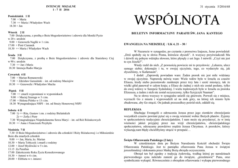 31 stycznia 5/2016/68 INTENCJE MSZALNE 1 - 7 II 2016 Poniedziałek 1 II 7.00 + Maria 7.30 ++ Maria i Władysław Wach 18.30 + Jan Wtorek 2 II 7.00 Dziękczynna, z prośbą o Boże błogosławieństwo i zdrowie dla Moniki Pyzio w 20 r. urodzin 9.00 + Genowefa Naglik w 1 r.śm. 17.00 + Piotr Ciaranek 18.30 ++ Maria i Władysław Wach Środa 3 II 7.00 Dziękczynna, z prośbą o Boże błogosławieństwo i zdrowie dla Stanisławy Ciej w 90 r. urodzin 7.30 ++ Jan i Maria 18.30 Intencja Radio Maryja Czwartek 4 II 7.00 + Marian Romanowski 7.30 + Zdzisław Garusiński – int. od rodziny Maciejów 18.30 ++ Genowefa i Władysław Mucha Piątek 5 II 7.00 ++ zmarli wypominani w wypominkach 9.00 + Maciej Szaruga w 3 r.śm. 17.00 + Helena Piórko w 13 r.śm. 18.30 Wynagradzająca NSPJ – int. od Straży Honorowej NSPJ Sobota 6 II 7.00 1) ++ Rita, Gustaw i zm. z rodziny Bielańskich 2) ++ Zofia i Piotr 7.30 Wynagradzająca Niepokalanemu Sercu Maryi – int. od Róż Różańcowych 18.30 ++ Anna i Franciszek Przybyło Niedziela 7 II 7.30 O Boże błogosławieństwo i zdrowie dla członkiń I Róży Różańcowej i o Miłosierdzie Boże dla zmarłych członkiń 9.00 ++ Jan, Maria, ks. Marian 10.30 + Maria Tobiczyk i zmarli z rodziny 12.00 + Józef Myśliwski w 5 r.śm. 13.15 Za Parafian 17.00 Zakończenie Roku Życia Konsekrowanego 18.30 + Antoni w 6 r.śm. 20.00 + Elżbieta w r. śmierci WSPÓLNOTA BIULETYN INFORMACYJNY PARAFII ŚW. JANA KANTEGO EWANGELIA NA NIEDZIELĘ / ŁK 4, 21 – 30 / W Nazarecie w synagodze, po czytaniu z proroctwa Izajasza, Jezus powiedział: „Dziś spełniły się te słowa Pisma, któreście słyszeli”. A wszyscy przyświadczali Mu i dziwili się pełnym wdzięku słowom, które płynęły z ust Jego. I mówili: „Czyż nie jest to syn Józefa?”. Wtedy rzekł do nich „Z pewnością powiecie mi to przysłowie: „Lekarzu, ulecz samego siebie; dokonajże i tu, w swojej ojczyźnie, tego, co wydarzyło się, jak słyszeliśmy, w Kafarnaum”. I dodał: „Zaprawdę powiadam wam: Żaden prorok nie jest mile widziany w swojej ojczyźnie. Naprawdę mówię wam: Wiele wdów było w Izraelu za czasów Eliasza, kiedy niebo pozostawało zamknięte przez trzy lata i sześć miesięcy, tak że wielki głód panował w całym kraju; a Eliasz do żadnej z nich nie został posłany, tylko do owej wdowy w Sarepcie Sydońskiej. I wielu trędowatych było w Izraelu za proroka Elizeusza, a żaden z nich nie został oczyszczony, tylko Syryjczyk Naaman”. Na te słowa wszyscy w synagodze unieśli się gniewem. Porwali się z miejsca, wyrzucili Go z miasta i wyprowadzili aż na stok góry, na której ich miasto było zbudowane, aby Go strącić. On jednak przeszedłszy pośród nich, oddalił się. REFLEKSJA Słuchając Ewangelii o odrzuceniu Jezusa przez jego ziomków chrześcijanie wszystkich czasów powinni pytać się o swoją wierność wobec Bożych planów. Żyjemy w społeczeństwie tradycyjnie chrześcijańskim. I nam może się przydarzyć, że w imię wierności jakieś przyjętej przez nas wizji chrześcijaństwa, chrześcijańskiego społeczeństwa, odrzucamy prawdziwe orędzie Jezusa Chrystusa. A proroków, którzy wykazują nam błędy chcielibyśmy strącić w przepaść… Święto Ofiarowania Pańskiego (2 luty) W czterdziestym dniu po Bożym Narodzeniu Kościół obchodzi Święto Ofiarowania Pańskiego. Jest to pamiątka ofiarowania Pana Jezusa w świątyni jerozolimskiej i dokonania przez Matkę Bożą obrzędu oczyszczenia. Obrzęd ten był zgodny z tradycją żydowską, według której po narodzinach pierworodnego syna należało zanieść go do świątyni, „przedstawić” Panu, oraz symbolicznie wykupić. Równocześnie z obrzędem ofiarowania i wykupu pierworodnego syna łączyła się ceremonia oczyszczenia matki dziecka. Zgodnie z przepisami Prawa Mojżeszowego, kobieta po urodzeniu dziecka wchodziła w stan rytualnej i kultycznej nieczystości, trwający w przypadku urodzenia syna 40 dni, zaś w przypadku urodzenia dziewczynki 80 dni. Zgodnie z Kpł 12, 4-5, przez cały ten czas musiała ona unikać kontaktu z rzeczami świętymi oraz nie mogła wejść do świątyni. Po upływie tych dni, matka była zobowiązana złożyć ofiarę z baranka, a jeśli jej na to nie pozwalało zbyt wielkie ubóstwo – przynajmniej ofiarę z dwóch synogarlic lub gołębi. Fakt, że Maryja i Józef złożyli synogarlicę, świadczy, że byli ubodzy. Święto Ofiarowania Pańskiego należy do najstarszych, gdyż było obchodzone w Jerozolimie już w IV w., a więc zaraz po ustaniu prześladowań. Wtedy odchodzono Święto Spotkania, w czasie którego celebrowano pamiątkę pierwszego przybycia Chrystusa do miasta i świątyni. Organizowano wtedy nocne procesje ze świecami. Przypuszcza się, że już w VI w. celebrowano je w Konstantynopolu, w którym zwrócono uwagę na maryjny charakter święta. Jeszcze wcześniej, bo prawdopodobnie w V w. znane było w Rzymie, zaś od VII w. urządzano w tym dniu procesje ze świecami. Od X w., pod wpływem liturgii galikańskiej, rozpowszechnił się zwyczaj poświęcania w dniu Ofiarowania Pańskiego świec. Ich światło jest przede wszystkim symbolem Chrystusa, o którym Symeon powiedział, że jest „światłem na oświecenie pogan” i który jest „Światłością ze Światłości”. Płonąca świeca jest też symbolem naszej gotowości na Jego przyjęcie, oraz znakiem, że nasze życie spala się dla Boga. W Polsce Święto Ofiarowania Pańskiego przybrało charakter maryjny i do dziś nazywa się je Świętem Matki Bożej Gromnicznej. Wskazuje ono na Maryję jako tę, która przyniosła światu Jezusa, Światłość Świata. Z tym świętem związana jest tradycja poświęcania świec – gromnic. Ich polska nazwa pochodzi od słowa „grom”, gdyż według wierzeń zapalenie jej w czasie burzy i pozostawienie w oknie ma chronić przed uderzeniami piorunów. Gromnice miały też chronić przed tragediami, pożarami, czy wszel