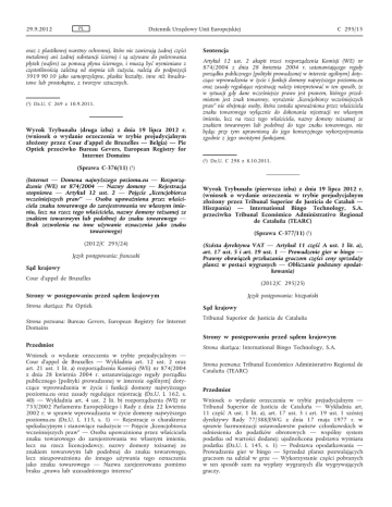 29.9.2012 PL Dziennik Urzędowy Unii Europejskiej oraz z plastikowej warstwy ochronnej, które nie zawierają żadnej części metalowej ani żadnej substancji ściernej i są używane do polerowania płytek (wafers) za pomocą płynu ściernego, i muszą być wymieniane z częstotliwością zależną od stopnia ich zużycia, należą do podpozycji 3919 90 10 jako samoprzylepne, płaskie kształty, inne niż kwadra towe lub prostokątne, z tworzyw sztucznych. (1) Dz.U. C 269 z 10.9.2011. Wyrok Trybunału (druga izba) z dnia 19 lipca 2012 r. (wniosek o wydanie orzeczenia w trybie prejudycjalnym złożony przez Cour d’appel de Bruxelles — Belgia) — Pie Optiek przeciwko Bureau Gevers, European Registry for Internet Domains (Sprawa C-376/11) C 295/15 Sentencja Artykuł 12 ust. 2 akapit trzeci rozporządzenia Komisji (WE) nr 874/2004 z dnia 28 kwietnia 2004 r. ustanawiającego reguły porządku publicznego [polityki prowadzonej w interesie ogólnym] doty czące wprowadzenia w życie i funkcji domeny najwyższego poziomu.eu oraz zasady regulujące rejestrację należy interpretować w ten sposób, że w sytuacji gdy dane wcześniejsze prawo jest prawem, którego przed miotem jest znak towarowy, wyrażenie „licencjobiorcy wcześniejszych praw” nie obejmuje osoby, która została upoważniona przez właściciela znaku towarowego wyłącznie do dokonania rejestracji we własnym imieniu, lecz na rzecz tego właściciela, nazwy domeny tożsamej ze znakiem towarowym lub podobnej do tego znaku towarowego, nie będąc przy tym uprawnioną do jego komercyjnego wykorzystywania zgodnie z jego swoistymi funkcjami. (1) Dz.U. C 298 z 8.10.2011. (1 ) (Internet — Domena najwyższego poziomu.eu — Rozporzą dzenie (WE) nr 874/2004 — Nazwy domeny — Rejestracja stopniowa — Artykuł 12 ust. 2 — Pojęcie „licencjobiorca wcześniejszych praw” — Osoba upoważniona przez właści ciela znaku towarowego do zarejestrowania we własnym imie niu, lecz na rzecz tego właściciela, nazwy domeny tożsamej ze znakiem towarowym lub podobnej do znaku towarowego — Brak zezwolenia na inne używanie oznaczenia jako znaku towarowego) (2012/C 295/24) Język postępowania: francuski Sąd krajowy Wyrok Trybunału (pierwsza izba) z dnia 19 lipca 2012 r. (wniosek o wydanie orzeczenia w trybie prejudycjalnym złożony przez Tribunal Superior de Justicia de Cataluñ — Hiszpania) — International Bingo Technology, S.A. przeciwko Tribunal Económico Administrativo Regional de Cataluña (TEARC) (Sprawa C-377/11) (1) (Szósta dyrektywa VAT — Artykuł 11 część A ust. 1 lit. a), art. 17 ust. 5 i art. 19 ust. 1 — Prowadzenie gier w bingo — Prawny obowiązek przekazania graczom części ceny sprzedaży plansz w postaci wygranych — Obliczanie podstawy opodat kowania) Cour d’appel de Bruxelles (2012/C 295/25) Język postępowania: hiszpański Strony w postępowaniu przed sądem krajowym Strona skarżąca: Pie Optiek Strona pozwana: Bureau Gevers, European Registry for Internet Domains Sąd krajowy Tribunal Superior de Justicia de Cataluña Strony w postępowaniu przed sądem krajowym Przedmiot Wniosek o wydanie orzeczenia w trybie prejudycjalnym — Cour d’appel de Bruxelles — Wykładnia art. 12 ust. 2 oraz art. 21 ust. 1 lit. a) rozporządzenia Komisji (WE) nr 874/2004 z dnia 28 kwietnia 2004 r. ustanawiającego reguły porządku publicznego [polityki prowadzonej w interesie ogólnym] doty czące wprowadzenia w życie i funkcji domeny najwyższego poziomu.eu oraz zasady regulujące rejestrację (Dz.U. L 162, s. 40) — Wykładnia art. 4 ust. 2 lit. b) rozporządzenia (WE) nr 733/2002 Parlamentu Europejskiego i Rady z dnia 22 kwietnia 2002 r. w sprawie wprowadzania w życie domeny najwyższego poziomu.eu (Dz.U. L 113, s. 1) — Rejestracje o charakterze spekulacyjnym i stanowiące nadużycie — Pojęcie „licencjobiorca wcześniejszych praw” — Osoba upoważniona przez właściciela znaku towarowego do zarejestrowania we własnym imieniu, lecz na rzecz licencjodawcy, nazwy domeny tożsamej ze znakiem towarowym lub podobnej do znaku towarowego, lecz nieupoważniona do innego używania tego oznaczenia jako znaku towarowego — Nazwa zarejestrowana pomimo braku „prawa lub uzasadnionego interesu” Strona skarżąca: International Bingo Technology, S.A. Strona pozwana: Tribunal Económico Administrativo Regional de Cataluña (TEARC) Przedmiot Wniosek o wydanie orzeczenia w trybie prejudycjalnym — Tribunal Superior de Justicia de Cataluña — Wykładnia art. 11 część A ust. 1 lit. a), art. 17 ust. 5 i art. 19 ust. 1 szóstej dyrektywy Rady 77/388/EWG z dnia 17 maja 1977 r. w sprawie harmonizacji ustawodawstw państw członkowskich w odniesieniu do podatków obrotowych — wspólny system podatku od wartości dodanej: ujednolicona podstawa wymiaru podatku (Dz.U. L 145, s. 1) — Podstawa opodatkowania — Prowadzenie gier w bingo — Sprzedaż plansz pozwalających graczom na udział w grze — Wykorzystanie części pobranych w ten sposób sum na wypłaty wygranych dla wygrywających graczy.