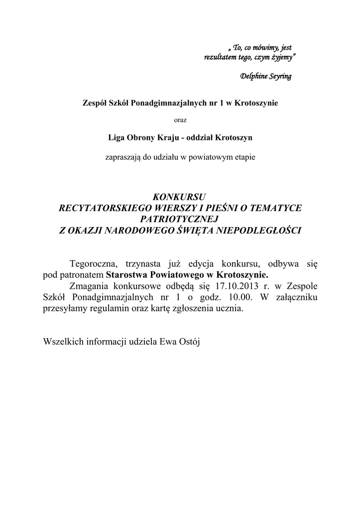 „ To, co mówimy, jest rezultatem tego, czym żyjemy” Delphine Seyring Zespół Szkół Ponadgimnazjalnych nr 1 w Krotoszynie oraz Liga Obrony Kraju - oddział Krotoszyn zapraszają do udziału w powiatowym etapie KONKURSU RECYTATORSKIEGO WIERSZY I PIEŚNI O TEMATYCE PATRIOTYCZNEJ Z OKAZJI NARODOWEGO ŚWIĘTA NIEPODLEGŁOŚCI Tegoroczna, trzynasta już edycja konkursu, odbywa się pod patronatem Starostwa Powiatowego w Krotoszynie. Zmagania konkursowe odbędą się 17.10.2013 r. w Zespole Szkół Ponadgimnazjalnych nr 1 o godz. 10.00. W załączniku przesyłamy regulamin oraz kartę zgłoszenia ucznia. Wszelkich informacji udziela Ewa Ostój Regulamin konkursu recytatorskiego I Termin i miejsce: - Zespół Szkół Ponadgimnazjalnych nr 1 w Krotoszynie, ul. Mickiewicza 11 - 17.10. 2013 r., godz. 10.00 – budynek F Centrum Kształcenia Ustawicznego II. Cele konkursu: - wytworzenie emocjonalnego stosunku do wartości kulturowych, w szczególności do poezji oraz upowszechnienie wśród młodzieży piękna mowy ojczystej, dorobku kultury narodowej i kultury żywego słowa, - pogłębianie wśród młodzieży szkolnej znajomości polskiej poezji patriotycznej oraz rozwijanie wrażliwości artystycznych, a także zainteresowania językiem polskim, wzbogacanie słownictwa i umiejętności formułowania wypowiedzi, - przyczynianie się do wzbogacania w patriotyczne wartości organizowanych obchodów Święta Niepodległości , - upowszechnianie polskiej poezji wśród młodzieży. III. Zasady udziału w konkursie: 1. W Powiatowym Konkursie udział biorą 4 - osobowe reprezentacje młodzieży szkół ponadpodstawowych (gimnazja, licea, technika) . 2. Reprezentacja składa się maksymalnie z dwóch osób w kategorii recytacji i dwóch osób w kategorii pieśni patriotycznej. 3. Każda z osób prezentuje jeden utwór o tematyce patriotycznej. 4. Uczestnicy oceniani są indywidualnie w dwóch kategoriach. 5. Warunkiem uczestnictwa w konkursie jest pisemne zgłoszenie do organizatora imiennej listy uczestników na karcie uczestnictwa (z dopiskiem „Dla Ewy Ostój”). 6. Organizatorzy nie zapewniają akompaniamentu. Sala wyposażona jest w sprzęt nagłaśniający. IV. Zasady oceny Konkursu : 1. Organizator powołuje jury, które dokona oceny każdego z występów poszczególnych uczestników. Uczestnicy prezentują jeden utwór o tematyce patriotycznej w czasie do 3 minut. 2. Jury będzie oceniło : - dobór repertuaru - przyznając 0 - 5 pkt. - kulturę słowa - przyznając 0 - 5 pkt. - interpretację tekstu - przyznając 0 - 5 pkt. -ogólny wyraz artystyczny występu - przyznając 0 - 5 pkt. 3. Ocenie podlegają prezentowane przez uczestników 1. wiersz lub pieśń (może być z akompaniamentem) o tematyce patriotycznej. 4.Każdy z uczestników może uzyskać maksymalnie 20 pkt. od jurora w każdej z kategorii, tj. recytacji i poezji śpiewanej. 5. Regulamin przewiduje klasyfikację indywidualną w każdej z kategorii. 6. Decyzje Jury konkursu są ostateczne i nie podlegają odwołaniu. V. Dobór repertuaru: 1. Repertuar stanowi polska poezja patriotyczna, bez względu na okres jej powstania. VI. Nagrody : 1. Indywidualnie w dwóch kategoriach recytacji i poezji śpiewanej. 1 - 3 miejsce - dyplom, nagroda rzeczowa. Laureaci dwóch pierwszych miejsc w każdej kategorii przechodzą do etapu wojewódzkiego. VII. Informacje dodatkowe: 1. Adres szkoły: Zespół Szkół Ponadgimnazjalnych nr 1 w Krotoszynie ul. Mickiewicza 11 63-700 Krotoszyn 2. Telefon: 62 725-32-75; fax. 62 725 30 15 Informacji udziela Ewa Ostój 3. Mail: [email protected] 4. Regulamin i termin Konkursu – etap wojewódzki - Regulamin na stronie internetowej www.lok.org.pl - Termin – 26 października 2013 r. Karta zgłoszenia uczestnika L. p. Imię i nazwisko uczestnika Tytuł utworu i nazwisko autora utworu Kategoria Imię i nazwisko opiekuna Szkoła recytacja recytacja śpiew śpiew ............................................................. (pieczęć i podpis dyrektora szkoły)