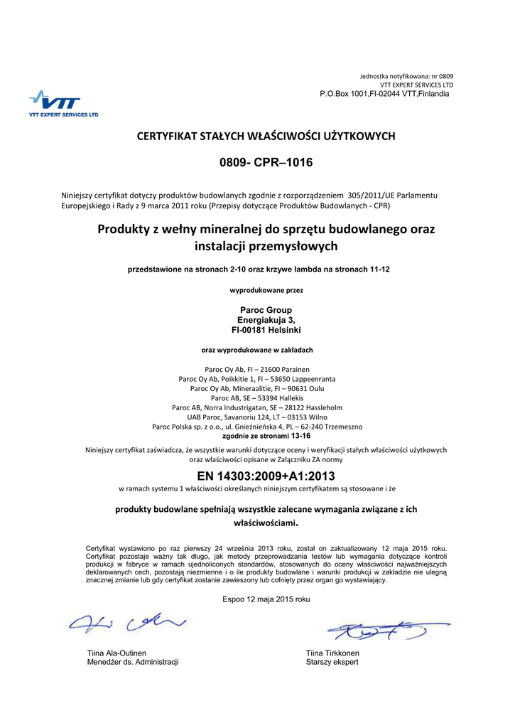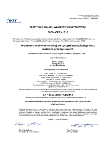 Jednostka notyfikowana: nr 0809 VTT EXPERT SERVICES LTD P.O.Box 1001,FI-02044 VTT,Finlandia CERTYFIKAT STAŁYCH WŁAŚCIWOŚCI UŻYTKOWYCH 0809- CPR–1016 Niniejszy certyfikat dotyczy produktów budowlanych zgodnie z rozporządzeniem 305/2011/UE Parlamentu Europejskiego i Rady z 9 marca 2011 roku (Przepisy dotyczące Produktów Budowlanych - CPR) Produkty z wełny mineralnej do sprzętu budowlanego oraz instalacji przemysłowych przedstawione na stronach 2-10 oraz krzywe lambda na stronach 11-12 wyprodukowane przez Paroc Group Energiakuja 3, FI-00181 Helsinki oraz wyprodukowane w zakładach Paroc Oy Ab, FI – 21600 Parainen Paroc Oy Ab, Poikkitie 1, FI – 53650 Lappeenranta Paroc Oy Ab, Mineraalitie, FI – 90631 Oulu Paroc AB, SE – 53394 Hallekis Paroc AB, Norra Industrigatan, SE – 28122 Hassleholm UAB Paroc, Savanoriu 124, LT – 03153 Wilno Paroc Polska sp. z o.o., ul. Gnieźnieńska 4, PL – 62-240 Trzemeszno zgodnie ze stronami 13-16 Niniejszy certyfikat zaświadcza, że wszystkie warunki dotyczące oceny i weryfikacji stałych właściwości użytkowych oraz właściwości opisane w Załączniku ZA normy EN 14303:2009+A1:2013 w ramach systemu 1 właściwości określanych niniejszym certyfikatem są stosowane i że produkty budowlane spełniają wszystkie zalecane wymagania związane z ich właściwościami. Certyfikat wystawiono po raz pierwszy 24 września 2013 roku, został on zaktualizowany 12 maja 2015 roku. Certyfikat pozostaje ważny tak długo, jak metody przeprowadzania testów lub wymagania dotyczące kontroli produkcji w fabryce w ramach ujednoliconych standardów, stosowanych do oceny właściwości najważniejszych deklarowanych cech, pozostają niezmienne i o ile produkty budowlane i warunki produkcji w zakładzie nie ulegną znacznej zmianie lub gdy certyfikat zostanie zawieszony lub cofnięty przez organ go wystawiający. Espoo 12 maja 2015 roku Tiina Ala-Outinen Menedżer ds. Administracji Tiina Tirkkonen Starszy ekspert