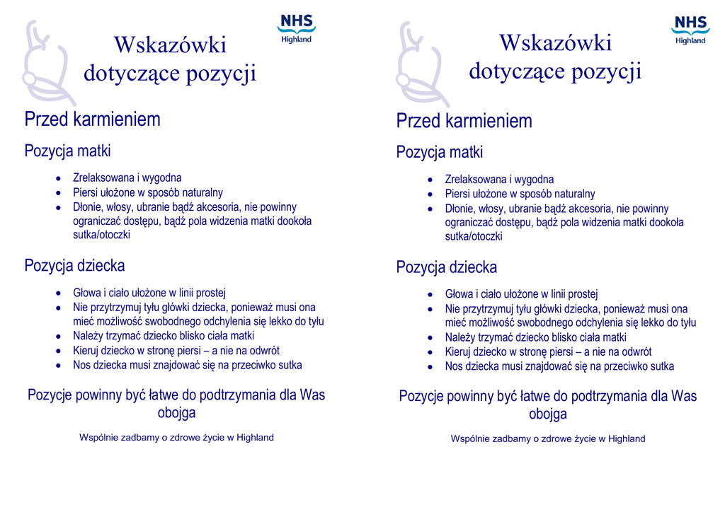 Wskazówki dotyczące pozycji Wskazówki dotyczące pozycji Przed karmieniem Przed karmieniem Pozycja matki Pozycja matki Zrelaksowana i wygodna Piersi ułożone w sposób naturalny Dłonie, włosy, ubranie bądź akcesoria, nie powinny ograniczać dostępu, bądź pola widzenia matki dookoła sutka/otoczki Pozycja dziecka Zrelaksowana i wygodna Piersi ułożone w sposób naturalny Dłonie, włosy, ubranie bądź akcesoria, nie powinny ograniczać dostępu, bądź pola widzenia matki dookoła sutka/otoczki Pozycja dziecka Głowa i ciało ułożone w linii prostej Nie przytrzymuj tyłu główki dziecka, ponieważ musi ona mieć możliwość swobodnego odchylenia się lekko do tyłu Należy trzymać dziecko blisko ciała matki Kieruj dziecko w stronę piersi – a nie na odwrót Nos dziecka musi znajdować się na przeciwko sutka Głowa i ciało ułożone w linii prostej Nie przytrzymuj tyłu główki dziecka, ponieważ musi ona mieć możliwość swobodnego odchylenia się lekko do tyłu Należy trzymać dziecko blisko ciała matki Kieruj dziecko w stronę piersi – a nie na odwrót Nos dziecka musi znajdować się na przeciwko sutka Pozycje powinny być łatwe do podtrzymania dla Was obojga Pozycje powinny być łatwe do podtrzymania dla Was obojga Wspólnie zadbamy o zdrowe życie w Highland Wspólnie zadbamy o zdrowe życie w Highland