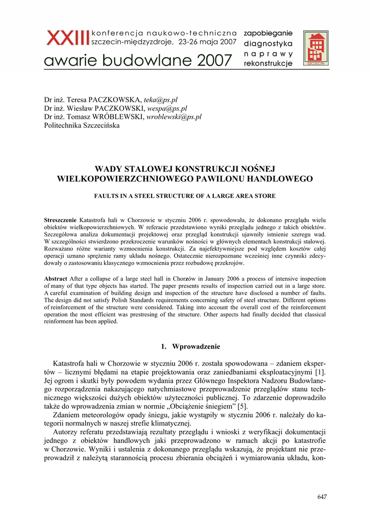 Dr inŜ. Teresa PACZKOWSKA, [email protected] Dr inŜ. Wiesław PACZKOWSKI, [email protected] Dr inŜ. Tomasz WRÓBLEWSKI, [email protected] Politechnika Szczecińska WADY STALOWEJ KONSTRUKCJI NOŚNEJ WIELKOPOWIERZCHNIOWEGO PAWILONU HANDLOWEGO FAULTS IN A STEEL STRUCTURE OF A LARGE AREA STORE Streszczenie Katastrofa hali w Chorzowie w styczniu 2006 r. spowodowała, Ŝe dokonano przeglądu wielu obiektów wielkopowierzchniowych. W referacie przedstawiono wyniki przeglądu jednego z takich obiektów. Szczegółowa analiza dokumentacji projektowej oraz przegląd konstrukcji ujawniły istnienie szeregu wad. W szczególności stwierdzono przekroczenie warunków nośności w głównych elementach konstrukcji stalowej. RozwaŜano róŜne warianty wzmocnienia konstrukcji. Za najefektywniejsze pod względem kosztów całej operacji uznano spręŜenie ramy układu nośnego. Ostatecznie nierozpoznane wcześniej inne czynniki zdecydowały o zastosowaniu klasycznego wzmocnienia przez rozbudowę przekrojów. Abstract After a collapse of a large steel hall in Chorzów in January 2006 a process of intensive inspection of many of that type objects has started. The paper presents results of inspection carried out in a large store. A careful examination of building design and inspection of the structure have disclosed a number of faults. The design did not satisfy Polish Standards requirements concerning safety of steel structure. Different options of reinforcement of the structure were considered. Taking into account the overall cost of the reinforcement operation the most efficient was prestresing of the structure. Other aspects had finally decided that classical reinforment has been applied. 1. Wprowadzenie Katastrofa hali w Chorzowie w styczniu 2006 r. została spowodowana – zdaniem ekspertów – licznymi błędami na etapie projektowania oraz zaniedbaniami eksploatacyjnymi [1]. Jej ogrom i skutki były powodem wydania przez Głównego Inspektora Nadzoru Budowlanego rozporządzenia nakazującego natychmiastowe przeprowadzenie przeglądów stanu technicznego większości duŜych obiektów uŜyteczności publicznej. To zdarzenie doprowadziło takŜe do wprowadzenia zmian w normie „ObciąŜenie śniegiem” [5]. Zdaniem meteorologów opady śniegu, jakie wystąpiły w styczniu 2006 r. naleŜały do kategorii normalnych w naszej strefie klimatycznej. Autorzy referatu przedstawiają rezultaty przeglądu i wnioski z weryfikacji dokumentacji jednego z obiektów handlowych jaki przeprowadzono w ramach akcji po katastrofie w Chorzowie. Wyniki i ustalenia z dokonanego przeglądu wskazują, Ŝe projektant nie przeprowadził z naleŜytą starannością procesu zbierania obciąŜeń i wymiarowania układu, kon- 647 centrując swój wysiłek przede wszystkim na skompletowaniu dokumentacji rysunkowej i dokumentacji wykonawczej. Przedmiotowy obiekt zrealizowano w kwietniu 2000 r. na podstawie dokumentacji zatwierdzonej w 1999 r. i wykonanej dla uzgodnień, wymagań i standardów jednej z wielu zachodnich sieci handlowych, jakie działają na południu Polski. 2. Opis obiektu Pawilon handlowy zrealizowano jako parterową dwunawową halę stalową, niepodpiwniczoną o rozstawie ram co 10,80 m i rozpiętości naw 16,20 m. Dach wykonano jako dwuspadowy o nachyleniu połaci 4,5º z wyprowadzonymi ścianami zewnętrznymi do wysokości kalenicy. Takie rozwiązanie spowodowało powstanie na dachu efektu „wanny”, której głębokość przy ścianach podłuŜnych wynosi ponad 1,6 m, co jest widoczne na rys. 1. Rys. 1. Widok pawilonu z wyniesionymi ścianami podłuŜnymi do poziomu kalenicy, tworzącymi efekt „wanny” na dachu. W części attyki, wzdłuŜ ściany widoczne cztery otwory przelewowe. Powierzchnia całkowita obiektu wynosi 1823 m2, kubatura 11 613 m3. Wysokość uŜytkowa w części handlowej liczona od poziomu posadzki do płaszczyzny sufitu podwieszonego wynosi 3,50 m, natomiast wysokość konstrukcyjna ramy stalowej od posadzki – 6,37 m. Obudowę ścian podłuŜnych i poprzecznych stanowią systemowe lekkie kasetony stalowe wypełnione wełną mineralną. Ściany podłuŜne i poprzeczne mocowane są do układu nośnego za pośrednictwem samonośnego rusztu stalowego z profili zimnogiętych opartego na ścianach podwalinowych, słupach ram i słupach pośrednich. Ściany podwalinowe wymurowano z cegły licowej na wysokość ~84 cm wzdłuŜ pasów zewnętrznych słupów nośnych. Konstrukcję pokrycia dachu stanowi ocynkowana blacha trapezowa typu T-55 o grubości 1mm, ocieplona warstwą wełny mineralnej o grubości 15 cm, którą od zewnątrz zabezpiecza membrana gumowa. Dodatkowo w połaci dachu zamontowano mało skuteczne urządzenia rozmraŜające, które miały zabezpieczać konstrukcję dachu przed nadmiernym gromadzeniem się śniegu. Skuteczność rozmraŜania była słaba, co potwierdza rys. 2. 648 Rys. 2. Zalegający śnieg na dachu z mało skutecznym systemem jego rozmraŜania, z przewarstwieniami i zlodowaceniem wokół przewodów wentylacyjnych i odpływu wód opadowych Pokrycie dachu ułoŜono na płatwiach stalowych ustawionych na ryglach ram co ~2,0 m. Wykonano je z I PE 140 wzmocnionego cięgnem z płaskownika 60x10 mm i ukształtowano w wiązar trójkątny ze słupkami z rur kwadratowych o profilu 60x60x5 mm – rys. 3. Rys. 3. Widok konstrukcji płatwi wzmocnionych cięgnem z płaskownika. 649 3. Konstrukcja ramy układu nośnego Ramę układu nośnego stanowią słupy zewnętrzne wykonane z HEB 240 sztywno połączonego z ryglem układem śrub spręŜających, słup środkowy wahaczowy wykonany z rury Ø 244,5/10 mm oraz rygiel o zmiennej sztywności rozbudowany dodatkowo o układ prętowy w postaci ramownicy bezprzekątniowej jak na rys. 4. W obu nawach rygiel wykonano tak samo z I 360 PE ze wzmocnieniami w naroŜach i w kalenicy. NiezaleŜnie od ciągłego wzmocnienia dołem w obszarze słupa środkowego rygiel ramy rozbudowano układem złoŜonym z krokwi z HEB 120 podpartej s
