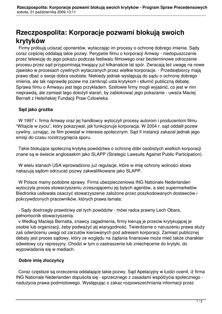 Rzeczpospolita: Korporacje pozwami blokują swoich krytyków - Program Spraw Precedensowych sobota, 31 października 2009 13:11 Rzeczpospolita: Korporacje pozwami blokują swoich krytyków Firmy próbują uciszać oponentów, wytaczając im procesy o ochronę dobrego imienia. Sądy coraz częściej oddalają takie pozwy. Perypetie filmu o korporacji Amway - niedopuszczenie przez telewizję do jego pokazu podczas festiwalu filmowego oraz bezterminowe odroczenie procesu przez sąd przypominają trwający już kilkanaście lat spór. Zwracają też uwagę na nowe zjawisko w procesach cywilnych wytaczanych przez wielkie korporacje. - Przedsiębiorcy mają prawo dbać o swoje dobra osobiste. Niekiedy jednak występują do sądu o ochronę dobrego imienia, ale tak naprawdę pozew ma zamknąć usta krytykom i stłumić publiczną debatę. Sprawa filmu o Amwayu jest tego przykładem. Szefowie firmy mogli wyjaśnić, co jest w nim nieprawdą, ale zamiast tego dołożyli starań, by zablokować jego pokazanie - uważa Maciej Bernatt z Helsińskiej Fundacji Praw Człowieka. Sąd jako groźba W 1997 r. firma Amway oraz jej handlowcy wytoczyli procesy autorom i producentom filmu “Witajcie w życiu”, który pokazywał, jak funkcjonuje korporacja. W 2004 r. sąd oddalił pozew cywilny, uznając, że film powstał w interesie społecznym. Sąd II instancji zakazał jednak jego emisji do czasu rozstrzygnięcia sporu. Takie blokujące społeczną krytykę powództwa o ochronę dóbr osobistych wielkich korporacji znane są w świecie anglosaskim jako SLAPP (Strategic Lawsuits Against Public Participation). W wielu stanach USA wprowadzono już regulacje, które w imię ochrony wolności słowa nakazują sądom odrzucać pozwy zakwalifikowane jako SLAPP. W Polsce mamy podobne sprawy. Firma ubezpieczeniowa ING Nationale Nederlanden wytoczyła proces stowarzyszeniu zrzeszającemu jej byłych agentów, a sieć supermarketów Biedronka usiłowała osaczyć stowarzyszenie założone przez poszkodowanych dostawców i pokrzywdzonych pracowników, których prawa łamała. - Sądy dostrzegły prawdziwy cel tych powództw - mówi radca prawny Lech Obara, pełnomocnik stowarzyszenia. v Według Macieja Bernatta, znawcy zagadnienia, firmy kierują je przeciw krytykującej je osobie lub organizacji, żeby podważyć jej wiarygodność. Twierdzenie o naruszeniu prawa służy zaś odwróceniu uwagi od zarzutów kierowanych pod adresem korporacji. Zamiast publicznej debaty jest proces sądowy, który ze względu na żądania finansowe może mieć także charakter odwetowy czy represyjny. Chodzi w tym o zastraszenie lub zniechęcenie do krytyki, do wypowiadania się w mediach. Dobre imię złoczyńcy Coraz częstsze są orzeczenia oddalające takie pozwy. Sąd Apelacyjny w Łodzi ocenił, iż firma ING Nationale Nederlanden dopuściła się - sprzecznego z zasadami współżycia społecznego nadużycia prawa podmiotowego. Występując o zakaz rozpowszechniania informacji przez 1/2 Rzeczpospolita: Korporacje pozwami blokują swoich krytyków - Program Spraw Precedensowych sobota, 31 października 2009 13:11 jakoby naruszających jej dobre imię, chciała bowiem uniemożliwić stowarzyszeniu przedstawianie krytycznej oceny jej postępowania. Z kolei w jednej z kilku spraw z powództwa Biedronki (wszystkie przegrała) Sąd Apelacyjny w Lublinie stwierdził w styczniu 2009 r., że sieć nie może domagać się ochrony swoich dóbr osobistych, jeżeli - wykorzystując pracowników i kontrahentów, co sąd nazwał “niecnym postępowaniem” - sama narusza zasady współżycia społecznego. Uznał, że celem powództwa nie było uzyskanie ochrony sądowej, lecz powstrzymanie niewygodnej aktywności stowarzyszenia: krytyki i nagłaśniania negatywnych aspektów działalności firmy. opinia Bartosz Krużewski, adwokat w kancelarii Clifford Chance Nie zgadzam się z tezą, że zamożne korporacje, wykorzystując łatwiejszy dostęp do dobrych prawników, dławią debatę, ponieważ pracowników czy stowarzyszeń nie stać na odpowiednią obronę. Korporacje korzystają ze swoich dobrych praw. Rozwiązaniem nie jest poszukiwanie procesowych czy materialnoprawnych ograniczeń powództw o ochronę dóbr osobistych (np. poprzez jakieś nadzwyczajne wykorzystywanie zasady nadużycia prawa), ale stworzenie systemu pomocy prawnej, który zniweluje różnice w dostępie do adwokatów. Robi to z powodzeniem Helsińska Fundacja Praw Człowieka w Programie Spraw Precedensowych. Mam nadzieję, że tak jak np. w Stanach Zjednoczonych będą powstawały kolejne organizacje zainteresowane wspieraniem merytorycznym i finansowym tzw. sporów (z ich punktu widzenia) strategicznych. Ireneusz Walencik Rzeczpospolita Joomla SEF URLs by Artio 2/2