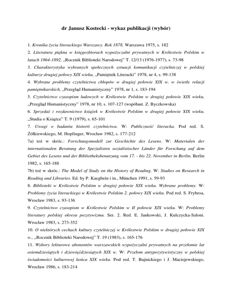 dr Janusz Kostecki - wykaz publikacji (wybór) 1. Kronika życia literackiego Warszawy. Rok 1878, Warszawa 1975, s. 182 2. Literatura piękna w księgozbiorach wypożyczalni prywatnych w Królestwie Polskim w latach 1864-1892, „Rocznik Biblioteki Narodowej” T. 12/13 (1976-1977), s. 73-98 3. Charakterystyka wybranych społecznych sytuacji komunikacji czytelniczej w polskiej kulturze drugiej połowy XIX wieku, „Pamiętnik Literacki” 1978, nr 4, s. 99-138 4. Wybrane problemy czytelnictwa chłopów w drugiej połowie XIX w. w świetle relacji pamiętnikarskich, „Przegląd Humanistyczny” 1978, nr 1, s. 183-194 5. Czytelnictwo czasopism ludowych w Królestwie Polskim w drugiej połowie XIX wieku, „Przegląd Humanistyczny” 1978, nr 10, s. 107-127 (współaut. Z. Byczkowska) 6. Sprzedaż i rozdawnictwo książek w Królestwie Polskim w drugiej połowie XIX wieku, „Studia o Książce” T. 9 (1979), s. 65-101 7. Uwagi o badaniu historii czytelnictwa. W: Publiczność literacka. Pod red. S. Żółkiewskiego, M. Hopfinger, Wrocław 1982, s. 177-212 7a) toż w skróc.: Forschungsmodell zur Geschichte des Lesens. W: Materialen der internationalen Beratung der Spezialisten sozialistischer Länder für Forschung auf dem Gebiet des Lesens und der Bibliotheksbenutzung vom 17. - bis 22. November in Berlin, Berlin 1982, s. 165-188 7b) toż w skróc.: The Model of Study on the History of Reading. W: Studies on Research in Reading and Libraries. Ed. by P. Kaegbein i in., München 1991, s. 59-93 8. Biblioteki w Królestwie Polskim w drugiej połowie XIX wieku. Wybrane problemy. W: Problemy życia literackiego w Królestwie Polskim 2. połowy XIX wieku. Pod red. S. Frybesa, Wrocław 1983, s. 93-136 9. Czytelnictwo czasopism w Królestwie Polskim w II połowie XIX wieku. W: Problemy literatury polskiej okresu pozytywizmu. Ser. 2. Red. E. Jankowski, J. Kulczycka-Saloni. Wrocław 1983, s. 273-352 10. O niektórych cechach kultury czytelniczej w Królestwie Polskim w drugiej połowie XIX w., „Rocznik Biblioteki Narodowej” T. 19 (1983), s. 165-176 11. Wybory lekturowe abonentów warszawskich wypożyczalni prywatnych na przełomie lat osiemdziesiątych i dziewięćdziesiątych XIX w. W: Przełom antypozytywistyczny w polskiej świadomości kulturowej końca XIX wieku. Pod red. T. Bujnickiego i J. Maciejewskiego, Wrocław 1986, s. 183-214 12. Drukarnie w Królestwie Polskim w latach 70. XIX w. Wielkość i charakter produkcji., „Rocznik Biblioteki Narodowej" T. 25 (1989), s. 213-234 (współaut. M. Rowicka) 13. Otwartość czy izolacja? Wydawnictwa importowane w Królestwie Polskim w latach 18711900. W: Instytucje – publiczność – sytuacje lektury. Studia z historii czytelnictwa. T. 1. Pod. red. J. Kosteckiego, Warszawa 1989, s. 68-105 14. O czytelniczych losach twórczości Józefa I. Kraszewskiego w XIX wieku. W: Instytucje – publiczność – sytuacje lektury. Studia z historii czytelnictwa. T. 2. Pod red. J. Kosteckiego, Warszawa 1990, s. 144-171 15. Uwagi o kształceniu bibliotekarzy na poziomie średnim. W: Bibliotekarze, zawód, osobowość, kwalifikacje, Warszawa 1990, s. 92-100 16. Edukacja literacka czytelników galicyjskich pism dla ludu w II połowie XIX w. W: Instytucje – publiczność – sytuacje lektury. Studia z historii czytelnictwa. T. 3. Pod red. J. Kosteckiego, Warszawa 1991, s. 74-97 (współaut. Z. Byczkowska) 17. How book publishing has mirrored modern Polish history, “Logos” 1991, No. 2 18. Produkcja wydawnicza Królestwa Polskiego w drugiej połowie lat siedemdziesiątych XIX w. W: Instytucje – publiczność - sytuacje lektury. Studia z historii czytelnictwa. T. 4. Pod red. J. Kosteckiego, Warszawa 1992, s. 88-152 (współaut. M. Rowicka) 19. Ruch wydawniczy na ziemiach polskich (1877-1986). W: Instytucje – publiczność – sytuacje lektury. Studia z historii czytelnictwa. T. 4. Pod red. J. Kosteckiego, Warszawa 1992, s. 153-224 20. Dozwoleno s iskluczenijem. Ingerencje rosyjskiej cenzury zagranicznej w latach 18691900. W: Piśmiennictwo – systemy kontroli – obiegi alternatywne T. 1. Pod red. J. Kosteckiego i A. Brodzkiej, Warszawa 1992, s. 269-297 (współaut. M. Rowicka) 21. Dziewiętnastowieczne piśmiennictwo polskie w ocenie środowisk opiniotwórczych końca ubiegłego stulecia. W: Książka pokolenia. W kręgu lektur polskich doby postyczniowej. Pod. red. E. Paczoskiej, J. Sztachelskiej, Białystok 1994, s. 186-199 22. O niektórych problemach historyka czytelnictwa. W: Instytucje - publiczność - sytuacje lektury. Studia z historii czytelnictwa. T. 5. Pod red. J. Kosteckiego, Warszawa 1994, s. 296306 23. Ruch wydawniczy. W: Słownik literatury polskiej XX wieku. Zespół red. A. Brodzka i in., Wrocław 1994 24. O niektórych problemach kształcenia bibliotekarzy na poziomie średnim. W: Kształcenie bibliotekarzy dla przyszłości. Materiały z Ogólnopolskiej Konferencji Stowarzyszenia Bibliotekarzy Polskich, Jachranka k. Warszawy 22-24 października 1995, Warszawa 1996, s. 45-53 25. Badania dziejów czytelnictwa, „Biuletyn Informacyjny Biblioteki Narodowej” 1996, nr 3/4 26. Biblioteki w zaborze rosyjskim w powieściach realistycznych II połowy XIX wieku. W: Biblioteki i książki w literaturze. Red. nauk. K. Bednarska-Ruszajowa, Kraków 1998, s. 75-91 (współaut. M. Rowicka) 27. Warianty wydawnicze jako reakcja na ingerencje cenzury rosyjskiej w II połowie XIX w. W: Trzy pokolenia. Pamięci profesor Janiny Kulczyckiej-Saloni, Warszawa 1998 28. Cenzura. W: Literatura polska XX wieku. Przewodnik encyklopedyczny. T. 1, Warszawa 1999 29. Ruch wydawniczy. W: Literatura polska XX w. Przewodnik encyklopedyczny. T. 2, Warszawa 2000 30. Institutions - the Public - Reading Matter. Studies into the History of Reading, “Polish Libraries Today” Vol. 5 (2001), s. 115-117 31. Materiały do dziejów carskiej cenzury zagranicznej (1830-1914), „Biuletyn Informacyjny Biblioteki Narodowej” 2001, nr 1, s. 22-24 32. Publikacje importowane na 