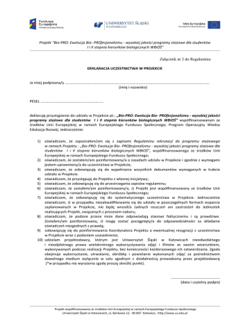 Projekt "Bio-PRO: Ewolucja Bio- PROfesjonalizmu - wysokiej jakości programy stażowe dla studentów I i II stopnia kierunków biologicznych WBiOŚ" Załącznik nr 2 do Regulaminu DEKLARACJA UCZESTNICTWA W PROJEKCIE Ja niżej podpisana/y ………………………………………………….….……..…………………………….…………...………………………… (imię i nazwisko) PESEL ……………………………………………………….. deklaruję przystąpienie do udziału w Projekcie pt.: „Bio-PRO: Ewolucja Bio- PROfesjonalizmu - wysokiej jakości programy stażowe dla studentów I i II stopnia kierunków biologicznych WBiOŚ” współfinansowanym ze środków Unii Europejskiej w ramach Europejskiego Funduszu Społecznego; Program Operacyjny Wiedza Edukacja Rozwój. Jednocześnie: 1) oświadczam, że zapoznałem/am się z zapisami Regulaminu rekrutacji do programu stażowego w ramach Projektu : „Bio-PRO: Ewolucja Bio- PROfesjonalizmu - wysokiej jakości programy stażowe dla studentów I i II stopnia kierunków biologicznych WBiOŚ”, współfinansowanego ze środków Unii Europejskiej w ramach Europejskiego Funduszu Społecznego; 2) oświadczam, że zostałem/am poinformowany/a o zasadach udziału w Projekcie i zgodnie z wymogami jestem uprawniony/a do uczestnictwa w Projekcie; 3) oświadczam, że zobowiązuję się do wypełniania wszystkich dokumentów wymaganych w trakcie udziału w Projekcie. 4) oświadczam, że przystępuję do Projektu z własnej inicjatywy; 5) oświadczam, że zobowiązuję się do przestrzegania zapisów regulaminu; 6) oświadczam, że zostałem/am poinformowany/a, iż Projekt jest współfinansowany ze środków Unii Europejskiej w ramach Europejskiego Funduszu Społecznego; 7) oświadczam, że zobowiązuję się do systematycznego uczestnictwa w Projekcie. Jednocześnie oświadczam, iż w przypadku niezakwalifikowania się do udziału w poszczególnych formach wsparcia zaplanowanych w Projekcie, nie będę wnosił/a żadnych roszczeń ani zastrzeżeń do Jednostek realizujących Projekt, związanych z procesem naboru; 8) oświadczam, że podane przeze mnie dane odpowiadają stanowi faktycznemu i są prawdziwe. Zostałem/am poinformowany, iż mogę zostać pociągnięty/a do odpowiedzialności za składanie oświadczeń niezgodnych z prawdą; 9) zobowiązuję się do poinformowania Koordynatora Projektu o ewentualnej rezygnacji z uczestnictwa w Projekcie wraz z podaniem uzasadnienia; 10) udzielam projektodawcy, którym jest Uniwersytet Śląski w Katowicach nieodwołalnego i nieodpłatnego prawa wielokrotnego wykorzystywania zdjęć i filmów ze swoim wizerunkiem, wykonywanych podczas realizacji Projektu, bez konieczności każdorazowego ich zatwierdzania. Zgoda obejmuje wykorzystanie, utrwalanie, obróbkę i powielanie wykonanych zdjęć za pośrednictwem dowolnego medium wyłącznie w celu zgodnym z działalnością prowadzoną przez projektodawcę (*w przypadku nie wyrażenia zgody proszę skreślić punkt). …………………………………………… (data i czytelny podpis) Projekt współfinansowany ze środków Unii Europejskiej w ramach Europejskiego Funduszu Społecznego Uniwersytet Śląski w Katowicach, ul. Bankowa 12, 40-007 Katowice, http://www.us.edu.pl