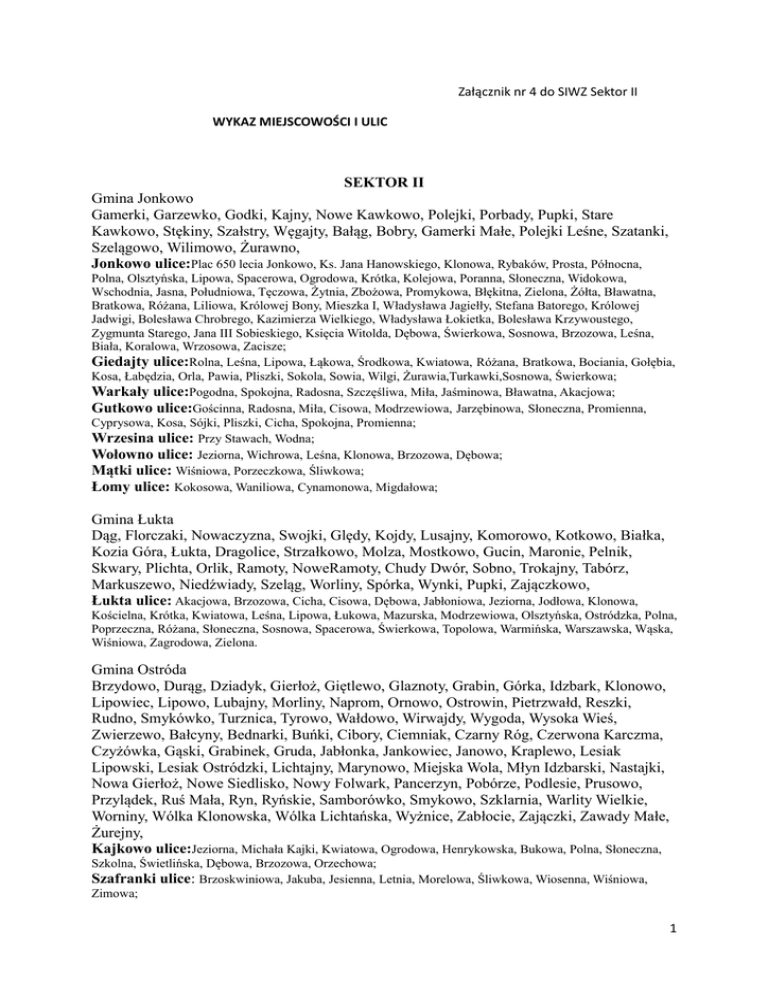 Załącznik nr 4 do SIWZ Sektor II WYKAZ MIEJSCOWOŚCI I ULIC SEKTOR II Gmina Jonkowo Gamerki, Garzewko, Godki, Kajny, Nowe Kawkowo, Polejki, Porbady, Pupki, Stare Kawkowo, Stękiny, Szałstry, Węgajty, Bałąg, Bobry, Gamerki Małe, Polejki Leśne, Szatanki, Szelągowo, Wilimowo, Żurawno, Jonkowo ulice:Plac 650 lecia Jonkowo, Ks. Jana Hanowskiego, Klonowa, Rybaków, Prosta, Północna, Polna, Olsztyńska, Lipowa, Spacerowa, Ogrodowa, Krótka, Kolejowa, Poranna, Słoneczna, Widokowa, Wschodnia, Jasna, Południowa, Tęczowa, Żytnia, Zbożowa, Promykowa, Błękitna, Zielona, Żółta, Bławatna, Bratkowa, Różana, Liliowa, Królowej Bony, Mieszka I, Władysława Jagiełły, Stefana Batorego, Królowej Jadwigi, Bolesława Chrobrego, Kazimierza Wielkiego, Władysława Łokietka, Bolesława Krzywoustego, Zygmunta Starego, Jana III Sobieskiego, Księcia Witolda, Dębowa, Świerkowa, Sosnowa, Brzozowa, Leśna, Biała, Koralowa, Wrzosowa, Zacisze; Giedajty ulice:Rolna, Leśna, Lipowa, Łąkowa, Środkowa, Kwiatowa, Różana, Bratkowa, Bociania, Gołębia, Kosa, Łabędzia, Orla, Pawia, Pliszki, Sokola, Sowia, Wilgi, Żurawia,Turkawki,Sosnowa, Świerkowa; Warkały ulice:Pogodna, Spokojna, Radosna, Szczęśliwa, Miła, Jaśminowa, Bławatna, Akacjowa; Gutkowo ulice:Gościnna, Radosna, Miła, Cisowa, Modrzewiowa, Jarzębinowa, Słoneczna, Promienna, Cyprysowa, Kosa, Sójki, Pliszki, Cicha, Spokojna, Promienna; Wrzesina ulice: Przy Stawach, Wodna; Wołowno ulice: Jeziorna, Wichrowa, Leśna, Klonowa, Brzozowa, Dębowa; Mątki ulice: Wiśniowa, Porzeczkowa, Śliwkowa; Łomy ulice: Kokosowa, Waniliowa, Cynamonowa, Migdałowa; Gmina Łukta Dąg, Florczaki, Nowaczyzna, Swojki, Ględy, Kojdy, Lusajny, Komorowo, Kotkowo, Białka, Kozia Góra, Łukta, Dragolice, Strzałkowo, Molza, Mostkowo, Gucin, Maronie, Pelnik, Skwary, Plichta, Orlik, Ramoty, NoweRamoty, Chudy Dwór, Sobno, Trokajny, Tabórz, Markuszewo, Niedźwiady, Szeląg, Worliny, Spórka, Wynki, Pupki, Zajączkowo, Łukta ulice: Akacjowa, Brzozowa, Cicha, Cisowa, Dębowa, Jabłoniowa, Jeziorna, Jodłowa, Klonowa, Kościelna, Krótka, Kwiatowa, Leśna, Lipowa, Łukowa, Mazurska, Modrzewiowa, Olsztyńska, Ostródzka, Polna, Poprzeczna, Różana, Słoneczna, Sosnowa, Spacerowa, Świerkowa, Topolowa, Warmińska, Warszawska, Wąska, Wiśniowa, Zagrodowa, Zielona. Gmina Ostróda Brzydowo, Durąg, Dziadyk, Gierłoż, Giętlewo, Glaznoty, Grabin, Górka, Idzbark, Klonowo, Lipowiec, Lipowo, Lubajny, Morliny, Naprom, Ornowo, Ostrowin, Pietrzwałd, Reszki, Rudno, Smykówko, Turznica, Tyrowo, Wałdowo, Wirwajdy, Wygoda, Wysoka Wieś, Zwierzewo, Bałcyny, Bednarki, Buńki, Cibory, Ciemniak, Czarny Róg, Czerwona Karczma, Czyżówka, Gąski, Grabinek, Gruda, Jabłonka, Jankowiec, Janowo, Kraplewo, Lesiak Lipowski, Lesiak Ostródzki, Lichtajny, Marynowo, Miejska Wola, Młyn Idzbarski, Nastajki, Nowa Gierłoż, Nowe Siedlisko, Nowy Folwark, Pancerzyn, Pobórze, Podlesie, Prusowo, Przylądek, Ruś Mała, Ryn, Ryńskie, Samborówko, Smykowo, Szklarnia, Warlity Wielkie, Worniny, Wólka Klonowska, Wólka Lichtańska, Wyżnice, Zabłocie, Zajączki, Zawady Małe, Żurejny, Kajkowo ulice:Jeziorna, Michała Kajki, Kwiatowa, Ogrodowa, Henrykowska, Bukowa, Polna, Słoneczna, Szkolna, Świetlińska, Dębowa, Brzozowa, Orzechowa; Szafranki ulice: Brzoskwiniowa, Jakuba, Jesienna, Letnia, Morelowa, Śliwkowa, Wiosenna, Wiśniowa, Zimowa; 1 Kątno ulice: Jarzębinowa, Jeziorna, Kwiatowa, Łąkowa; Wałdowo ulice: Bursztynowa, Diamentowa, Perłowa, Rubinowa, Szafirowa, Szmaragdowa, Wiejska, Wypoczynkowa, Złota; Samborowo ulice: Brzozowa, Długa, Dworcowa, Krótka, Kwiatowa, Leśna, Łąkowa, Miła, Modrzewiowa, Ogrodowa, Ostródzka, Polna, Przemysłowa, Piaskowa, Sosnowa, Słoneczna, Sportowa, Spokojna, Spółdzielcza, Szkolna, Świerkowa, Tartaczna, Zatorze; Stare Jabłonki ulice: Akacjowa, Kolejowa, Kościelna, Ogrodowa, Olsztyńska, Piękna, Pocztowa, Polna, Radosna, Słoneczna Polana, Brzozowa, Sosnowa, Spacerowa, Sportowa, Tęczowa, Turystyczna, Wczasowa; Szyldak ulice: Gdańska, Szkolna, Parkowa, Leśna, Spacerowa, Pocztowa; Międzylesie ulice: Bławatna, Boczna, Gajowa, Grzybowa, Jagodowa, Jeziorna, Lipowa, Słoneczna, Sosnowa, Wrzosowa; Gmina Grunwald Domkowo, Dylewo, Frygnowo, Gierzwałd, Glądy, Góry Lubiańskie, Grunwald, Kiersztanowo, Kiersztanówko, Kitnowo, Łodwigowo, Marcinkowo, Mielno, Pacółtowo, Rychnowo, Rychnowska Wola, Stębark, Szczepankowo, Zapieka, Zybułtowo, Dąbrowo, Dylewko, Grabiczki, Grunwald (osada), Jędrychowo, Kalwa, Korsztyn, Lipowa Góra, Lubian, Lubianek, Łącko, Omin, Pacółtówko, Rzepki, Tymawa, Ulnowo, Wróble Gmina Olsztynek Ameryka, Dąb, Drwęck, Elgnówko, Gaj, Jemiołowo, Królikowo, Kunki, Kurki, Lichtajny, Lipowo Kurkowskie, Marózek, Łutynowo, Makruty, Mańki, Maróz, Mierki, Kołatek, Mycyny, Nowa Wieś Ostródzka, Pawłowo, Lutek, Platyny, Samagowo, Sudwa, Swaderki, Orzechowo, Selwa, Świerkocin, Tomaszyn, Waplewo, Warlity Małe, Wigwałd, Smolanek, Wilkowo, Witramowo, Witułty, Zawady, Ząbie, Zezuty, Gębiny, Olsztynek ulice: 22 Lipca, Agrestowa, Akacjowa, Brzozowa, Chopina, Cicha, Daszyńskiego, Dębowa, Długosza, Emila von Behringa, Floriana, Gdańska, Głogowa, , Górna, Grabowa, Grunwaldzka, Inwalidów, Jagodowa, Jana Pawła II, Jemiołowska, Jeziorna, Kajki, Kamienna, Kasztanowa, Klikowicza, Klonowa, Kochanowskiego, Kolejowa, Kopernika, Kościuszki, Krótka, Krzywa, Księżycowa, Leśna, Leśników, Leszczynowa, Lipowa, Malinowa, Mały Rynek, Mazurska, Mickiewicza, Mierkowska, Morelowa, Mrongowiusza, Nowowiejskiego, Ogrodowa, Olsztyńska, Ostródzka, Owocowa, Park, Parkowa, Pionierów, Polna, Poranna, Porzeczkowa, Pułaskiego, Ratusz, Ratuszowa, Rynek, Sielska, Sienkiewicza, Składowa, Słoneczna, Sosnowa, Sportowa, Staromiejska, Strażacka, Świerczewskiego, Świerkowa, Szkolna, Towarowa, Wandy Pieniężnej, Warszawska, Wąska, Wilcza, Wiśniowa, Wrzosowa, Władysława Jegiełły, Wodociągowa, Zamkowa, Żero