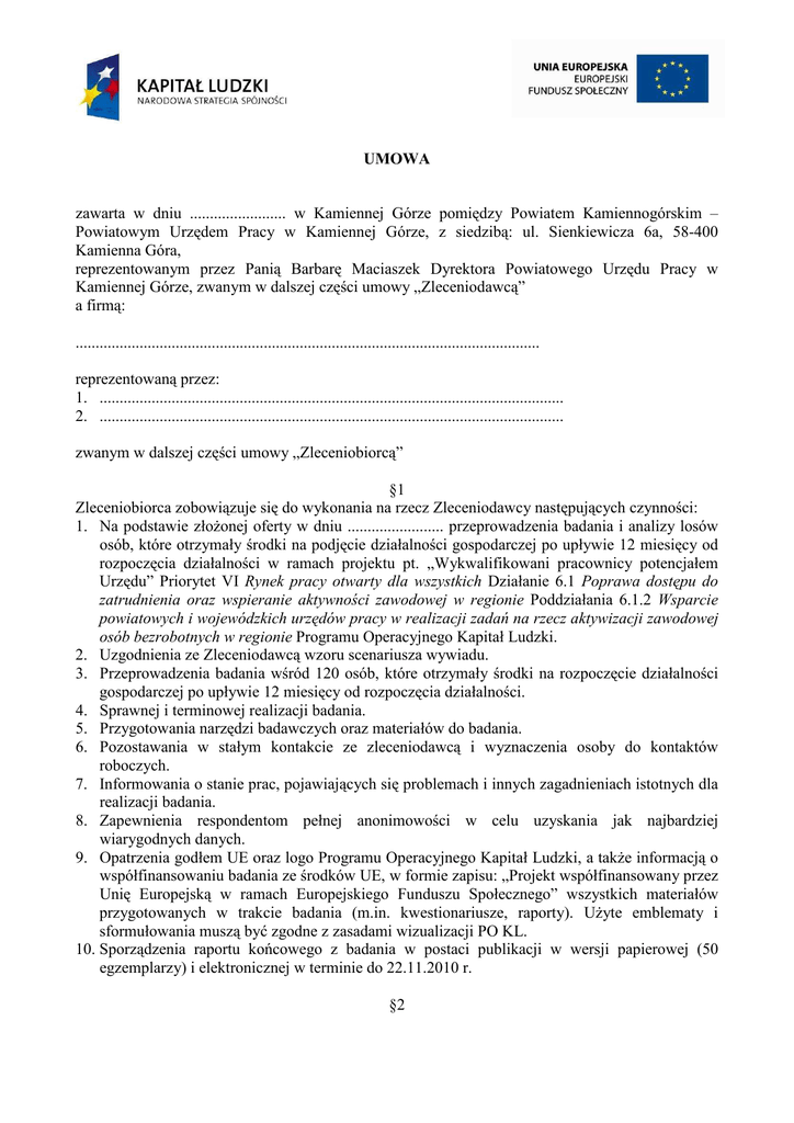 UMOWA zawarta w dniu ........................ w Kamiennej Górze pomiędzy Powiatem Kamiennogórskim – Powiatowym Urzędem Pracy w Kamiennej Górze, z siedzibą: ul. Sienkiewicza 6a, 58-400 Kamienna Góra, reprezentowanym przez Panią Barbarę Maciaszek Dyrektora Powiatowego Urzędu Pracy w Kamiennej Górze, zwanym w dalszej części umowy „Zleceniodawcą” a firmą: .................................................................................................................... reprezentowaną przez: 1. .................................................................................................................... 2. .................................................................................................................... zwanym w dalszej części umowy „Zleceniobiorcą” §1 Zleceniobiorca zobowiązuje się do wykonania na rzecz Zleceniodawcy następujących czynności: 1. Na podstawie złożonej oferty w dniu ........................ przeprowadzenia badania i analizy losów osób, które otrzymały środki na podjęcie działalności gospodarczej po upływie 12 miesięcy od rozpoczęcia działalności w ramach projektu pt. „Wykwalifikowani pracownicy potencjałem Urzędu” Priorytet VI Rynek pracy otwarty dla wszystkich Działanie 6.1 Poprawa dostępu do zatrudnienia oraz wspieranie aktywności zawodowej w regionie Poddziałania 6.1.2 Wsparcie powiatowych i wojewódzkich urzędów pracy w realizacji zadań na rzecz aktywizacji zawodowej osób bezrobotnych w regionie Programu Operacyjnego Kapitał Ludzki. 2. Uzgodnienia ze Zleceniodawcą wzoru scenariusza wywiadu. 3. Przeprowadzenia badania wśród 120 osób, które otrzymały środki na rozpoczęcie działalności gospodarczej po upływie 12 miesięcy od rozpoczęcia działalności. 4. Sprawnej i terminowej realizacji badania. 5. Przygotowania narzędzi badawczych oraz materiałów do badania. 6. Pozostawania w stałym kontakcie ze zleceniodawcą i wyznaczenia osoby do kontaktów roboczych. 7. Informowania o stanie prac, pojawiających się problemach i innych zagadnieniach istotnych dla realizacji badania. 8. Zapewnienia respondentom pełnej anonimowości w celu uzyskania jak najbardziej wiarygodnych danych. 9. Opatrzenia godłem UE oraz logo Programu Operacyjnego Kapitał Ludzki, a także informacją o współfinansowaniu badania ze środków UE, w formie zapisu: „Projekt współfinansowany przez Unię Europejską w ramach Europejskiego Funduszu Społecznego” wszystkich materiałów przygotowanych w trakcie badania (m.in. kwestionariusze, raporty). Użyte emblematy i sformułowania muszą być zgodne z zasadami wizualizacji PO KL. 10. Sporządzenia raportu końcowego z badania w postaci publikacji w wersji papierowej (50 egzemplarzy) i elektronicznej w terminie do 22.11.2010 r. §2 1. Do realizacji zlecenia Zleceniobiorca bezpośrednio zaangażuje wymienione niżej osoby o wiedzy i doświadczeniu związanym z problematyką zatrudnienia oraz rynku pracy: − …………………………………. − …………………………………. 2. Zleceniobiorca nie będzie mógł powierzyć wykonania badania innym osobom niż te, które zostały wykazane w ust. 1. W przypadku niedostępności osób przewidzianych do realizacji zlecenia wykazanych w ust.1, Zleceniobiorca zobowiązany będzie zapewnić zastępstwo przez osobę lub osoby o wiedzy i doświadczeniu związanym z problematyką zatrudnienia oraz rynku pracy w stopniu równym lub większym od wiedzy i doświadczenia związanego z problematyką zatrudnienia oraz rynku pracy osoby lub osób zastępowanych. Zastępca będzie mógł przystąpić do realizacji zlecenia przewidzianego w umowie po uzyskaniu przez Zleceniobiorcę pisemnej zgody ze strony Zleceniodawcy. Występując z pismem o zmianę kadry realizującej badanie, Zleceniobiorca zobowiązany będzie wskazać: − przyczyny niedostępności osoby(ób) zastępowanej(ych), − wskazać Zleceniodawcy czynności, które będą przez tą osobę(y) wykonywane, − kogo będzie(ą) miała(y) ona(e) zastąpić, − okres zastępstwa. 3. W razie naruszenia przez Zleceniobiorcę postanowień ust. 2 Zleceniodawca może rozwiązać umowę ze skutkiem natychmiastowym i Zleceniobiorca nie może żądać pokrycia kosztów badania w części proporcjonalnej do stopnia wykonania zlecenia. §3 Zleceniodawca zawrze ze Zleceniobiorcą umowę powierzenia przetwarzania danych osobowych, stanowiącą załącznik nr 1 do niniejszej umowy. §4 1. Z tytułu wykonywania powierzonych czynności Zleceniobiorca otrzyma od Zleceniodawcy wynagrodzenie zgodnie z ofertą : tj. ........................................... zł brutto. 2. Wynagrodzenie zostanie wypłacone na podstawie wystawionej przez Zleceniobiorcę faktury VAT w terminie 14 dni od daty otrzymania przez Zleceniodawcę raportu końcowego z przeprowadzonego badania w postaci publikacji w wersji papierowej (50 egzemplarzy) i elektronicznej. §5 Umowa została zawarta na czas określony, tj. od dnia podpisania do dnia 22.11.2010 r. §6 1. Zleceniobiorca zobowiązuję się wykonywać powierzone czynności z należytą starannością. 2. Zleceniobiorca jest odpowiedzialny wobec Zleceniodawcy za niewykonanie lub nienależyte wykonanie umowy, chyba że niewykonanie lub nienależyte wykonanie umowy jest następstwem okoliczności, za które nie ponosi odpowiedzialności. Zleceniobiorca ponosi odpowiedzialność za szkodę wynikającą z niewykonania lub nienależytego wykonania przedmiotowej umowy na zasadach określonych w Kodeksie Cywilnym. 3. Zleceniobiorca zobowiązuję się nie powierzać osobie trzeciej wykonania czynności określonych w § 1 będących przedmiotem niniejszej umowy, bez uprzedniego zezwolenia Zleceniodawcy udzielonego na piśmie. §7 1. W przypadku nie wykonania zobowiązania przez Zleceniobiorcę w terminie określonym w § 5 zobowiązany on będzie do uiszczenia na rzecz Zleceniodawcy kary umownej w wysokości 2 % wynagrodzenia za każdy dzi