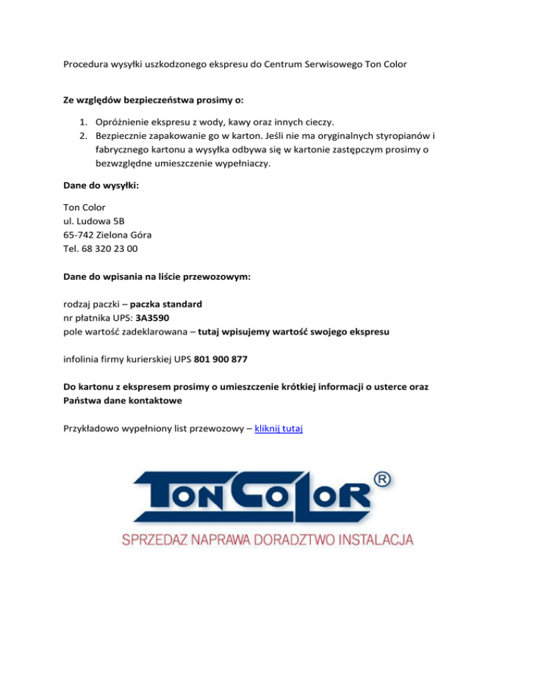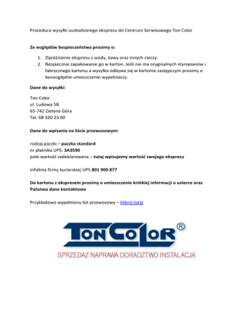 Procedura wysyłki uszkodzonego ekspresu do Centrum Serwisowego Ton Color Ze względów bezpieczeostwa prosimy o: 1. Opróżnienie ekspresu z wody, kawy oraz innych cieczy. 2. Bezpiecznie zapakowanie go w karton. Jeśli nie ma oryginalnych styropianów i fabrycznego kartonu a wysyłka odbywa się w kartonie zastępczym prosimy o bezwzględne umieszczenie wypełniaczy. Dane do wysyłki: Ton Color ul. Ludowa 5B 65-742 Zielona Góra Tel. 68 320 23 00 Dane do wpisania na liście przewozowym: rodzaj paczki – paczka standard nr płatnika UPS: 3A3590 pole wartośd zadeklarowana – tutaj wpisujemy wartośd swojego ekspresu infolinia firmy kurierskiej UPS 801 900 877 Do kartonu z ekspresem prosimy o umieszczenie krótkiej informacji o usterce oraz Paostwa dane kontaktowe Przykładowo wypełniony list przewozowy – kliknij tutaj