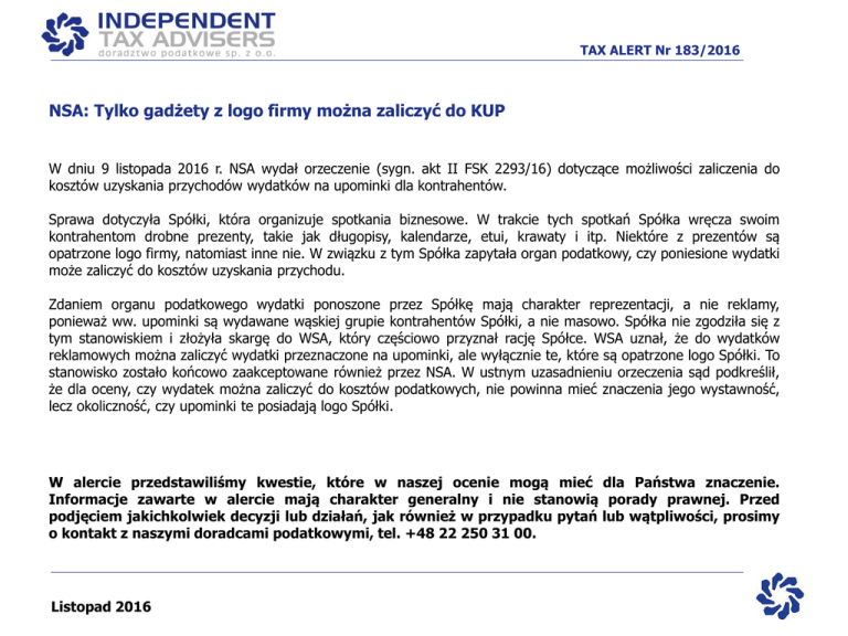 TAX ALERT Nr 183/2016 NSA: Tylko gadżety z logo firmy można zaliczyć do KUP W dniu 9 listopada 2016 r. NSA wydał orzeczenie (sygn. akt II FSK 2293/16) dotyczące możliwości zaliczenia do kosztów uzyskania przychodów wydatków na upominki dla kontrahentów. Sprawa dotyczyła Spółki, która organizuje spotkania biznesowe. W trakcie tych spotkań Spółka wręcza swoim kontrahentom drobne prezenty, takie jak długopisy, kalendarze, etui, krawaty i itp. Niektóre z prezentów są opatrzone logo firmy, natomiast inne nie. W związku z tym Spółka zapytała organ podatkowy, czy poniesione wydatki może zaliczyć do kosztów uzyskania przychodu. Zdaniem organu podatkowego wydatki ponoszone przez Spółkę mają charakter reprezentacji, a nie reklamy, ponieważ ww. upominki są wydawane wąskiej grupie kontrahentów Spółki, a nie masowo. Spółka nie zgodziła się z tym stanowiskiem i złożyła skargę do WSA, który częściowo przyznał rację Spółce. WSA uznał, że do wydatków reklamowych można zaliczyć wydatki przeznaczone na upominki, ale wyłącznie te, które są opatrzone logo Spółki. To stanowisko zostało końcowo zaakceptowane również przez NSA. W ustnym uzasadnieniu orzeczenia sąd podkreślił, że dla oceny, czy wydatek można zaliczyć do kosztów podatkowych, nie powinna mieć znaczenia jego wystawność, lecz okoliczność, czy upominki te posiadają logo Spółki. W alercie przedstawiliśmy kwestie, które w naszej ocenie mogą mieć dla Państwa znaczenie. Informacje zawarte w alercie mają charakter generalny i nie stanowią porady prawnej. Przed podjęciem jakichkolwiek decyzji lub działań, jak również w przypadku pytań lub wątpliwości, prosimy o kontakt z naszymi doradcami podatkowymi, tel. +48 22 250 31 00. Listopad 2016