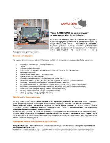 Targi SAMORZĄD po raz pierwszy w sosnowieckim Expo Silesia W dniach 4-6 czerwca 2013 r. w Centrum Targowo – Konferencyjnym Expo Silesia w Sosnowcu odbędą się Targi Usług dla Gmin i Powiatów SAMORZĄD. Wystawa przyjmie formułę spotkania przedstawicieli samorządów terytorialnych z producentami i dostawcami usług pozwalających na usprawnienie i rozwój funkcjonowania gmin i powiatów. Zakres tematyczny Na wystawie będzie można odwiedzić stoiska, na których firmy zaprezentują swoją ofertę w zakresie: energetyki elektrycznej i cieplnej (dostawcy i usługi) systemów oświetleniowych infrastruktury drogowej, zarządzania ruchem, utrzymania ulic i wiaduktów utrzymania czystości budownictwa społecznego / komunalnego budownictwa mieszkaniowego systemów bezpieczeństwa i monitoringu (w tym p.poż.) zagospodarowania przestrzennego (w tym: aranżacja i dbałość o tereny zielone) cyfryzacji i informatyzacji (internet szerokopasmowy, telefonia) placówek oświatowych, kulturalnych i społecznych (sprzęt, usługi, oprogramowanie) transportu publicznego (systemy informacji miejskiej, infrastruktura przystankowa) cmentarzy komunalnych (sprzęt, usługi, oprogramowanie) ochrony zdrowia (sprzęt, usługi, oprogramowanie) edukacji (sprzęt, usługi, oprogramowanie) Wydarzenie towarzyszące Targom towarzyszyć będzie Salon Inwestycji i Rozwoju Regionów INWESTOR będący miejscem gdzie Samorządy Lokalne będą mogły zaprezentować możliwości inwestycyjne własnych regionów. Śląski Związek Gmin i Powiatów zaprasza na Forum samorządowe, w ramach którego zostaną poruszone tematy lokalnej polityki energetycznej oraz prosumenckie (inteligentne) rozwiązania dla samorządu terytorialnego. W tym samym terminie, w ramach uzupełnienia proponowanego przez Organizatora zakresu wystawy, odbędą Targi Aranżacji Przestrzeni Rekreacyjnych dla Dzieci i Dorosłych Plac Zabaw 2013 będące pierwszą w Polsce tego typu imprezą dedykowaną producentom urządzeń do wyposażenia placów zabaw i terenów rekreacyjnych. Specjalna oferta dedykowana wystawcom Targi SAMORZĄD i Salon Inwestor łączy bardzo atrakcyjna oferta cenowa z Targami HydroSielsia, EkoWaste i MELIORACJE: Każda firma, która zdecyduje się na uczestnictwo w obydwu proponowanych wydarzeniach targowych otrzyma: 20 % rabatu od aktualnie obowiązujących cen powierzchni dla Targów Hydrosilesia, EkoWaste i Melioracje 2013 oraz 40% rabatu od aktualnie obowiązujących cen powierzchni dla Targów SAMORZĄD i Salon Inwestor Warunkiem otrzymania powyższych rabatów jest jednoczesne złożenie Formularzy Zgłoszenia na obydwie imprezy Targowe (czerwiec i październik). W celu otrzymania szczegółowych kalkulacji, zachęcamy do kontaktu. Więcej informacji na stronach: www.targisamorzad.pl www.saloninwestor.pl www.targiplaczabaw.pl Kontakt: Michał Wadowski - Menedżer Projektu tel. 32 788 75 27 fax: 32 788 75 02 kom.: 515 220 057 e-mail: [email protected]