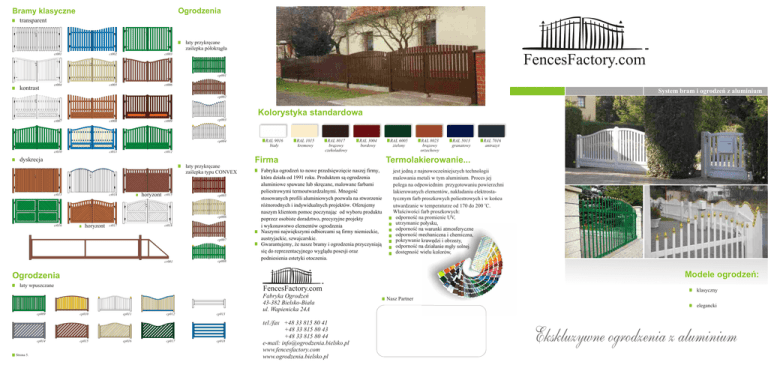 Ogrodzenia Bramy klasyczne transparent ³aty przykrêcane zaœlepka pó³okr¹g³a ct001 ct002 ct003 FencesFactory.com cp001 kontrast ct004 ct005 ct006 System bram i ogrodzeñ z aluminium cp002 Kolorystyka standardowa ct007 ct008 ct009 cp003 cp004 ct010 ct011 ³aty przykrêcane zaœlepka typu CONVEX horyzont ct014 ct015 cp005 cp006 ct016 horyzont RAL 1015 kremowy ct012 dyskrecja ct013 RAL 9016 bia³y ct017 ct018 cp007 cr001 cp008 RAL 8017 br¹zowy czekoladowy RAL 3004 bordowy Firma Fabryka ogrodzeñ to nowe przedsiêwziêcie naszej firmy, która dzia³a od 1991 roku. Produktem s¹ ogrodzenia aluminiowe spawane lub skrêcane, malowane farbami poliestrowymi termoutwardzalnymi. Mnogoœæ stosowanych profili aluminiowych pozwala na stworzenie ró¿norodnych i indywidualnych projektów. Oferujemy naszym klientom pomoc poczynaj¹c od wyboru produktu poprzez osobiste doradztwo, precyzyjne projekty i wykonawstwo elementów ogrodzenia Naszymi najwiêkszymi odbiorcami s¹ firmy niemieckie, austryjackie, szwajcarskie. Gwarantujemy, ¿e nasze bramy i ogrodzenia przyczyniaj¹ siê do reprezentacyjnego wygl¹du posesji oraz podniesienia estetyki otoczenia. RAL 6005 zielony jest jedn¹ z najnowoczeœniejszych technologii malowania metali w tym aluminium. Proces jej polega na odpowiednim przygotowaniu powierzchni lakierowanych elementów, nak³adaniu elektrostatycznym farb proszkowych poliestrowych i w koñcu o utwardzanie w temperaturze od 170 do 200 C. W³aœciwoœci farb proszkowych: odpornoœæ na promienie UV, utrzymanie po³ysku, odpornoœæ na warunki atmosferyczne odpornoœæ mechaniczna i chemiczna, pokrywanie krawêdzi i obrze¿y, odpornoœæ na dzia³anie mg³y solnej. dostêpnoœæ wielu kolorów, FencesFactory.com Fabryka Ogrodzeñ 43-382 Bielsko-Bia³a ul. Wapienicka 24A Strona 5. RAL 7016 antrazyt Modele ogrodzeñ: ³aty wpuszczane cp014 RAL 5013 granatowy Termolakierowanie... Ogrodzenia cp009 RAL 8023 br¹zowy orzechowy cp010 cp015 cp011 cp016 cp012 cp017 klasyczny Nasz Partner elegancki cp013 cp018 tel./fax +48 33 815 80 41 +48 33 815 80 43 +48 33 815 80 44 e-mail: [email protected] www.fencesfactory.com www.ogrodzenia.bielsko.pl Ekskluzywne ogrodzenia z aluminium