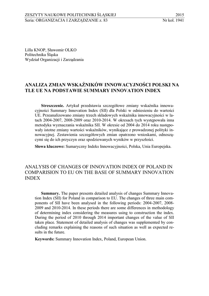 ZESZYTY NAUKOWE POLITECHNIKI ŚLĄSKIEJ Seria: ORGANIZACJA I ZARZĄDZANIE z. 83 2015 Nr kol. 1941 Lilla KNOP, Sławomir OLKO Politechnika Śląska Wydział Organizacji i Zarządzania ANALIZA ZMIAN WSKAŹNIKÓW INNOWACYJNOŚCI POLSKI NA TLE UE NA PODSTAWIE SUMMARY INNOVATION INDEX Streszczenie. Artykuł przedstawia szczegółowe zmiany wskaźnika innowacyjności Summary Innovation Index (SII) dla Polski w odniesieniu do wartości UE. Przeanalizowano zmiany trzech składowych wskaźnika innowacyjności w latach 2004-2007, 2008-2009 oraz 2010-2014. W okresach tych występowała inna metodyka wyznaczania wskaźnika SII. W okresie od 2004 do 2014 roku następowały istotne zmiany wartości wskaźników, wynikające z prowadzonej polityki innowacyjnej. Zestawienia szczegółowych zmian opatrzono wnioskami, odnoszącymi się do ich przyczyn oraz spodziewanych wyników w przyszłości. Słowa kluczowe: Sumaryczny Indeks Innowacyjności, Polska, Unia Europejska. ANALYSIS OF CHANGES OF INNOVATION INDEX OF POLAND IN COMPARISION TO EU ON THE BASE OF SUMMARY INNOVATION INDEX Summary. The paper presents detailed analysis of changes Summary Innovation Index (SII) for Poland in comparison to EU. The changes of three main components of SII have been analysed in the following periods: 2004-2007, 20082009 and 2010-2014. In these periods there are some differences in methodology of determining index considering the measures using to construction the index. During the period of 2010 through 2014 important changes of the value of SII taken place. Statement of detailed analysis of changes was supplemented by concluding remarks explaining the reasons of such situation as well as expected results in the future. Keywords: Summary Innovation Index, Poland, European Union. 308 L. Knop, S. Olko 1. Wstęp Współcześnie o innowacyjności gospodarki mówi się, że jest to zdolność oraz motywacja przedsiębiorców do poszukiwania i wdrażania do praktyki wyników badań naukowych, a także, że jest to proces uczenia się, wymagający gromadzenia wiedzy i informacji użytecznych w działalności przedsiębiorstw [9, s. 378]. Promowanie i wspieranie działalności innowacyjnej krajów członkowskich są jednym z głównych celów polityki gospodarczej Unii Europejskiej. Zawarte wcześniej w Strategii Lizbońskiej i obecnie w Strategii Europa 2020 zapisy podkreślają znacznie innowacji, jako kluczowego czynnika podnoszącego konkurencyjność i inteligentny wzrost, oparty na wiedzy i innowacjach. Prowadzone od lat badania dotyczące oceny poziomu innowacyjności krajów członkowskich UE wskazują, że Polska na tle pozostałych krajów prezentuje się dość stabilnie, z minimalnym trendem prowzrostowym. Celem artykułu jest prezentacja szczegółowych wskaźników rozwoju innowacyjnego Polski na tle średnich wskaźników UE. Badaniami objęto okres 2004-2014, tj. od momentu wejścia Polski do UE do dnia dzisiejszego. Szczegółowe analizy dotyczą jednak okresu 20102014, tj. okresu, który charakteryzuje stabilność wskaźników, które w czasie ulegały częstym zmianom. Jako podstawę badań przyjęto dane zawarte w corocznych raportach European Innovation Scoreboard i Innovation Union Scoreboard, oceniających innowacyjne osiągnięcia państw członkowskich UE bazując na Sumarycznym Indeksie Innowacyjności. 2. Wskaźniki oceny innowacyjności krajów Unii Europejskiej Zaprojektowany przez Komisję Europejską oraz Uniwersytet w Maastricht system wskaźników innowacyjności EIS (European Innovation Scoreboard, a obecnie Innovation Union Scoreboard) obejmuje kraje członkowskie UE, kraje EFTA oraz sporadyczne porównania do USA i Japonii. Stworzony w 1993 roku system Community Innovation Survey opierał się na badaniach statystycznych i obejmował od kilkunastu do ponad 20 wskaźników. W 2001 roku w ramach realizacji Strategii Lizbońskiej połączono wskaźniki European Innovation Scoreboard oraz Innobarometr. Do 2010 roku system wskaźników zmieniał się dwukrotnie, nie licząc zmian w liczbie wskaźników. W okresie 2004-2007 (por. tab. 4) badano kolejno: 22 wskaźniki w 2004 roku, 26 w 20051 roku i 25 wskaźników w latach 2006 i 2007. Ogólnie prowadzone w tym okresie badania obejmowały dwie grupy: wskaźniki wejścia siły napędowe innowacji (5 wskaźników), kreowanie wiedzy (4 wskaźniki) oraz innowacje W 2005 roku w tym obszarze badano jeszcze jeden wskaźnik: wydatki uczelni na B+R, finansowane przez biznes. Wskaźnik ten dla EU wyniósł: 6,6, a dla Polski 6,0. 1 Analiza zmian wskaźników innowacyjności… 309 i przedsiębiorczość (6 wskaźników); wskaźniki wyjścia – wdrożenia (5 wskaźników) i własność intelektualną (5 wskaźników). Ten okres badań innowacyjności krajów UE 2 charakteryzuje się dużą zmiennością wskaźników i trudnością w określeniu dynamiki ich zmian. Zaproponowany w 2008 roku zestaw zmodyfikowanych wskaźników innowacyjności na lata 2008-2009 jest wynikiem krytyki metodologii zastosowanej we wcześniejszych latach. Zarówno H. Holladers i A. Von Cruisen [11], jak i grupa NESTA (Narodowa Fundacja na rzecz Nauki, Techniki i Sztuki w Wielkiej Brytanii) [18] podkreślali, że dotychczasowe podejście było: zbyt statystyczne (korelacyjne) ujęcie innowacyjności dominował model liniowy innowacji, a nie model interaktywny, zbyt duże nastawienie na wysokie technologie, choć innowacje mogą zachodzić niezależnie od stopnia intensywności prac badawczo-rozwojowych, współliniowość – niektóre wskaźniki były i są ze sobą skorelowane, sprawiając, że cała metodologia jest nakierowana na prace B+R, należy pamiętać o rozkładzie funduszy na B+R i innowacje, zgodnie z zasadą, że „…działalność badawczo-rozwojowa to przemiana pieniędzy w wiedzę, a innowacja to przemiana wiedzy w pieniądze”3, brak rynkowych efektów wprowadzanych innowacji oraz pomiar działań przyczyniających się do ich osiągnięcia, problemy z identyfika