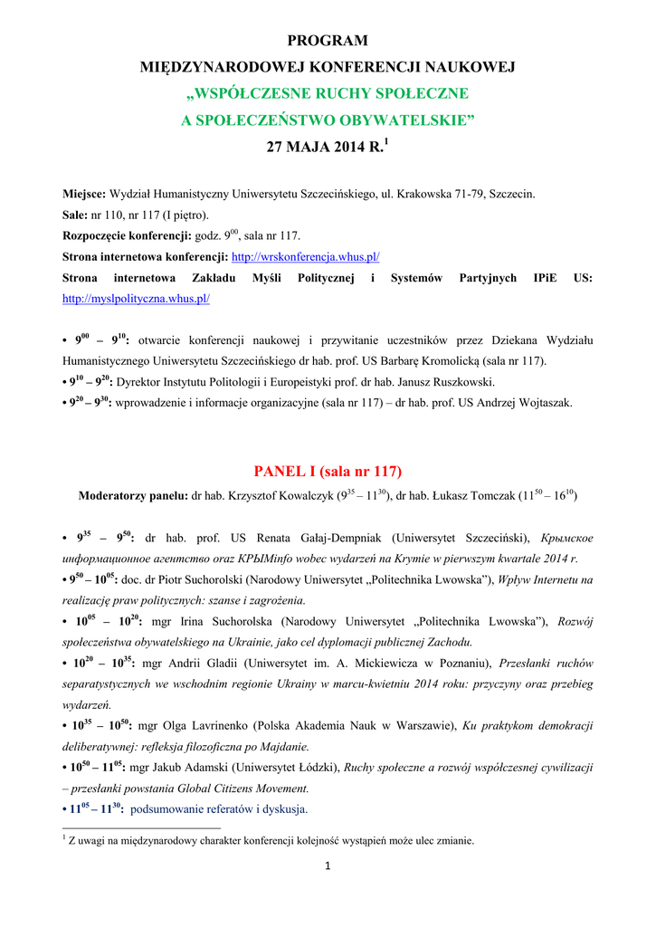 PROGRAM MIĘDZYNARODOWEJ KONFERENCJI NAUKOWEJ „WSPÓŁCZESNE RUCHY SPOŁECZNE A SPOŁECZEŃSTWO OBYWATELSKIE” 27 MAJA 2014 R.1 Miejsce: Wydział Humanistyczny Uniwersytetu Szczecińskiego, ul. Krakowska 71-79, Szczecin. Sale: nr 110, nr 117 (I piętro). Rozpoczęcie konferencji: godz. 900, sala nr 117. Strona internetowa konferencji: http://wrskonferencja.whus.pl/ Strona internetowa Zakładu Myśli Politycznej i Systemów Partyjnych IPiE US: http://myslpolityczna.whus.pl/ • 900 – 910: otwarcie konferencji naukowej i przywitanie uczestników przez Dziekana Wydziału Humanistycznego Uniwersytetu Szczecińskiego dr hab. prof. US Barbarę Kromolicką (sala nr 117). • 910 – 920: Dyrektor Instytutu Politologii i Europeistyki prof. dr hab. Janusz Ruszkowski. • 920 – 930: wprowadzenie i informacje organizacyjne (sala nr 117) – dr hab. prof. US Andrzej Wojtaszak. PANEL I (sala nr 117) Moderatorzy panelu: dr hab. Krzysztof Kowalczyk (935 – 1130), dr hab. Łukasz Tomczak (1150 – 1610) • 935 – 950: dr hab. prof. US Renata Gałaj-Dempniak (Uniwersytet Szczeciński), Крымское информационное агентство oraz КРЫМinfo wobec wydarzeń na Krymie w pierwszym kwartale 2014 r. • 950 – 1005: doc. dr Piotr Suchorolski (Narodowy Uniwersytet „Politechnika Lwowska”), Wpływ Internetu na realizację praw politycznych: szanse i zagrożenia. • 1005 – 1020: mgr Irina Suchorolska (Narodowy Uniwersytet „Politechnika Lwowska”), Rozwój społeczeństwa obywatelskiego na Ukrainie, jako cel dyplomacji publicznej Zachodu. • 1020 – 1035: mgr Andrii Gladii (Uniwersytet im. A. Mickiewicza w Poznaniu), Przesłanki ruchów separatystycznych we wschodnim regionie Ukrainy w marcu-kwietniu 2014 roku: przyczyny oraz przebieg wydarzeń. • 1035 – 1050: mgr Olga Lavrinenko (Polska Akademia Nauk w Warszawie), Ku praktykom demokracji deliberatywnej: refleksja filozoficzna po Majdanie. • 1050 – 1105: mgr Jakub Adamski (Uniwersytet Łódzki), Ruchy społeczne a rozwój współczesnej cywilizacji – przesłanki powstania Global Citizens Movement. • 1105 – 1130: podsumowanie referatów i dyskusja. 1 Z uwagi na międzynarodowy charakter konferencji kolejność wystąpień może ulec zmianie. 1 • 1130 – 1150: przerwa kawowa. • 1150 – 1205: dr Liana Hurska-Kowalczyk (Uniwersytet Szczeciński), Euromajdan jako wyznacznik społeczeństwa obywatelskiego na Ukrainie. • 1205 – 1220: dr Dariusz Wybranowski (Uniwersytet Szczeciński), Organizacja „Žene Srebrenice” (Kobiety Srebrenicy) jako element kształtowania, utrwalania pamięci zbiorowej i rozliczenia zbrodni wojennych we współczesnej Bośni i Hercegowinie. • 1220 – 1235: dr Fuad Jomma (Uniwersytet Szczeciński), Fundamentalistyczno-terrorystyczna działalność organizacji Jabhat al-Nusra w Syrii. • 1235 – 1250: mgr Jędrzej Fostiak (Uniwersytet Szczeciński), Ruch nacjonalistyczny w Szkocji na przykładzie Szkockiej Partii Narodowej. • 1250 – 1305: dr Katarzyna Kamińska-Moczyło (Uniwersytet Gdański), Aktywność społeczna w Estonii i na Łotwie. • 1305 – 1320: podsumowanie referatów i dyskusja; pamiątkowe zdjęcie uczestników konferencji. • 1330 – 1410: przerwa obiadowa. • 1410 – 1425: mgr Szymon Osowski, Bartosz Wilk (Uniwersytet Szczeciński), Jawność jako wyznacznik legitymizacji władz publicznych. • 1425 – 1440: mgr Jerzy Pawlik (Uniwersytet Łódzki), Między retrospektywną utopią a przebudzeniem religijnym – przykład Tea Party. • 1440 – 1455: lic. Agnieszka Kajda, Rola i znaczenie nowych ruchów społecznych w procesie komunikowania. • 1455 – 1510: mgr Katarzyna Łuczak (Uniwersytet Łódzki), Polityczność i apolityczność ruchów miejskich – aktywiści u władzy? • 1510 – 1525: mgr Oleg Jamielnicki (Narodowy Uniwersytet „Politechnika Lwowska”), Potencjał mobilizacji społeczeństwa obywatelskiego na Ukrainie: implikacje wydarzeń 2013-2014. • 1525 – 1540: prof. Jarina Turchin (Narodowy Uniwersytet „Politechnika Lwowska”), Euromajdan jako przykład samoorganizacji społeczeństwa ukraińskiego. • 1540 – 1555: doc. dr Zariana Kunch (Narodowy Uniwersytet „Politechnika Lwowska”), Hasła Euromajdanu z perspektywy socjolingwistyki. • 1555 – 1610: podsumowanie referatów i zakończenie konferencji. PANEL II (sala nr 110) Moderator panelu: dr hab. prof. US Andrzej Wojtaszak • 935 – 950: dr hab. prof. US Andrzej Wojtaszak (Uniwersytet Szczeciński), Główne determinanty powstawania współczesnych ruchów społecznych a idea społeczeństwa obywatelskiego. • 950 – 1005: dr Sławomira Kamińska-Berezowska (Uniwersytet Śląski w Katowicach), Znaczenie emocji w analizie nowych i starych ruchów społecznych. • 1005 – 1020: dr Aneta Krzewińska (Uniwersytet Łódzki), Współczesne ruchy społeczne i budżet partycypacyjny. 2 • 1020 – 1035: dr Beata Słobodzian (Uniwersytet Gdański), Aktywizowanie społeczności lokalnych w procesie budowy instytucji demokracji lokalnej. • 1035 – 1050: mgr Monika Krzeszewska (Uniwersytet Szczeciński), Obywatel konsument jako nowa kategoria uczestnictwa w społeczeństwie obywatelskim. • 1050 – 1105: dr Piotr Goniszewski (Uniwersytet Szczeciński), Teologia wyzwolenia – pomiędzy rewolucją a ortodoksją. • 1105 – 1130: podsumowanie referatów i dyskusja. • 1130 – 1150: przerwa kawowa. • 1150 – 1205: dr Piotr Pawliszak (Uniwersytet Gdański), Ruchy społeczne w procesach zmiany porządku instytucjonalnego w społeczeństwie ryzyka. Model neo-durkheimowski. • 1205 – 1220: mgr Marcin Pliszczyński (Uniwersytet Szczeciński), Rola ruchu ekologicznego w tworzeniu społeczeństwa obywatelskiego w Polsce. Przykład Partii Zielonych. • 1220 – 1235: mgr Piotr Chrzanowski (Uniwersytet Szczeciński), Działalność ruchu proeuropejskiego w kształtowaniu przemian społeczno-politycznych w Polsce. • 1235 – 1250: dr Kalina Kukiełko-R