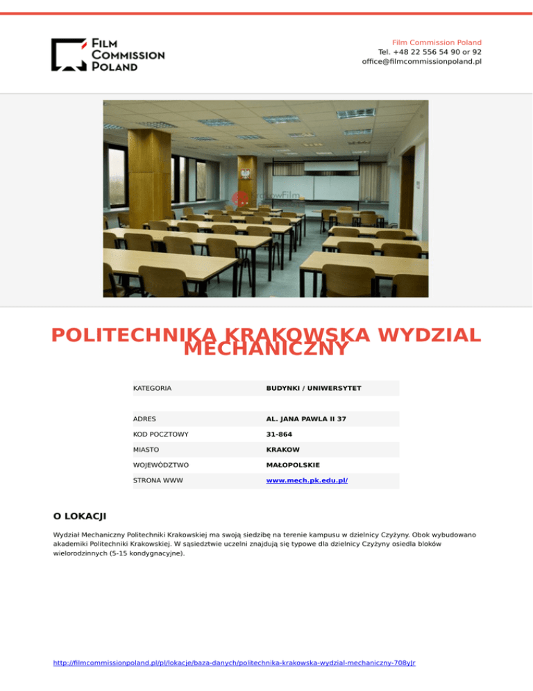 Film Commission Poland Tel. +48 22 556 54 90 or 92 office@filmcommissionpoland.pl POLITECHNIKA KRAKOWSKA WYDZIAL MECHANICZNY KATEGORIA BUDYNKI / UNIWERSYTET ADRES AL. JANA PAWLA II 37 KOD POCZTOWY 31-864 MIASTO KRAKOW WOJEWÓDZTWO MAŁOPOLSKIE STRONA WWW www.mech.pk.edu.pl/ O LOKACJI Wydział Mechaniczny Politechniki Krakowskiej ma swoją siedzibę na terenie kampusu w dzielnicy Czyżyny. Obok wybudowano akademiki Politechniki Krakowskiej. W sąsiedztwie uczelni znajdują się typowe dla dzielnicy Czyżyny osiedla bloków wielorodzinnych (5-15 kondygnacyjne). http://filmcommissionpoland.pl/pl/lokacje/baza-danych/politechnika-krakowska-wydzial-mechaniczny-708yJr