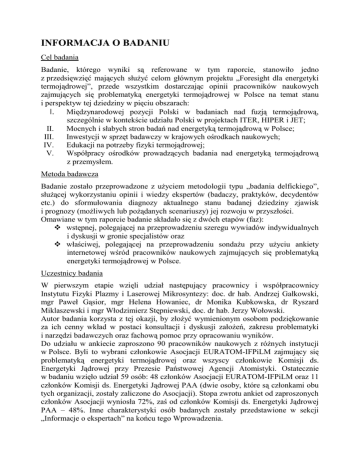 INFORMACJA O BADANIU Cel badania Badanie, którego wyniki są referowane w tym raporcie, stanowiło jedno z przedsięwzięć mających służyć celom głównym projektu „Foresight dla energetyki termojądrowej”, przede wszystkim dostarczając opinii pracowników naukowych zajmujących się problematyką energetyki termojądrowej w Polsce na temat stanu i perspektyw tej dziedziny w pięciu obszarach: I. Międzynarodowej pozycji Polski w badaniach nad fuzją termojądrową, szczególnie w kontekście udziału Polski w projektach ITER, HIPER i JET; II. Mocnych i słabych stron badań nad energetyką termojądrową w Polsce; III. Inwestycji w sprzęt badawczy w krajowych ośrodkach naukowych; IV. Edukacji na potrzeby fizyki termojądrowej; V. Współpracy ośrodków prowadzących badania nad energetyką termojądrową z przemysłem. Metoda badawcza Badanie zostało przeprowadzone z użyciem metodologii typu „badania delfickiego”, służącej wykorzystaniu opinii i wiedzy ekspertów (badaczy, praktyków, decydentów etc.) do sformułowania diagnozy aktualnego stanu badanej dziedziny zjawisk i prognozy (możliwych lub pożądanych scenariuszy) jej rozwoju w przyszłości. Omawiane w tym raporcie badanie składało się z dwóch etapów (faz): wstępnej, polegającej na przeprowadzeniu szeregu wywiadów indywidualnych i dyskusji w gronie specjalistów oraz właściwej, polegającej na przeprowadzeniu sondażu przy użyciu ankiety internetowej wśród pracowników naukowych zajmujących się problematyką energetyki termojądrowej w Polsce. Uczestnicy badania W pierwszym etapie wzięli udział następujący pracownicy i współpracownicy Instytutu Fizyki Plazmy i Laserowej Mikrosyntezy: doc. dr hab. Andrzej Gałkowski, mgr Paweł Gąsior, mgr Helena Howaniec, dr Monika Kubkowska, dr Ryszard Miklaszewski i mgr Włodzimierz Stępniewski, doc. dr hab. Jerzy Wołowski. Autor badania korzysta z tej okazji, by złożyć wymienionym osobom podziękowanie za ich cenny wkład w postaci konsultacji i dyskusji założeń, zakresu problematyki i narzędzi badawczych oraz fachową pomoc przy opracowaniu wyników. Do udziału w ankiecie zaproszono 90 pracowników naukowych z różnych instytucji w Polsce. Byli to wybrani członkowie Asocjacji EURATOM-IFPiLM zajmujący się problematyką energetyki termojądrowej oraz wszyscy członkowie Komisji ds. Energetyki Jądrowej przy Prezesie Państwowej Agencji Atomistyki. Ostatecznie w badaniu wzięło udział 59 osób: 48 członków Asocjacji EURATOM-IFPiLM oraz 11 członków Komisji ds. Energetyki Jądrowej PAA (dwie osoby, które są członkami obu tych organizacji, zostały zaliczone do Asocjacji). Stopa zwrotu ankiet od zaproszonych członków Asocjacji wyniosła 72%, zaś od członków Komisji ds. Energetyki Jądrowej PAA – 48%. Inne charakterystyki osób badanych zostały przedstawione w sekcji „Informacje o ekspertach” na końcu tego Wprowadzenia. INFORMACJE O EKSPERTACH Dane podstawowe Grupa ekspertów, którzy wzięli udział w ankiecie, była zróżnicowana pod względem wieku. Wyrównana też była liczebność Tytuł/stopień naukowy (N=43) trzech kategorii pracowników Inżynier, licencjat (bez magisterium) 2 13 naukowych: (i) licencjatów, Magister, magister inżynier 11 inżynierów i magistrów, (ii) Doktor, doktor inżynier 16 16 doktorów oraz (iii) doktorów Doktor habilitowany 5 14 habilitowanych i profesorów: Profesor, profesor inżynier 9 Dominowały w tym gronie osoby o ponad 10-letnim stażu pracy naukowej (29 z 41 odpowiedzi). Cztery osoby miały staż 6-10 lat, pięć - 3-5 lat i po jednej osobie staż: 2 lata, rok i poniżej roku. Bardziej zróżnicowany jest jednak staż pracy w dziedzinie fuzji termojądrowej: W tym staż pracy naukowo-badawczej w dziedzinie fuzji termojądrowej poniżej roku 1 rok 2 lata 3-5 lat 6-10 lat więcej niż 10 lat nie pracuję w dziedzinie fuzji termojądrowej (N=41) 1 3 6 11 4 10 6 Praca w zespołach i projektach badawczych Liczba projektów badań nad fuzją lub energetyką termojądrową (krajowych i międzynarodowych), w których eksperci byli zaangażowani w momencie badania, była zróżnicowana: od 9 osób nieuczestniczących w żadnym projekcie po 6 osób, które uczestniczą w ponad 5 projektach każda. Średni uczestnik badania pracował w blisko 3 projektach. Wśród tych osób 14 pełniło w momencie badania funkcję kierowniczą w swoich zespołach badawczych: połowa w jednym, 4 osoby – każda w dwóch, wreszcie na trzy osoby przypadło po trzy lub więcej funkcji kierowniczych. Charakterystyka przedmiotowa badań, w których uczestniczą eksperci przedstawia poniższa tablica. Tablica 1. Przedmioty badań, w których aktualnie uczestniczą badani (N=57, można było wskazać więcej niż jeden przedmiot) 24 osoby uczestniczyły w badaniach nad fuzją prowadzonych w zagranicznych ośrodkach naukowych, przy czym pobyty te miały różną długość – od kilka tygodni (7 osób) do ponad trzech lat (3 osoby). Liczby wskazań przedmiotów badań w tych projektach (można było wskazać więcej niż jeden przedmiot) przedstawiają się następująco: Tablica 2. Przedmioty badań, w których uczestniczyli badani w zagranicznych ośrodkach naukowych W jednostkach reprezentowanych przez 31 ekspertów uczestniczących w badaniu (którzy odpowiedzieli na to pytanie) średnia roczna liczba publikacji z dziedziny fuzji termojądrowej przypadająca na jednego pracownika naukowego wyniosła średnio 1,9. MIĘDZYNARODOWA POZYCJA POLSKI W BADANIACH NAD FUZJĄ TERMOJĄDROWĄ UDZIAŁ POLSKI W MIĘDZYNARODOWYCH PROJEKTACH BADAŃ NAD FUZJĄ TERMOJĄDROWĄ Tablica 3. Częstość wskazań, że Polska uczestniczy w danym projekcie badań nad fuzją oraz aprobaty tego udziału (% wskazań; N=57) Tablica 4. Liczby wskazań międzynarodowych projektów badań nad fuzją termojądrową, w których Polska nie bierze/brała udziału, oraz opinii, że powinna w nich brać udział. (N=57) Fakt udziału Pols
