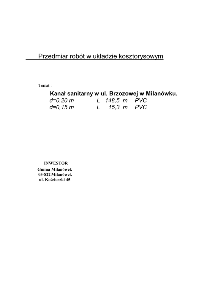 Przedmiar robót w układzie kosztorysowym Temat : Kanał sanitarny w ul. Brzozowej w Milanówku. d=0,20 m L 148,5 m PVC d=0,15 m L 15,3 m PVC INWESTOR Gmina Milanówek 05-822 Milanówek ul. Kościuszki 45 KSIĄŻKA PRZEDMIARÓW Budowa kanalizacji sanitarnej. Milanówek ul. Brzozowa Lp. Podst Opis i wyliczenia 1 Roboty w zakresie burzenia CPV 45111100-9 1 KNR AT-03 Roboty remontowe - cięcie piłą nawierzchni bitumicznych na gł. 6-10 cm d.1 0101-02 ST. 5.2 330 j.m. Poszcz m m 330.000 RAZEM 2 KNR AT-03 Mechaniczna rozbiórka nawierzchni bitumicznej o gr. do 8 cm z wywozem materiału m2 d.1 0104-02 z rozbiórki na odl. do 1 km ST. 5.2 202.27 m2 m2 2.83 m2 Wywiezienie gruzu spryzmowanego samochodami samowyładowczymi na odl.do 1 km m3 16.18 m3 Wywiezienie gruzu spryzmowanego samochodami samowyładowczymi - za każdy nast. 1 km ( wsp. 5 ) m3 16.18 m3 Podbudowy betonowe gr.15 cm pielęgnowane piaskiem i wodą m2 202.27 m2 202.27 m2 Nawierzchnie z mieszanki asfaltu lanego - warstwa ścieralna z mieszanki żwirowej gr. 4 cm m2 202.27 m2 202.270 Nawierzchnie z kostki brukowej betonowej grub. 8 cm na podsypce cementowo-pias- m2 kowej 2.83 m2 Wjazdy do bram z płyt drogowych betonowych sześciokątnych o grub. 15 cm z wypełn.spoin zapr.cement. 2.83 m2 2.830 RAZEM m3 162.29 m3 Norma 3.08 2.830 649.170 RAZEM Wykopy liniowe o szerokości 0,8-2,5 m o ścianach pionowych w gruntach suchych kat. III-IV -1- 2.830 m2 2 Roboty w zakresie przygotowania terenu pod budowę i roboty ziemne - CPV 45111200-0 12 KNNR 1 Wykopy oraz przekopy o głęb.do 4.0 m wyk.na odkład koparkami podsiębiernymi o m3 d.2 0210-04 poj.łyżki 1.20 - 2.50 m3 w gr.kat. I-II 80% mech. 20% ręcz. ST 5.2 649.17 m3 13 KNNR 1 d.2 0307-06 ST 5.2 202.270 2.830 RAZEM 11 KNR 2-31 d.1 0506-03 202.270 202.270 RAZEM 10 KNR 2-31 d.1 0511-03 202.270 Nawierzchnie z mieszanki asfaltu lanego - warstwa wiążąca z mieszanki żwirowej gr. m2 4 cm RAZEM 9 KNNR 6 d.1 0311-08 ST 5.2 16.180 202.270 RAZEM 8 KNNR 6 d.1 0311-04 ST 5.2 16.180 16.180 RAZEM 7 KNNR 6 d.1 0109-02 ST 5.2 2.830 16.180 RAZEM 6 KNR 4-01 d.1 0108-12 ST 5.2 205.070 2.830 RAZEM 5 KNR 4-01 d.1 0108-11 ST 5.2 202.270 205.070 RAZEM Ręczne rozebranie nawierzchni z kostki betonowej na podsypce cem.piaskowej 330.000 202.270 RAZEM 3 KNR AT-03 Mechaniczna rozbiórka nawierzchni z płyt drogowych betonowych sześciokątnych i m2 d.1 0106-01 kwadratowych gr. 12 i 15 cm bez wzgl. na rodzaj spoinowania i podsypki z wywozem ST. 5.2 na odl. do 1 km 205.07 m2 4 KNR 2-31 d.1 0805-03 analogia Razem 162.290 649.170 KSIĄŻKA PRZEDMIARÓW Budowa kanalizacji sanitarnej. Milanówek ul. Brzozowa Lp. Podst 14 KNNR 1 d.2 0313-02 ST 5.4 Opis i wyliczenia j.m. Poszcz RAZEM Pełne umocenienie ścian wykopów wraz z rozbiórką palami szalunkowymi stalowymi m2 (wypraskami) w gruntach suchych ; wyk.o szer.do 1 m i głęb.do 6.0 m; grunt kat. I-IV m2 1110.42 1110.420 RAZEM 15 KNNR 1 d.2 0313-01 ST 5.4 m2 71.910 RAZEM Umocnienie ścian wykopów palami szalunkowymi stalowymi na gł. do 6,0 m pod ko- m2 mory, studzienki itp. na sieciach zewnętrznych w gruntach suchych kat.I-IV wraz z rozbiórką 143.28 m2 Obsypka przewodów gruntem piaszczystym 30 cm powyżej wierzchu rury m3 88.97 m3 Zasypanie wykopów .fund.podłużnych,punktowych,rowów,wykopów obiektowych spy- m3 charkami z zagęszcz.mechanicznym zagęszczarkami (gr.warstwy w stanie luźnym 40 cm) 533.02 m3 m3 133.250 RAZEM 133.25 m3 Wywóz nadwyżki ziemi samochodami samowyładowczymi na odległość do 5 km grunt.kat. III m3 61.04 m3 133.250 RAZEM Demontaż konstrukcji podwieszeń kolidujących rurociągów i kanałów kpl. 9 kpl. 14 kpl. 9.000 Demontaż konstrukcji podwieszeń kabli energetycznych i telekomunikacyjnych typ lekki; element o rozpiętości 4 m kpl. 14 kpl. 14.000 -2- 14.000 14.000 RAZEM Norma 3.08 9.000 Montaż konstrukcji podwieszeń kabli energetycznych i telekomunikacyjnych typ lekki. kpl. RAZEM 25 KNNR 1 d.3 0527-06 ST 5.3 61.040 9.000 RAZEM 24 KNNR 1 d.3 0527-01 ST 5.3 133.250 61.040 RAZEM 3 Roboty budowlane w zakresie budowy wodociągów i rurociągów do odprowadzania ścieków CPV 45231300 - 8 22 KNNR 1 Montaż konstrukcji podwieszeń kolidujących rurociągów i kanałów. kpl. d.3 0529-01 analogia ST 5.3 9 kpl. 9.000 23 KNNR 1 d.3 0529-06 analogia ST 5.3 133.250 Zagęszczanie ziemi w wykopie zagęszczarkami (grubość warstwy 40 cm,grunty syp- m3 kie kat.I-II) RAZEM 21 KNR 4-01 d.2 0108-06 ST. 5.2 533.020 Zasypywanie wykopów o ścianach pionowych o szerokości 0.8-2.5 m i głęb.do 3.0 m m3 w gr.kat. I-III 133.25 20 KNR 2-01 d.2 0236-03 ST 5.7 88.970 533.020 RAZEM 19 KNNR 1 d.2 0318-03 ST 5.7 143.280 88.970 RAZEM 18 KNNR 1 d.2 0214-03 ST 5.7 71.910 143.280 RAZEM 17 KNNR 1 d.2 0608-02 ST 5.7 1110.420 Pełne umocenienie ścian wykopów wraz z rozbiórką palami szalunkowymi stalowymi m2 (wypraskami) w gruntach suchych ; wyk.o szer.do 1 m i głęb.do 3.0 m; grunt kat. I-IV 71.91 16 KNNR 1 d.2 0315-05 ST 5.4 Razem 162.290 14.000 KSIĄŻKA PRZEDMIARÓW Budowa kanalizacji sanitarnej. Milanówek ul. Brzozowa Lp. Podst 26 KNNR 4 d.3 1411-03 ST 5.5 Opis i wyliczenia Podłoża pod kanały i obiekty z materiałów sypkich grub. 20 cm j.m. m3 37.84 m3 Podłoża betonowe o grubości 5 cm pod studnie m3 0.54 m3 Studnie rewizyjne z kręgów betonowych o śr. 1200 mm w gotowym wykopie . stud. 3 stud. Poszcz 37.840 RAZEM 27 KNNR 4 d.3 1410-01 ST. 2.3 29 Wykonanie przepadów zwnętrznych z rur PVC D 160 na studniach rewizyjnych D d.3 kalk. własna 1200 2 szt 30 KNR 2-18 d.3 0721-02 ST. 2.3 Dwuwarstwowa powłoka izolacyjna z emulsji lub roztworu asfaltowego pionowych powierzchni betonowych . m2 52.49 m2 szt RAZEM 3.000 2.000 RAZEM 2.000 52.490 2 szt Kanały z rur PVC łączonych na wcisk o śr. zewn. 200 mm m 144.90 m Kanały z rur PVC łączonych na wcisk o śr. zewn. 160 mm m 15.30 m 2.000 Norma 3.08 144.900 15.300 RAZEM -3- 2.000 144.900 RAZEM 33 KNNR 4 d.3 1308-02 ST 5.6 52.490 Studzienki kanalizacyjne systemowe "VAWIN" o śr 315-425 mm - zamkn