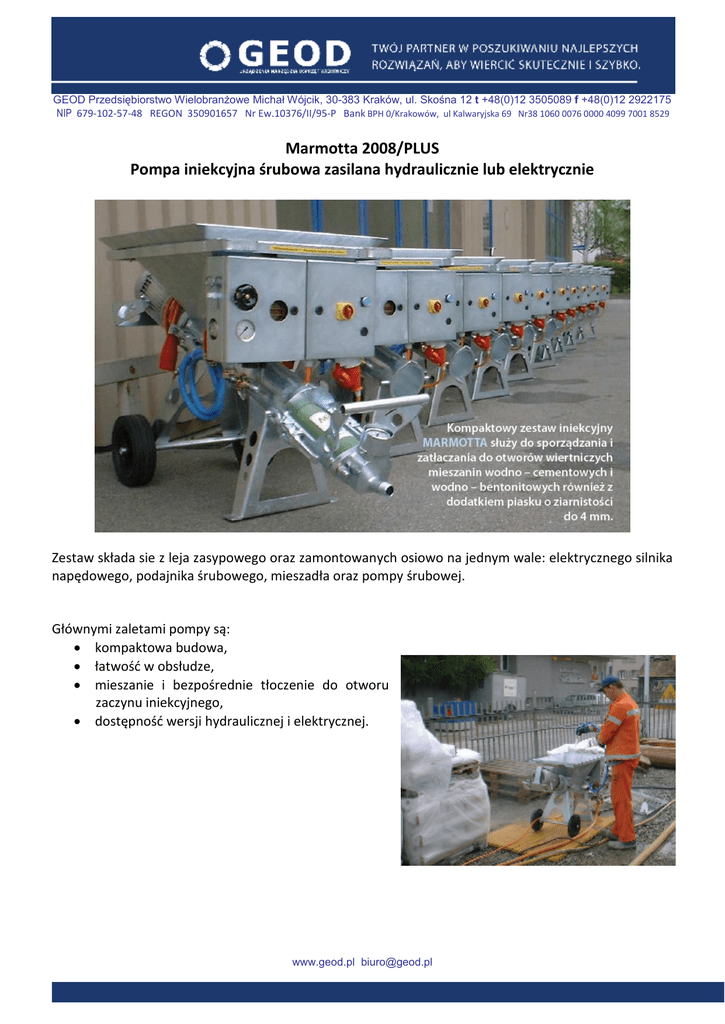 GEOD Przedsiębiorstwo WielobranŜowe Michał Wójcik, 30-383 Kraków, ul. Skośna 12 t +48(0)12 3505089 f +48(0)12 2922175 NIP 679-102-57-48 REGON 350901657 Nr Ew.10376/II/95-P Bank BPH 0/Krakowów, ul Kalwaryjska 69 Nr38 1060 0076 0000 4099 7001 8529 Marmotta 2008/PLUS Pompa iniekcyjna śrubowa zasilana hydraulicznie lub elektrycznie Zestaw składa sie z leja zasypowego oraz zamontowanych osiowo na jednym wale: elektrycznego silnika napędowego, podajnika śrubowego, mieszadła oraz pompy śrubowej. Głównymi zaletami pompy są: • kompaktowa budowa, • łatwość w obsłudze, • mieszanie i bezpośrednie tłoczenie do otworu zaczynu iniekcyjnego, • dostępność wersji hydraulicznej i elektrycznej. www.geod.pl [email protected] GEOD Przedsiębiorstwo WielobranŜowe Michał Wójcik, 30-383 Kraków, ul. Skośna 12 t +48(0)12 3505089 f +48(0)12 2922175 NIP 679-102-57-48 REGON 350901657 Nr Ew.10376/II/95-P Bank BPH 0/Krakowów, ul Kalwaryjska 69 Nr38 1060 0076 0000 4099 7001 8529 Schemat budowy/wymiary gabarytowe: Dane techniczne: Specyfikacja w. hydrauliczna w. elektryczna MP 2 MP 3 MP 8 MP 13 Ciśnienie nominalne pracy Ciśnienie maksymalne Maksymalny dystans tłoczenia Maksymalna średnica drobin 30l/min dla 120/150 bar 50l/min dla 120/150 bar 4,2 KW 242 obr/min. 5,5 KW 400 obr/min. 320 l/h 520 l/h 750 l/h 1250 l/h 1440 l/h 2350 l/h 2200 l/h 3600 l/h 40 bar 70 bar 100 m 3 mm Wyposażenie dodatkowe: Zestawy stator – rotor o różnym wydatku tłoczenia www.geod.pl [email protected]