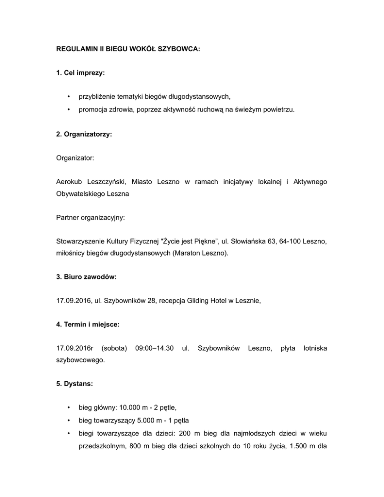 REGULAMIN II BIEGU WOKÓŁ SZYBOWCA: 1. Cel imprezy: • przybliżenie tematyki biegów długodystansowych, • promocja zdrowia, poprzez aktywność ruchową na świeżym powietrzu. 2. Organizatorzy: Organizator: Aerokub Leszczyński, Miasto Leszno w ramach inicjatywy lokalnej i Aktywnego Obywatelskiego Leszna Partner organizacyjny: Stowarzyszenie Kultury Fizycznej "Życie jest Piękne”, ul. Słowiańska 63, 64-100 Leszno, miłośnicy biegów długodystansowych (Maraton Leszno). 3. Biuro zawodów: 17.09.2016, ul. Szybowników 28, recepcja Gliding Hotel w Lesznie, 4. Termin i miejsce: 17.09.2016r (sobota) 09:00–14.30 ul. Szybowników Leszno, płyta lotniska szybowcowego. 5. Dystans: • bieg główny: 10.000 m - 2 pętle, • bieg towarzyszący 5.000 m - 1 pętla • biegi towarzyszące dla dzieci: 200 m bieg dla najmłodszych dzieci w wieku przedszkolnym, 800 m bieg dla dzieci szkolnych do 10 roku życia, 1.500 m dla młodzieży do lat 15-tu. 6. Trasa: Poprowadzona zostanie 95% trawiastą nawierzchnią płyty lotniska szybowcowego, 5% utwardzoną drogą szutrową, limit czasu dla wszystkich konkurencji wynosi 90 minut (czekamy na ostatniego zawodnika!). 7. Zgłoszenia: Na stronie maratonleszno.pl i facebook Maraton Leszno w formularzu zgłoszeń - biegi na 10.000 m i 5.000 m do dnia 16.09.2016 oraz dniu zawodów w biurze zawodów. Limit 200 zgłoszonych i opłaconych startujących. Rejestracja najmłodszych zawodników do biegów dla dzieci wyłącznie w dniu zawodów w biurze zawodów. 8. Opłata startowa: Opłata startowa wynosi 30 zł dla zawodników zgłoszonych na dystanse 10.000 m i 5.000 m. Płatne w dniu startu w biurze zawodów. Biegi dla dzieci i młodzieży bez opłaty startowej. 9. Program zawodów: Biuro zawodów: otwarcie godz. 9:00 - 11:00 - wydawanie numerów startowych, rejestracja nowych zawodników i przyjmowanie opłaty startowej. Program minutowy zawodów: • godz. 12:30 - start biegu dla najmłodszych (200m), • godz. 12:45 - start biegu dla dzieci w wieku szkolnym (800m) , • godz. 13:00 - start biegu dla młodzieży > 10 roku życia (1.500m), • godz. 13:30 - start biegu na 10.000 m • godz. 15:00 - start biegu na 5.000 m • godz. 16:30 -17:15 - dekoracja biegów dziecięcych i młodzieżowych, biegów na 5 i 10 km 10. Klasyfikacja: Zawodnicy biegu głównego na 10.000 m i 5.000 m zostaną sklasyfikowani na podstawie indywidualnego elektronicznego pomiaru czasu. Obowiązywać będzie klasyfikacja open kobiet i mężczyzn od 1 - 6 miejsca W biegach dziecięcych i młodzieżowych, klasyfikacja będzie się odbywała na podstawie kolejności przybycia na metę, bez pomiaru czasu. Obowiązywać będzie klasyfikacja open dziewcząt i chłopców od 1 - 3 miejsca 11. Świadczenia: Każdy zawodnik biegu na 5 i 10 km otrzyma: • numer startowy • komplet agrafek • pamiątkową koszulkę z biegu • zwrotny chip do elektronicznego pomiaru czasu • bon na posiłek regeneracyjny • drobne gadżety uzależnione od hojności sponsorów. Uczestnicy biegów dziecięcych i młodzieżowych otrzymają drobną przekąskę po biegu. 12. Nagrody: Biegi na 5.000 m i 10.000 m w kategorii open: kobiet: • I miejsce - puchar + 30 minutowy lot szybowcem • II miejsce - puchar + lot paralotnią • III miejsce - puchar + 10 minutowy lot szybowcem • IV miejsce nagroda rzeczowa • V miejsce nagroda rzeczowa • VI miejsce nagroda rzeczowa mężczyzn: • • I miejsce - puchar + 30 minutowy lot szybowcem • II miejsce - puchar + lot paralotnią • III miejsce - puchar + 10 minutowy lot szybowcem • IV miejsce nagroda rzeczowa • V miejsce nagroda rzeczowa • VI miejsce nagroda rzeczowa Biegi dla dzieci i młodzieży w kategorii open: • dziewcząt: miejsca I - III puchary • chłopców: miejsca I - III puchary dla każdy uczestników biegów dziecięcych i młodzieżowych otrzyma pamiątkowy dyplom. 13. Uczestnictwo: • Do startu w biegu głównym dopuszczeni zostaną zawodnicy, którzy ukończyli 18 lat oraz podpiszą oświadczenie o stanie zdrowia i starcie na własną odpowiedzialność. • Do startu w biegu głównym dopuszczeni zostaną zawodnicy, którzy ukończyli 16 lat i mają pisemną zgodę rodziców lub opiekunów. • Dzieci i młodzież do biegów zostaną dopuszczeni wyłącznie za pisemną zgodą rodziców lub opiekunów prawnych 14. Postanowienia końcowe: • sklasyfikowani zostaną wszyscy uczestnicy biegu, którzy ukończą jeden z dystansów, • organizator nie odpowiada za rzeczy zagubione, nieoddane do depozytu, • uczestnicy biegów biorą udział w zawodach na własną odpowiedzialność i wskazane jest ubezpieczenie na własny koszt od następstw nieszczęśliwych wypadków, • pobranie numeru startowego przez zawodnika jest równoznaczne z akceptacją regulaminu. • organizator nie przesyła nagród nieodebranych podczas dekoracji.
