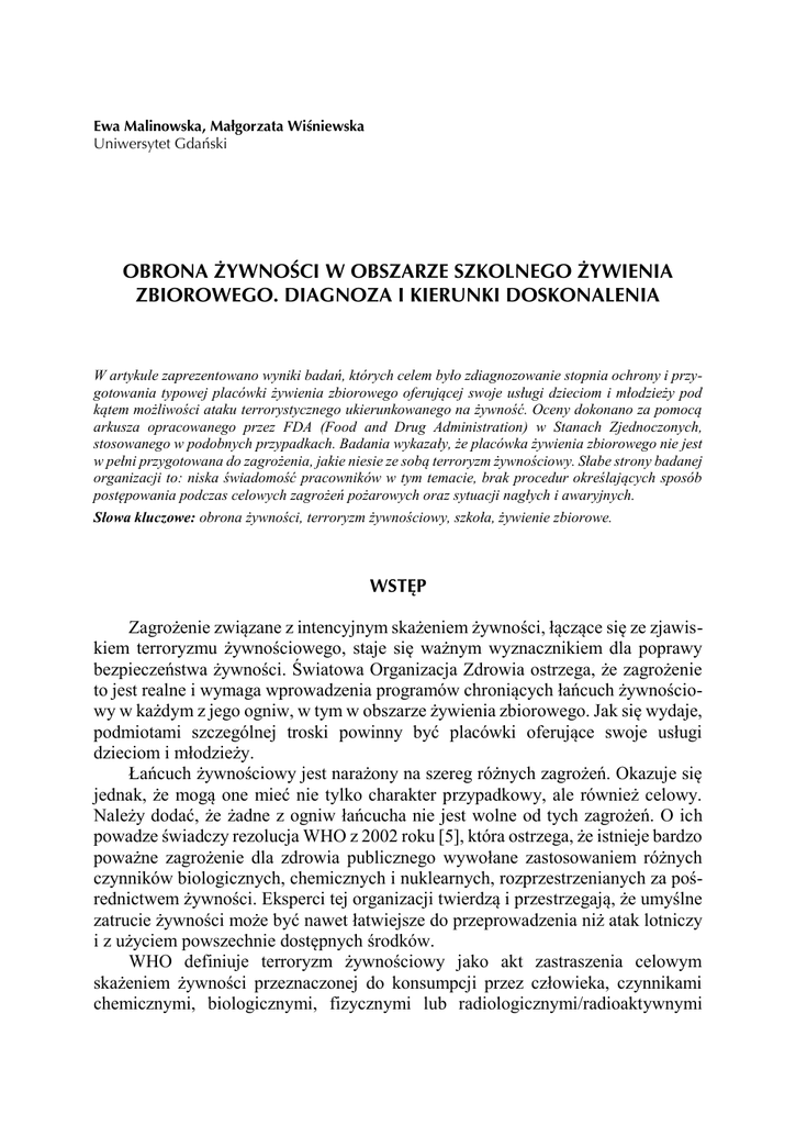 Ewa Malinowska, Małgorzata Wiśniewska Uniwersytet Gdański OBRONA ŻYWNOŚCI W OBSZARZE SZKOLNEGO ŻYWIENIA ZBIOROWEGO. DIAGNOZA I KIERUNKI DOSKONALENIA W artykule zaprezentowano wyniki badań, których celem było zdiagnozowanie stopnia ochrony i przygotowania typowej placówki żywienia zbiorowego oferującej swoje usługi dzieciom i młodzieży pod kątem możliwości ataku terrorystycznego ukierunkowanego na żywność. Oceny dokonano za pomocą arkusza opracowanego przez FDA (Food and Drug Administration) w Stanach Zjednoczonych, stosowanego w podobnych przypadkach. Badania wykazały, że placówka żywienia zbiorowego nie jest w pełni przygotowana do zagrożenia, jakie niesie ze sobą terroryzm żywnościowy. Słabe strony badanej organizacji to: niska świadomość pracowników w tym temacie, brak procedur określających sposób postępowania podczas celowych zagrożeń pożarowych oraz sytuacji nagłych i awaryjnych. Słowa kluczowe: obrona żywności, terroryzm żywnościowy, szkoła, żywienie zbiorowe. WSTĘP Zagrożenie związane z intencyjnym skażeniem żywności, łączące się ze zjawiskiem terroryzmu żywnościowego, staje się ważnym wyznacznikiem dla poprawy bezpieczeństwa żywności. Światowa Organizacja Zdrowia ostrzega, że zagrożenie to jest realne i wymaga wprowadzenia programów chroniących łańcuch żywnościowy w każdym z jego ogniw, w tym w obszarze żywienia zbiorowego. Jak się wydaje, podmiotami szczególnej troski powinny być placówki oferujące swoje usługi dzieciom i młodzieży. Łańcuch żywnościowy jest narażony na szereg różnych zagrożeń. Okazuje się jednak, że mogą one mieć nie tylko charakter przypadkowy, ale również celowy. Należy dodać, że żadne z ogniw łańcucha nie jest wolne od tych zagrożeń. O ich powadze świadczy rezolucja WHO z 2002 roku [5], która ostrzega, że istnieje bardzo poważne zagrożenie dla zdrowia publicznego wywołane zastosowaniem różnych czynników biologicznych, chemicznych i nuklearnych, rozprzestrzenianych za pośrednictwem żywności. Eksperci tej organizacji twierdzą i przestrzegają, że umyślne zatrucie żywności może być nawet łatwiejsze do przeprowadzenia niż atak lotniczy i z użyciem powszechnie dostępnych środków. WHO definiuje terroryzm żywnościowy jako akt zastraszenia celowym skażeniem żywności przeznaczonej do konsumpcji przez człowieka, czynnikami chemicznymi, biologicznymi, fizycznymi lub radiologicznymi/radioaktywnymi 168 ZESZYTY NAUKOWE AKADEMII MORSKIEJ W GDYNI, nr 93, czerwiec 2016 w celu wywołania śmierci ludności cywilnej lub uszczerbku dla zdrowia i/lub zakłócenia stabilności społecznej, ekonomicznej, lub politycznej państwa [6]. Z terroryzmem żywnościowym mamy do czynienia w sytuacji, gdy żywność jest wykorzystywana jako broń, gdy jest wymierzona przeciw łańcuchowi żywnościowemu, np. poprzez: skażenie lub zakażenie żywności i surowców do produkcji żywności, zanieczyszczenie żywności i jej surowców, w tym zanieczyszczenie przez modyfikację genetyczną, skażenie lub zanieczyszczenie wody, jej źródeł, ujęć, dodawanie niedozwolonych substancji chemicznych w trakcie wzrostu roślin, w trakcie żniw czy wreszcie dodawanie wszelkich niedozwolonych substancji chemicznych w trakcie przetwórstwa, produkcji, przechowywania, przygotowania oraz serwowania produktu żywnościowego [1]. Atak terrorystyczny może dotyczyć rolników, producentów, przetwórców, dystrybutorów, handlu detalicznego, laboratoriów działających na rzecz sektora spożywczego. Oprócz tego, co potwierdzają wyniki badań prowadzonych przez Dalziela [3], celem takich ataków stają się również restauracje, kantyny wojskowe, różne punkty gastronomiczne, a w tym stołówki szkolne. Wyróżnia się przy tym trzy podstawowe rodzaje taktyki stosowanej w przypadku terroryzmu żywnościowego [4]: atak pośredni na dany podmiot prowadzony z zewnątrz, bez konieczności bezpośredniego dostępu do żywności, surowców w zakładzie; atak poprzez wtargnięcie na teren danego podmiotu w celu bezpośredniego dotarcia do surowców półproduktów, wyrobów gotowych; atak poprzez uzyskanie pomocy osób zatrudnionych lub legalnie przebywających na terenie określonego podmiotu. Celem wyżej przytoczonych działań jest wywołanie destabilizacji społecznej, politycznej, gospodarczej, spowodowanie chaosu, paniki, strachu, stanu zagrożenia i poczucia niepewności. Mając na uwadze ogólnie pojętą ochronę społeczeństwa oraz troskę o bezpieczeństwo jednego z najsłabszych ogniw łańcucha żywności, jakim niewątpliwie jest obszar żywienia zbiorowego skierowany do młodzieży szkolnej, należy dokonać analizy stopnia przygotowania określonych działań pod kątem ewentualnego ataku terrorystycznego. 1. CEL I METODYKA BADAŃ Celem badań jest zdiagnozowanie stopnia obrony i przygotowania placówki żywienia zbiorowego funkcjonującej w jednej z trójmiejskich szkół publicznych pod kątem możliwości ataku terrorystycznego ukierunkowanego na żywność. Oceny dokonano za pomocą arkusza opracowanego przez FDA w Stanach Zjednoczonych [7], stosowanego w odniesieniu do placówek szkolnych, składającego się ze 103 stwierdzeń, na które można odpowiedzieć: spełniono całkowicie (5 pkt), częściowo spełniono (3 pkt), nie spełniono (0 pkt). Określenia charakteryzujące sytuację placówki żywienia zbiorowego pod względem zabezpieczenia przed żywieniowym atakiem terrorystycznym są zawarte E. Malinowska, M. Wiśniewska, Obrona żywności w obszarze szkolnego żywienia zbiorowego. Diagnoza… 169 w pięciu obszarach: ochrony zewnętrznej (1), ochrony wewnętrznej (2), bezpieczeństwa obsługi procesu gastronomicznego (3), bezpieczeństwa przyjmowania poczty przychodzącej oraz pieniędzy, (4) bezpieczeństwa i szkolenia personelu (5). Najbardziej złożonym obszarem jest obszar trzeci, którego poszczególne charakterystyki usystematyzowano 