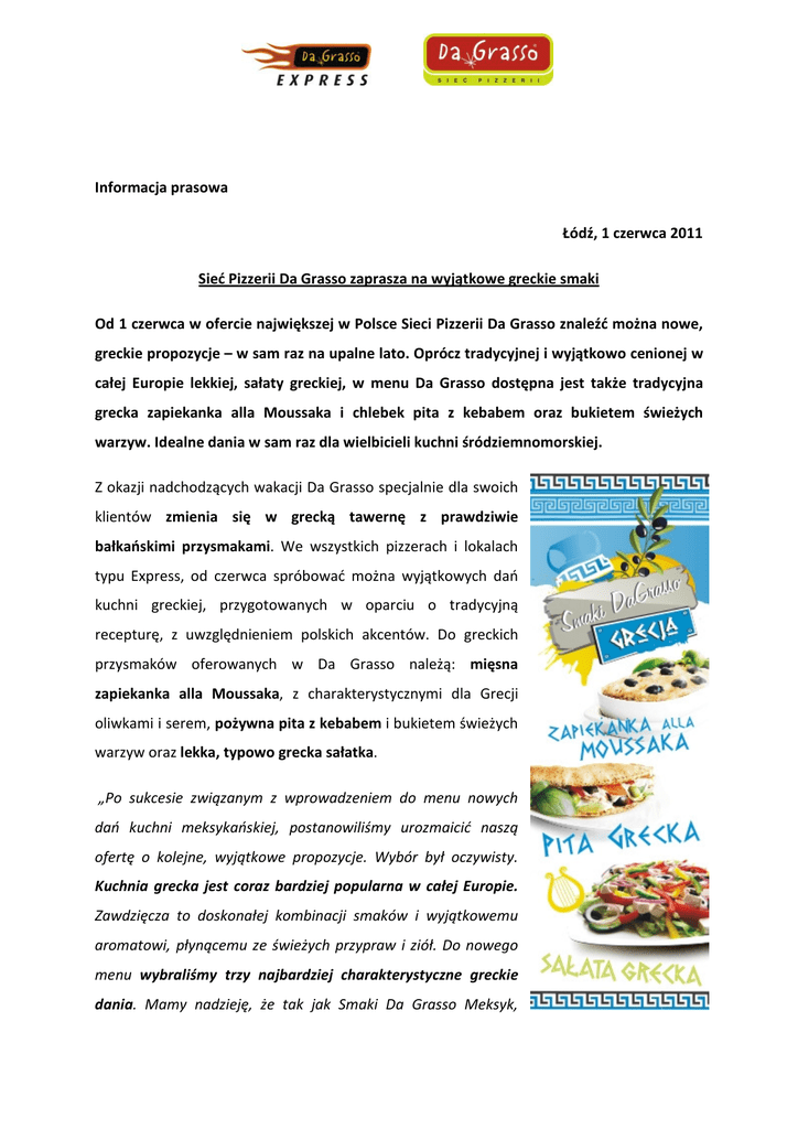 Informacja prasowa Łódź, 1 czerwca 2011 Sieć Pizzerii Da Grasso zaprasza na wyjątkowe greckie smaki Od 1 czerwca w ofercie największej w Polsce Sieci Pizzerii Da Grasso znaleźć można nowe, greckie propozycje – w sam raz na upalne lato. Oprócz tradycyjnej i wyjątkowo cenionej w całej Europie lekkiej, sałaty greckiej, w menu Da Grasso dostępna jest także tradycyjna grecka zapiekanka alla Moussaka i chlebek pita z kebabem oraz bukietem świeżych warzyw. Idealne dania w sam raz dla wielbicieli kuchni śródziemnomorskiej. Z okazji nadchodzących wakacji Da Grasso specjalnie dla swoich klientów zmienia się w grecką tawernę z prawdziwie bałkańskimi przysmakami. We wszystkich pizzerach i lokalach typu Express, od czerwca spróbować można wyjątkowych dań kuchni greckiej, przygotowanych w oparciu o tradycyjną recepturę, z uwzględnieniem polskich akcentów. Do greckich przysmaków oferowanych w Da Grasso należą: mięsna zapiekanka alla Moussaka, z charakterystycznymi dla Grecji oliwkami i serem, pożywna pita z kebabem i bukietem świeżych warzyw oraz lekka, typowo grecka sałatka. „Po sukcesie związanym z wprowadzeniem do menu nowych dań kuchni meksykańskiej, postanowiliśmy urozmaicić naszą ofertę o kolejne, wyjątkowe propozycje. Wybór był oczywisty. Kuchnia grecka jest coraz bardziej popularna w całej Europie. Zawdzięcza to doskonałej kombinacji smaków i wyjątkowemu aromatowi, płynącemu ze świeżych przypraw i ziół. Do nowego menu wybraliśmy trzy najbardziej charakterystyczne greckie dania. Mamy nadzieję, że tak jak Smaki Da Grasso Meksyk, nasze greckie propozycje również zyskają szerokie grono wielbicieli” – powiedziała Magdalena Piróg, wiceprezes Da Grasso. Pizza z greckimi akcentami Dla tych, którzy oprócz Smaków Da Grasso cenią w pizzeriach Sieci wyjątkową i niepowtarzalną pizzę, na unikalnym cieście, serwowaną zawsze z dwoma sosami, Da Grasso ma kilka ciekawych, propozycji, zawierających typowo śródziemnomorskie akcenty. Wśród 75 rodzajów pizzy Da Grasso, można znaleźć kilka pozycji charakterystycznych dla kuchni greckiej. Między innymi pizzę Solare z kebabem drobiowym, cenionymi w Grecji kaparami, cebulą i oliwkami. Pizzę Cztery Sery z dodatkiem sera sałatkowego oraz pizzę Rafi z łososiem, oliwkami i jogurtem naturalnym. Na uwagę zasługuje również pizza Permaloso z cebulą, czosnkiem, oliwkami oraz owocami morza, niezwykle cenionymi w niektórych regionach Grecji. Od 1 czerwca wyjątkowych greckich smaków w trzech odsłonach oraz wszystkich 75 rodzajów pizzy, w tym także tych typowo greckich, spróbować można w Pizzeriach i lokalach typu Express Da Grasso. Więcej informacji o Sieci Da Grasso: Da Grasso to największa w Polsce sieć ponad 210 pizzerii i restauracji zlokalizowanych w przeszło 150 miastach. W menu Da Grasso można znaleźć już nie tylko wspaniałą pizzę zawsze serwowaną z unikalnymi w smaku sosami, ale także grillowane mięsa, ryby, makarony, przekąski oraz sałatki i desery. Ponadto, w ramach wprowadzenia segmentu Smaki Da Grasso, oferta sieci rozszerzyła się o dania kuchni meksykańskiej i kuchni greckiej. Najwyższa jakość, smak potraw oraz doskonała obsługa zostały wielokrotnie docenione, zarówno przez klientów, jak i gremia branżowe. Najważniejsze nagrody i wyróżnienia dla sieci Da Grasso: • 2010, 2009, 2008, 2007 złoty Laur Konsumenta • 2010 Jakość Obsługi • 2009 Jakość Roku • 2008 Hermes w kategorii – sieć restauracji • 2008 Grand Prix Konsumenta • 2006 srebrny Laur Konsumenta Więcej informacji na temat sieci Da Grasso można znaleźć na www.dagrasso.pl