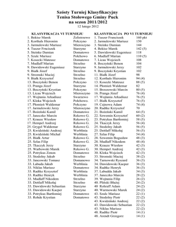 Szósty Turniej Klasyfikacyjny Tenisa Stołowego Gminy Puck na sezon 2011/2012 12 lutego 2012 KLASYFIKACJA VI TURNIEJU 1. Bekisz Marek Żelistrzewo 2. Korthals Hieronim Połczyno 3. Jarmulewski Mariusz Mieroszyno 4. Tuszer Frnciszek Starzyno 5. Steinke Damian Domatowo 5. Szulc Mariusz Połchowo 7. Kosecki Mateusz Domatowo 7. Mudlaff Marian Strzelno 9. Dawidowski Eugeniusz Starzyno 9. Białk Józef Strzelno 9. Stromski Maciej Strzelno 9. Białk Krzysztof Strzelno 13. Boczyński Benon Połczyno 13. Pranga Józef Starzyno 13. Boczyński Krystian Połczyno 13. Licau Wojciech Mieroszyno 17. Wojtania Arkadiusz Swarzewo 17. Kloka Wojciech Połchowo. 17. Płomień Waldemar Połczyno 17. Jarmulewski Jerzy Mieroszyno 17. Bożeński Kamil Domatowo 17. Janeczko Marcin Rekowo G. 17. Krauze Wiesław Rekowo G. 17. Hempel Andrzej Rekowo G. 25. Grygel Waldemar Rekowo G. 25. Kwidziński Andrzej Werblinia 25. Kwidziński Michał Werblinia 25. Białk Artur Rekowo G. 25. Szlas Filip Rekowo G. 25. Tkaczyk Jerzy Starzyno 25. Warbowski Marek Rekowo G. 25. Potrykus Zenon Domatowo 33. Stodolny Jakub Strzelno 33. Jancowski Tomasz Domanowo 33. Labuda Jakub Werblinia 33. Niklas Mariusz Domatowo 33. Radtke Krzysztof Werblinia 33. Radtke Henryk Werblinia 33. Mudlaff Nikodem Strzelno 33. Dettlaff Mikołaj Strzelno 33. Dawidowski Sebastian Starzyno 33. Dawidowski Kacper Starzyno 33. Potrykus Bartłomiej Domatowo 33. Rohde Krystian Domatowo KLASYFIKACJA PO VI TURNIEJU 1. Tuszer Franciszek 160 pkt 2. Jarmulewski Mariusz 150 3. Steinke Damian 144 4. Bekisz Marek 142 (5) 5. Dawidowski Eugeniusz 118 6. Mudlaff Marian 110 (5) 7. Licau Wojciech 108 8. Boczyński Benon 104 9. Jarmulewski Jerzy 102 9. Boczyński Krystian 102 11. Białk Józef 98 12. Korthals Hieronim 94 (4) 13. Kosecki Mateusz 88 (5) 14. Płomień Waldemar 82 15. Brzozowski Marcin 80 (5) 16. Pranga Józef 76 (4) 17. Wojtania Arkadiusz 76 (5) 17. Białk Krzysztof 76 (5) 19. Cejnowa Adam 74 (4) 20. Radtke Krzysztof 70 21. Bożeński Kamil 64 (5) 22. Szwemin Krzysztof 60 (2) 23. Potrykus Bartłomiej 58 (5) 24. Tkaczyk Jerzy 56 (4) 25. Stodolny Jakub 56 (5) 25. Dettlaff Mikołaj 56 (5) 27. Szlas Filip 54 (4) 28. Szwemin Bogusław 48 (3) 28. Mudlaff Nikodem 48 (4) 30. Krauze Wiesław 42 (3) 30. Hempel Andrzej 42 (3) 30. Kloka Wojciech 42 (3) 33. Stromski Maciej 38 (2) 34. Tarnowski Ryszard 36 (3) 34. Dawidowski Kacper 36 (3) 34. Radtke Henryk 36 (3) 37. Labudda Jakub 34 (3) 37. Janeczko Marcin 28 (2) 39. Wojtania Filip 26 (2) 40. Pliński Błażej 24 (2) 40 Rohraff Adam 24 (2) 40. Warmowski Marek 24 (2) 43. Szulc Mariusz 22 (1) 43. Stodolny Piotr 22 (2) 43. Kwidziński Andrzej 22 (2) 43. Dawidowski Sebastian 22 (2) 43. Niklas Mariusz 22 (2) 48. Radtke Piotr 14 (1) 48. Arendt Grzegorz 14 (1) 48. Hempel Andrzej 48. Bekisz Michał 52. Drzeżdżon Ireneusz 52. Szwemin Ryszard 54. Dolmierski Błażej 54. Szlas Andrzej 54. Miłosz Patryk 54.Grygel Waldemar 54. Kwidziński Michał 54. Białk Artur 54. Potrykus Zenon 61. Szmidt Krystian 61. Pienczyn Leszek 61. Jancowski Tomasz 61. Rohde Krystian 61. Minga Artur KLASYFIKACJA ZESPOŁOWA VI TURNIEJU 1. Połczyno 60 pkt 2. Starzyno 58 3. Mieroszyno 56 4. Domatowo 56 5. Strzelno 56 6. Rekowo Górne 42 7. Strzelno II 38 8. Połchowo 36 9. Rekowo Górne II 36 10. Werblinia 34 11. Starzyno II 32 11. Domanowo II 32 13. Żelistrzewo 30 14. Werblinia II 20 14. Strzelno III 20 16. Swarzewo 14 16. Połczyno II 14 18. Rekowo Górne III 12 19. Domanowo III 10 14 (1) 14 (1) 14 (1) 14 (1) 12 (1) 12 (1) 12 (1) 12 (1) 12 (1) 12 (1) 12 (1) 10 (1) 10 (1) 10 (1) 10 (1) 10 (1) KLASYFIKACJA ZESPOŁOWA PO VI TURNIEJU 1. Starzyno 382 pkt 2. Mieroszyno 360 3. Połczyno 346 4. Strzelno 322 5. Domatowo 310 6. Rekowo Górne 260 7. Połczyno II 200 8. Werblinia 180 9. Strzelno II 168 10. Żelistrzewo 156 11. Swarzewo 122 12. Starzyno II 84 13. Rekowo Górne II 76 14. Werblinia II 50 15. Połchowo 48 16. Strzelno III 44 16. Domatowo II 44 18. Rekowo Górne III 12 18. Łebcz 12 20. Domatowo III 10