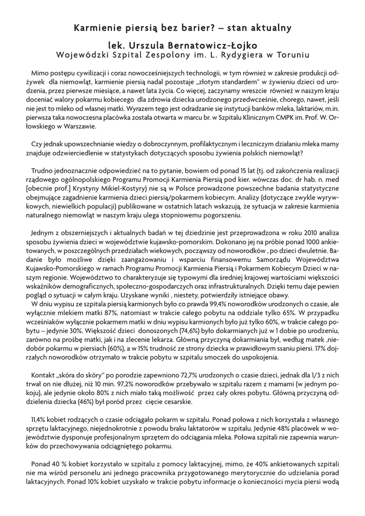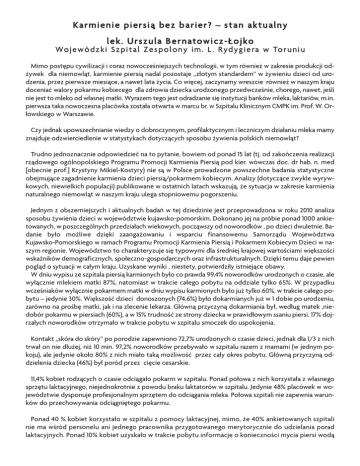 Ka r mi en i e pi er si ą be z b a r ie r ? – s ta n ak tu aln y le k . Ur szu la B e r natowi cz-Ł o jko Wo j e w ó d z k i S z p i t a l Z e s p o l o n y i m . L . R y d y g i e ra w To r u n i u Mimo postępu cywilizacji i coraz nowocześniejszych technologii, w tym również w zakresie produkcji odżywek dla niemowląt, karmienie piersią nadal pozostaje „złotym standardem” w żywieniu dzieci od urodzenia, przez pierwsze miesiące, a nawet lata życia. Co więcej, zaczynamy wreszcie również w naszym kraju doceniać walory pokarmu kobiecego dla zdrowia dziecka urodzonego przedwcześnie, chorego, nawet, jeśli nie jest to mleko od własnej matki. Wyrazem tego jest odradzanie się instytucji banków mleka, laktariów, m.in. pierwsza taka nowoczesna placówka została otwarta w marcu br. w Szpitalu Klinicznym CMPK im. Prof. W. Orłowskiego w Warszawie. Czy jednak upowszechnianie wiedzy o dobroczynnym, profilaktycznym i leczniczym działaniu mleka mamy znajduje odzwierciedlenie w statystykach dotyczących sposobu żywienia polskich niemowląt? Trudno jednoznacznie odpowiedzieć na to pytanie, bowiem od ponad 15 lat (tj. od zakończenia realizacji rządowego ogólnopolskiego Programu Promocji Karmienia Piersią pod kier. wówczas doc. dr hab. n. med [obecnie prof.] Krystyny Mikiel-Kostyry) nie są w Polsce prowadzone powszechne badania statystyczne obejmujące zagadnienie karmienia dzieci piersią/pokarmem kobiecym. Analizy (dotyczące zwykle wyrywkowych, niewielkich populacji) publikowane w ostatnich latach wskazują, że sytuacja w zakresie karmienia naturalnego niemowląt w naszym kraju ulega stopniowemu pogorszeniu. Jednym z obszerniejszych i aktualnych badań w tej dziedzinie jest przeprowadzona w roku 2010 analiza sposobu żywienia dzieci w województwie kujawsko-pomorskim. Dokonano jej na próbie ponad 1000 ankietowanych, w poszczególnych przedziałach wiekowych, począwszy od noworodków , po dzieci dwuletnie. Badanie było możliwe dzięki zaangażowaniu i wsparciu finansowemu Samorządu Województwa Kujawsko-Pomorskiego w ramach Programu Promocji Karmienia Piersią i Pokarmem Kobiecym Dzieci w naszym regionie. Województwo to charakteryzuje się typowymi dla średniej krajowej wartościami większości wskaźników demograficznych, społeczno-gospodarczych oraz infrastrukturalnych. Dzięki temu daje pewien pogląd o sytuacji w całym kraju. Uzyskane wyniki , niestety, potwierdziły istniejące obawy. W dniu wypisu ze szpitala piersią karmionych było co prawda 99,4% noworodków urodzonych o czasie, ale wyłącznie mlekiem matki 87%, natomiast w trakcie całego pobytu na oddziale tylko 65%. W przypadku wcześniaków wyłącznie pokarmem matki w dniu wypisu karmionych było już tylko 60%, w trakcie całego pobytu – jedynie 30%. Większość dzieci donoszonych (74,6%) było dokarmianych już w 1 dobie po urodzeniu, zarówno na prośbę matki, jak i na zlecenie lekarza. Główną przyczyną dokarmiania był, według matek ,niedobór pokarmu w piersiach (60%), a w 15% trudność ze strony dziecka w prawidłowym ssaniu piersi. 17% dojrzałych noworodków otrzymało w trakcie pobytu w szpitalu smoczek do uspokojenia. Kontakt „skóra do skóry” po porodzie zapewniono 72,7% urodzonych o czasie dzieci, jednak dla 1/3 z nich trwał on nie dłużej, niż 10 min. 97,2% noworodków przebywało w szpitalu razem z mamami (w jednym pokoju), ale jedynie około 80% z nich miało taką możliwość przez cały okres pobytu. Główną przyczyną oddzielenia dziecka (46%) był poród przez cięcie cesarskie. 11,4% kobiet rodzących o czasie odciągało pokarm w szpitalu. Ponad połowa z nich korzystała z własnego sprzętu laktacyjnego, niejednokrotnie z powodu braku laktatorów w szpitalu. Jedynie 48% placówek w województwie dysponuje profesjonalnym sprzętem do odciągania mleka. Połowa szpitali nie zapewnia warunków do przechowywania odciągniętego pokarmu. Ponad 40 % kobiet korzystało w szpitalu z pomocy laktacyjnej, mimo, że 40% ankietowanych szpitali nie ma wśród personelu ani jednego pracownika przygotowanego merytorycznie do udzielania porad laktacyjnych. Ponad 10% kobiet uzyskało w trakcie pobytu informacje o konieczności mycia piersi wodą z mydłem przed każdym karmieniem, 1/3 matek zalecano odstawienie lub znaczne ograniczenie spożycia mleka i przetworów mlecznych po porodzie oraz rezygnację z owoców, warzyw i ich przetworów w swojej diecie, ok. 5% poinformowano o konieczności dopajania dziecka 5% glukozą w domu. 46,6% ankietowanych kobiet deklarowało, że nie było przed porodem informowanych przez personel medyczny o zdrowotnych korzyściach wynikających z karmienia piersią/pokarmem kobiecym . Głównym źródłem wiedzy o żywieniu niemowlęcia są dla prawie połowy rodziców książki o opiece nad dzieckiem, dla 1/5 – pielęgniarka lub położna. Karmionych piersią do 4 m-ca było 59% niemowląt , ale jedynie 1/3 dzieci w tym wieku otrzymywała wyłącznie mleko matki. Do 6 m-ca tylko piersią karmionych było 14% dzieci. Takie proporcje w żywieniu polskich niemowląt to skutek nie tylko działań poporodowych, ale szeregu barier w tym zakresie pojawiających się już na wczesnym etapie macierzyństwa, które, mimo upływu lat i znacznej poprawy dostępu do wiedzy, NADAL NIE ZOSTAŁY POKONANE. Piśmiennictwo: 1. Bernatowicz-Łojko U., Wesołowska A., Wilińska M.: Udział pokarmu kobiecego w żywieniu dzieci do drugiego roku życia w Polsce na przykładzie woj. kujawsko-pomorskiego. Standardy medyczne (w druku) 2. Kornacka M.K., Bernatowicz-Łojko U.: Dostępność naturalnego pokarmu na oddziałach noworodkowych polskich szpitali. Postępy neonatologii (w druku) 3. Program Promocji Karmienia Piersią i Pokarmem Kobiecym Dzieci w Województwie Kujawsko-Pomorskim w roku 2010; koordynator Programu – U. Bernatowicz-Łojko (dane własne nieopublikowane)
