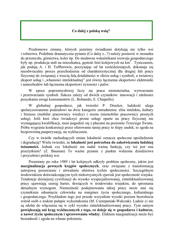 Co dalej z polską wsią? Przełomowe zmiany, których jesteśmy świadkami dotykają nie tylko wsi i rolnictwa. Podobnie dramatyczne pytanie (Co dalej z...?) należy postawić w stosunku do przemysłu, górnictwa, kolei itp. Do niedawna wskaźnikami rozwoju gospodarczego były np. produkcja stali na mieszkańca, gęstość linii kolejowych na km2. Tymczasem, jak podają A. i H. Tofflerowie, poczynając od lat sześćdziesiątych, dokonuje się nieodwracalny proces przechodzenia od charakterystycznej dla drugiej fali pracy fizycznej do związanej z trzecią falą działalności w sferze usług i symboli, a światowy eksport usług i „własności intelektualnej” jest równy łącznemu eksportowi elektroniki i samochodów lub łącznemu eksportowi żywności i paliw. W epoce poprzemysłowej liczy się praca niematerialna, wytwarzanie i przetwarzanie symboli. Sukces zależy od dwóch czynników: innowacji i zdolności pozyskania uwagi konsumentów (L. Boltanski, E. Chiapello). W globalnej gospodarce, jak twierdzi P. Drucker, ludzkość ulega spolaryzowanemu podziałowi na dwie kategorie zatrudnienia: elita intelektu, kultury i biznesu (mobilni pracownicy wiedzy) i reszta (niemobilni pracownicy prostych usług). Jeśli ktoś chce świadczyć proste usługi oparte na pracy fizycznej nie wymagającej kwalifikacji, musi pogodzić się z płacami na poziomie Trzeciego Świata. Próba wygrania konkurencji przez oferowanie taniej pracy to ślepy zaułek, to zgoda na bezpowrotną pauperyzację, na wykluczenie. Czy w świetle zachodzących zmian lokalność oznacza społeczne upośledzenie i degradację? Wielu twierdzi, że lokalność jest potrzebna do zakotwiczenia ludzkiej tożsamości. Jednak czy lokalność ma nadal ważną funkcję, czy też jest ona przeżytkiem? (Z. Bauman) To ważne pytanie z punktu widzenia dziedzictwa i przyszłości polskiej wsi. Przemiany po roku 1989 i lat kolejnych odkryły problem społeczny, jakim jest marginalizacja pewnych kręgów społecznych, oraz związane z transformacją ustrojową poszerzenie i utrwalenie ubóstwa tychże społeczności. Szczególnym środowiskiem doświadczającym tych niekorzystnych zjawisk jest społeczność wiejska. Tendencje dzisiejszej cywilizacji do wysoko wyspecjalizowanej, zintelektualizowanej pracy ujawniają szereg barier, tkwiących w środowisku wiejskim, do sprostania aktualnym wymogom. Niemożność podejmowania takiej pracy może stać się czynnikiem odsunięcia człowieka na margines życia społecznego, kulturalnego i gospodarczego. Przykładem tego jest przede wszystkim wysoki poziom bezrobocia wśród osób o niskim pułapie wykształcenia (M. Czerepaniak-Walczak). Ludzie ci nie są zdolni do włączenia się w cykl wysoko zintelektualizowanej pracy. Tym samym powiększają oni krąg wykluczonych z tego, co dzieje się w gospodarce i kulturze, a nawet życiu społecznym i sprawowaniu władzy. Efektem marginalizacji może być bezradność i zgoda na własne położenie. Marginalizacja to wyłączenie (w pełni lub w jakimś stopniu) z udziału w korzyściach, jakie daje dostęp do rozmaitych instytucji zorganizowanego społeczeństwa. Przyczyn marginalizacji można upatrywać w wielu źródłach, wśród których kluczowe miejsca zajmują: krótka droga edukacyjna (niski poziom wykształcenia) i rozpoczęcie pracy w młodym wieku, wejście na stałe w sferę pracy niewykwalifikowanej i w konsekwencji – niemożność podniesienia statusu materialnego, nieregularne albo długotrwale małe dochody i niski standard życia, ubogi styl życia oraz słabe warunki higieniczne i żywieniowe prowadzące do złego stanu zdrowia. Nie bez znaczenia są też takie przyczyny jak organiczne ograniczenia sprawności fizycznej i intelektualnej, kondycja zdrowotna, niskie kompetencje społeczne, itp. Zjawisko ucisku, marginalizacji i wykluczenia jest zwykle następstwem synergii tych czynników (M. Czerepaniak-Walczak). Najszybciej proces marginalizacji społecznej postępuje na obszarach wiejskich, a szczególnie w wielu wsiach popegeerowskich. Najbardziej niebezpiecznym jednak zjawiskiem, które może się pojawić, jest reprodukcja rozszerzona owego marginesu (dziedziczenie biedy) - powstanie trwałej grupy społecznej drugiej kategorii. Grupą społeczną, która może tego zjawiska w sposób najbardziej bolesny doświadczyć jest młodzież. K. Szafraniec wskazuje na bezsilność w kierowaniu własnym losem przez młodych mieszkańców wsi. Jej zdaniem, ma to swoje źródło nie tyle w młodzieńczej niedojrzałości, ile w braku sprzyjających okoliczności życiowych, co bezpośrednio prowadzi do apatii (wyuczonej bezradności) lub do zachowań patologicznych i agresywnych. Wielu badaczy wskazuje na istnienie tzw. „kultury biedy”, w której wzrasta młodzież wiejska. S. Leopold określił ubóstwo jako dominującą kulturę polskiej wsi, twierdząc, że około 80% rodzin wiejskich znajduje się w kręgu tej kultury. Na tę ubożejącą sytuację rodzin wiejskich nałożyły się kolejne zjawiska, które ułożyły się w początku lat 90-tych w potężną barierę zagradzającą młodzieży wiejskiej dostęp do kształcenia ponadpodstawowego. Do tych zjawisk należy zaliczyć radykalną redukcję stypendiów. W roku 1998 mniej niż 1% dzieci i młodzieży otrzymało pomoc w formie stypendium. Grozi to patologicznością zachowań oraz przejmowaniem od rodziców bezradności, a przede wszystkim pogłębia istniejącą marginalizację i związane z tym ubóstwo. Może to doprowadzić również do frustracji i poczucia społecznej deprywacji. Mamy do czynienia z błędnym kołem tego zjawiska – dziedziczeniem marginesu społecznego. Zarysowane zjawisko wymaga podjęcia określonych dróg przeciwdziałania. Jednym z nich jest obranie określonej strategii edukacyjnej (M. Mikut). W procesie wychowania należy tworzyć warunki do nabywania i rozwijania umiejętności świadomego uwalniania się od zależności i ograniczeń