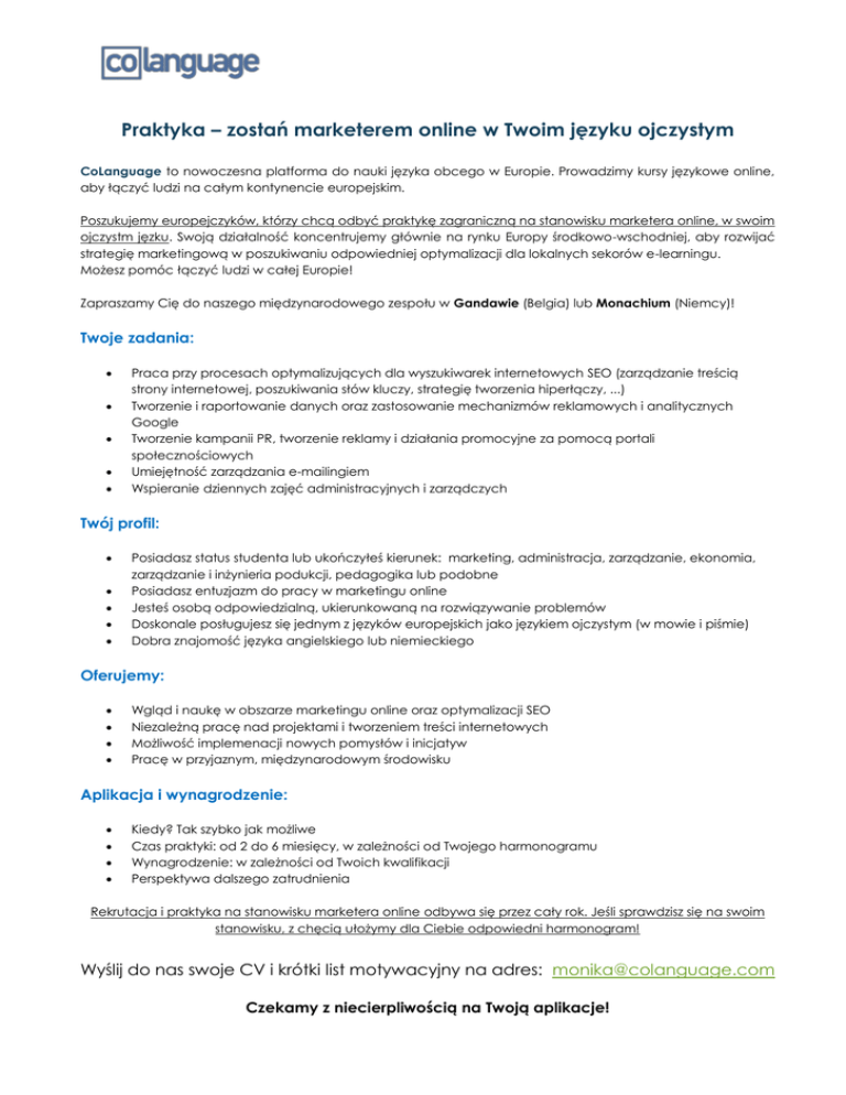 Praktyka – zostań marketerem online w Twoim języku ojczystym CoLanguage to nowoczesna platforma do nauki języka obcego w Europie. Prowadzimy kursy językowe online, aby łączyć ludzi na całym kontynencie europejskim. Poszukujemy europejczyków, którzy chcą odbyć praktykę zagraniczną na stanowisku marketera online, w swoim ojczystm jęzku. Swoją działalność koncentrujemy głównie na rynku Europy środkowo-wschodniej, aby rozwijać strategię marketingową w poszukiwaniu odpowiedniej optymalizacji dla lokalnych sekorów e-learningu. Możesz pomóc łączyć ludzi w całej Europie! Zapraszamy Cię do naszego międzynarodowego zespołu w Gandawie (Belgia) lub Monachium (Niemcy)! Twoje zadania: Praca przy procesach optymalizujących dla wyszukiwarek internetowych SEO (zarządzanie treścią strony internetowej, poszukiwania słów kluczy, strategię tworzenia hiperłączy, ...) Tworzenie i raportowanie danych oraz zastosowanie mechanizmów reklamowych i analitycznych Google Tworzenie kampanii PR, tworzenie reklamy i działania promocyjne za pomocą portali społecznościowych Umiejętność zarządzania e-mailingiem Wspieranie dziennych zajęć administracyjnych i zarządczych Twój profil: Posiadasz status studenta lub ukończyłeś kierunek: marketing, administracja, zarządzanie, ekonomia, zarządzanie i inżynieria podukcji, pedagogika lub podobne Posiadasz entuzjazm do pracy w marketingu online Jesteś osobą odpowiedzialną, ukierunkowaną na rozwiązywanie problemów Doskonale posługujesz się jednym z języków europejskich jako językiem ojczystym (w mowie i piśmie) Dobra znajomość języka angielskiego lub niemieckiego Oferujemy: Wgląd i naukę w obszarze marketingu online oraz optymalizacji SEO Niezależną pracę nad projektami i tworzeniem treści internetowych Możliwość implemenacji nowych pomysłów i inicjatyw Pracę w przyjaznym, międzynarodowym środowisku Aplikacja i wynagrodzenie: Kiedy? Tak szybko jak możliwe Czas praktyki: od 2 do 6 miesięcy, w zależności od Twojego harmonogramu Wynagrodzenie: w zależności od Twoich kwalifikacji Perspektywa dalszego zatrudnienia Rekrutacja i praktyka na stanowisku marketera online odbywa się przez cały rok. Jeśli sprawdzisz się na swoim stanowisku, z chęcią ułożymy dla Ciebie odpowiedni harmonogram! Wyślij do nas swoje CV i krótki list motywacyjny na adres: [email protected] Czekamy z niecierpliwością na Twoją aplikacje!