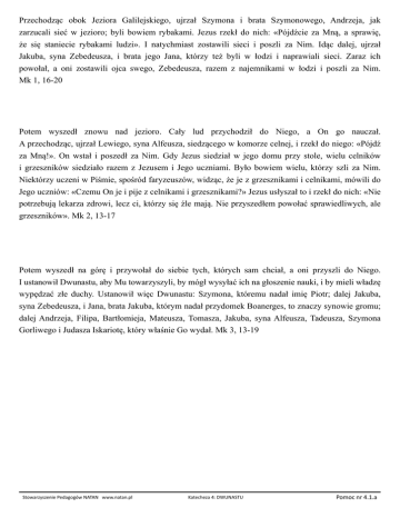 Przechodząc obok Jeziora Galilejskiego, ujrzał Szymona i brata Szymonowego, Andrzeja, jak zarzucali sieć w jezioro; byli bowiem rybakami. Jezus rzekł do nich: «Pójdźcie za Mną, a sprawię, że się staniecie rybakami ludzi». I natychmiast zostawili sieci i poszli za Nim. Idąc dalej, ujrzał Jakuba, syna Zebedeusza, i brata jego Jana, którzy też byli w łodzi i naprawiali sieci. Zaraz ich powołał, a oni zostawili ojca swego, Zebedeusza, razem z najemnikami w łodzi i poszli za Nim. Mk 1, 16-20 Potem wyszedł znowu nad jezioro. Cały lud przychodził do Niego, a On go nauczał. A przechodząc, ujrzał Lewiego, syna Alfeusza, siedzącego w komorze celnej, i rzekł do niego: «Pójdź za Mną!». On wstał i poszedł za Nim. Gdy Jezus siedział w jego domu przy stole, wielu celników i grzeszników siedziało razem z Jezusem i Jego uczniami. Było bowiem wielu, którzy szli za Nim. Niektórzy uczeni w Piśmie, spośród faryzeuszów, widząc, że je z grzesznikami i celnikami, mówili do Jego uczniów: «Czemu On je i pije z celnikami i grzesznikami?» Jezus usłyszał to i rzekł do nich: «Nie potrzebują lekarza zdrowi, lecz ci, którzy się źle mają. Nie przyszedłem powołać sprawiedliwych, ale grzeszników». Mk 2, 13-17 Potem wyszedł na górę i przywołał do siebie tych, których sam chciał, a oni przyszli do Niego. I ustanowił Dwunastu, aby Mu towarzyszyli, by mógł wysyłać ich na głoszenie nauki, i by mieli władzę wypędzać złe duchy. Ustanowił więc Dwunastu: Szymona, któremu nadał imię Piotr; dalej Jakuba, syna Zebedeusza, i Jana, brata Jakuba, którym nadał przydomek Boanerges, to znaczy synowie gromu; dalej Andrzeja, Filipa, Bartłomieja, Mateusza, Tomasza, Jakuba, syna Alfeusza, Tadeusza, Szymona Gorliwego i Judasza Iskariotę, który właśnie Go wydał. Mk 3, 13-19 Stowarzyszenie Pedagogów NATAN www.natan.pl Katecheza 4: DWUNASTU Pomoc nr 4.1.a
