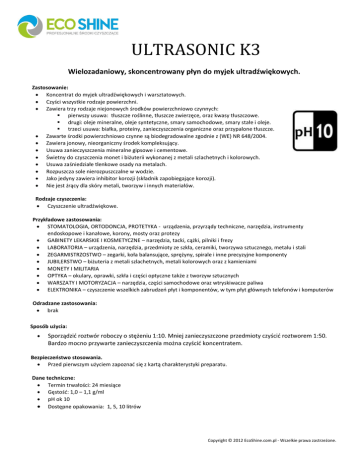 ULTRASONIC K3 Wielozadaniowy, skoncentrowany płyn do myjek ultradźwiękowych. Zastosowanie:  Koncentrat do myjek ultradźwiękowych i warsztatowych.  Czyści wszystkie rodzaje powierzchni.  Zawiera trzy rodzaje niejonowych środków powierzchniowo czynnych:  pierwszy usuwa: tłuszcze roślinne, tłuszcze zwierzęce, oraz kwasy tłuszczowe.  drugi: oleje mineralne, oleje syntetyczne, smary samochodowe, smary stałe i oleje.  trzeci usuwa: białka, proteiny, zanieczyszczenia organiczne oraz przypalone tłuszcze.  Zawarte środki powierzchniowo czynne są biodegradowalne zgodnie z (WE) NR 648/2004.  Zawiera jonowy, nieorganiczny środek kompleksujący.  Usuwa zanieczyszczenia mineralne gipsowe i cementowe.  Świetny do czyszczenia monet i biżuterii wykonanej z metali szlachetnych i kolorowych.  Usuwa zaśniedziałe tlenkowe osady na metalach.  Rozpuszcza sole nierozpuszczalne w wodzie.  Jako jedyny zawiera inhibitor korozji (składnik zapobiegające korozji).  Nie jest żrący dla skóry metali, tworzyw i innych materiałów. Rodzaje czyszczenia:  Czyszczenie ultradźwiękowe. Przykładowe zastosowania:  STOMATOLOGIA, ORTODONCJA, PROTETYKA - urządzenia, przyrządy techniczne, narzędzia, instrumenty endoskopowe i kanałowe, korony, mosty oraz protezy  GABINETY LEKARSKIE I KOSMETYCZNE – narzędzia, tacki, cążki, pilniki i frezy  LABORATORIA – urządzenia, narzędzia, przedmioty ze szkła, ceramiki, tworzywa sztucznego, metalu i stali  ZEGARMISTRZOSTWO – zegarki, koła balansujące, sprężyny, spirale i inne precyzyjne komponenty  JUBILERSTWO – biżuteria z metali szlachetnych, metali kolorowych oraz z kamieniami  MONETY I MILITARIA  OPTYKA – okulary, oprawki, szkła i części optyczne także z tworzyw sztucznych  WARSZATY I MOTORYZACJA – narzędzia, części samochodowe oraz wtryskiwacze paliwa  ELEKTRONIKA – czyszczenie wszelkich zabrudzeń płyt i komponentów, w tym płyt głównych telefonów i komputerów Odradzane zastosowania:  brak Sposób użycia:  Sporządzić roztwór roboczy o stężeniu 1:10. Mniej zanieczyszczone przedmioty czyścić roztworem 1:50. Bardzo mocno przywarte zanieczyszczenia można czyścić koncentratem. Bezpieczeństwo stosowania.  Przed pierwszym użyciem zapoznać się z kartą charakterystyki preparatu. Dane techniczne:  Termin trwałości: 24 miesiące  Gęstość: 1,0 – 1,1 g/ml  pH ok 10  Dostępne opakowania: 1, 5, 10 litrów Copyright © 2012 EcoShine.com.pl - Wszelkie prawa zastrzeżone.