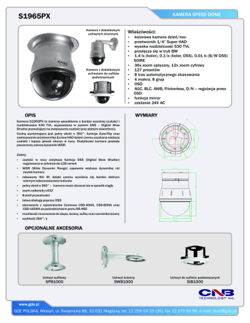KAMERA SPEED DOME S1965PX Kamera z dodatkowym uchwytem ściennym Właściwości: kolorowa kamera dzień/noc przetwornik 1/4” Super HAD wysoka rozdzielczość 530 TVL przełącza się w tryb BW 1,4 lx (kolor), 0,1 lx (kolor, DSS), 0,01 lx (B/W DSS) 50IRE Kamera z dodatkowym uchwytem do sufitów podwieszanych 36x zoom optyczny, 12x zoom cyfrowy 127 presetów 8 tras automatycznego skanowania 4 makra, 8 grup OSD AGC, BLC, AWB, Flickerless, D/N – regulacja przez OSD funkcja mirror zasilanie 24V AC WYMIARY OPIS ∅99.6 5. 0 86.3 ° ∅137.3 154.2 0.0 76.7 12 ° 11 Zalety: czułość w nocy zwiększa funkcja DSS (Digital Slow Shutter) regulowana w zakresie do 128 ramek WDR (Wide Dynamic Range) zapewnia większa dynamikę niż zwykłe kamery odsuwany filtr IR, dzięki czemu wyróżnia się bardzo dobrym wiernym odwzorowaniem kolorów pełny obrót o 360° – kamera może obracać się w sposób ciągły zoom całkowity x432 8 stref prywatności łatwa obsługa poprzez OSD sterowanie z rejestratorów Commax CSD-40HA, CSD-80HA oraz CSD-160HA za pośrednictwem portu RS-485 możliwość mocowania do słupa, ściany, sufitu oraz narożnika ściany szybkość 360°/s 120.0 Kamera S1965PX to kamera speeddome o bardzo wysokiej czułości i rozdzielczości 530 TVL, wyposażona w system DSS – Digital Slow Shutter pozwalający na zwiększenie czułości przy słabym oświetleniu. Cechą wyróżniająca jest pełny obrót o 360°, funkcja Auto-Flip oraz zastosowanie przetwornika Exview HAD dzięki czemu uzyskaną większą czułość i lepsza jakość obrazu w nocy. Dodatkowo kamera posiada poszerzony zakres dynamiki WDR. ∅149.0 ∅163.6 OPCJONALNE AKCESORIA Uchwyt sufitowy Uchwyt ścienny Uchwyt do sufitów podwieszanych SPB1000 SWB1000 SIB1000 www.gde.pl GDE POLSKA, Włosań, ul. Świątnicka 88, 32-031 Mogilany, tel. 12 256 50 25 (35), fax 12 270 56 96, e-mail: [email protected] KAMERA SPEED DOME S1965PX SPECYFIKACJA Model S1965PX Standard sygnału video PAL System skanowania 2:1 z przeplotem Częstotliwość skanowania w poziomie (H) 15,625 kHz Częstotliwość skanowania w pionie (V) 50 Hz Przetwornik ¼" SONY ExView CCD Rozdzielczość efektywna 752(H) x 582(V) 440K Liczba linii 530 TVL WDR Wł./Wył. Wyjście video 1,0V p-p, 75 Ohm Odstęp sygnał/szum >50 dB (AGC wył.) Obiektyw f=3,4~122,4m, F1,6~4,5 Zoom 36x optyczny, 12x cyfrowy Ostrość auto/ręcznie/półautomatycznie Tryb dzień/noc mechaniczny filtr IR Czułość 1,4 lx / 0,1 lx(kolor,DSS) / 0,01 lx (b/w DSS x128) 50IRE Menu OSD Angielski Balans bieli automatyczny/ręczny Automatyczna regulacja wzmocnienia (AGC) tak Ostrość Automatyczna/ręczna-półautom. Kompensacja światła tylnego BLC, Wł./Wył., strefowa Redukcja migotania Wł./Wył. Jasność regulowana Strefy prywatne 8 programowalnych stref Odbicie lustrzane obrazu reverse / mirror Elektroniczna migawka 1/3~1/10 000 sek. Ręczna migawka 1/3 ~ 1/10 000 sek. Obrót w pionie 360° w pionie Obrót w poziomie 90° w poziomie Prędkość obrotu maks. prędkość 360°/s Zmiana prędkości obrotu 1~360°/s (zależne od zoom) Dokładkość obrotu 0,25° Presety 127 z indywidualną regulacja parametrów obrazu Skanowanie 8 Makra 4 Grupy 8 Inne Auto Flip, Auto Parking, wznawianie ruchu po zaniku zasilania, Freeze in Preset, RS-485 Obsługiwane protokoły Pelco-D, Pelco-P Stopień ochrony IP IP66 Wejścia/wyjścia alarmowe 4/2 Zasilanie 24 V AC (19~29V AC) Pobór prądu max. 2A / 48 VA Fi 149 mm / fi 163,6 x 230,9mm (bez pierścienia dekoracyjnego) -30°C~50°C / 30%~80% RH 2,5 kg / 0,768 kg uchwyt ścienny / 0,880kg uchwyt sufitowy / 0,984kg mocowanie podtynkowe kamera speeddome wewnętrzna Wymiary ( Ø x wys.) Temperatura pracy / Wilgotność Waga Zastosowanie www.gde.pl GDE POLSKA, Włosań, ul. Świątnicka 88, 32-031 Mogilany, tel. 12 256 50 25 (35), fax 12 270 56 96, e-mail: [email protected]