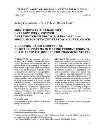ZESZYTY NAUKOWE AKADEMII MARYNARKI WOJEN NEJ SCIENTIFIC JOURNAL OF POLISH NAVAL ACADEMY 2014 (LV) 4 (199) Andrzej Grządziela 1 ) , Pero Vidan 2 ) , Nikola Racić 2 ) MONITOROWANIE DRGANI OWE UKŁADÓW WIRNIKOWYCH OKRĘTOWYCH SILNIKÓW TURBINOWYCH — MODUŁ DIAGNOSTYCZNY STANÓW NIEUSTALONYCH VIBRATION-BASED MONITORING OF ROTOR SYSTEMS IN MARINE TURBINE ENGINES — A DIAGNOSTIC MODULE FOR TRANSIENT STATES STRESZCZENIE W artykule przedstawiono cele i metody diagnostyki drganiowej okrętowych turbinowych silników spalinowych ze szczególnym uwzględnieniem badań w procesie rozruchu i zatrzymania silnika. Dokonano podziału metod na jakościowe i ilościowe oraz przedstawiono ich zakres stosowalności. Przedstawiono rolę baz danych identyfikujących cechy charakterystyczne parametrów drganiowych analizowanych w trybie on-line. Scharakteryzowano i sklasyfikowano metodę badań w stanach nieustalonych oraz przedstawiono wrażliwość symptomów drganiowych na występujące uszkodzenia. układów wirnikowych w procesie Przedstawiono metodykę identyfikacji uszkodzeń wybiegu silnika. ABSTRACT The article presents objectives and methods for vibration diagnostics of marine turbine internal combustion engines with special emphasis on the start and stop processes of the engine. It divides the methods into qualitative ones and quantitative ones and shows the scope of their use. It also presents the role of data bases which identify properties of vibration parameters analyzed on-line. It characterizes and classifies the method used for investigations in transient states and it also presents the sensitivity of vibration symptoms to occurring damage. It also presents procedures used to identify damage in rotor systems in the process of engine coasting. Słowa kluczowe: diagnostyka, drgania, silniki turbinowe, stany nieustalone. Keywords: diagnostics, vibrations, turbine engines, transient states. DOI: 10.5604/0860889X.1139630 Akademia Marynarki Wojennej, Wydział Mechaniczno-Elektryczny, 81-103 Gdynia, ul. J. Śmidowicza 69; e-mail: [email protected] 2) University of Split, Faculty of Marine Studies, Livanjska 5, 21000 Split, Croatia 1) 5 Andrzej Grządziela, Pero Vidan, Nikola Racić WSTĘP INTRODUCTION Badania silników turbinowych najczęściej są realizowane jako wielosymptomowe [11]. Pierwszym zbiorem danych podlegających analizie statystycznej, popartej sieciami neuronowymi lub systemami ekspertowymi, są parametry termo-gazodynamiczne [8, 18, 21]. Symptomy te identyfikują procesy występujące w transmisji energii dostarczonej na energię użyteczną. Obejmują one analizy prędkości obrotowych, temperatury, ciśnienia. Badania są ukierunkowane na identyfikację uszkodzeń mechanicznych układu wirnikowego, zanieczyszczenia traktu przepływowego, zużycia łożysk, zasolenia, uszkodzenia uszczelnień, nieprawidłową pracę wtryskiwaczy lub komór spalania itp. Metody mają charakter ilościowo-jakościowy, umożliwiają identyfikację wczesnych symptomów uszkodzeń i analizę trendu parametrów je identyfikujących. Testing turbine engines is most often based on a multi-symptom approach [11]. The first set of data which is subject to a statistic analysis, supported with neuron networks or expert systems are thermo-gasodynamic parameters [8, 18, 21]. These symptoms identify the processes which occur in energy transmission transferred into effective energy. They include analyses of rotational speed magnitudes, temperature, and pressure. Tests are aimed at identifying pollution in a flow pipe, bearing wear, salinity, sealing failures, and the faulty performance of injectors or combustion chambers, etc. They are quantitative-qualitative methods and they can be used for the early identification of failure symptoms and analyze the trend in the parameters that identify them. Drugim zbiorem danych podlegających ocenie diagnostycznej są parametry drganiowe, które należy rozumieć jako analizę energii strat występujących w procesie pracy silnika. Wielkość tych strat, ich charakter oraz cechy charakterystyczne rozumiane jako symptomy w wielu wypadkach można jednoznacznie przyporządkować określonym uszkodzeniom silników turbinowych [3, 8, 9, 17]. Badania są ukierunkowane na identyfikację niewyrównoważenia wirników, odchyłek współosiowości, uszkodzeń łożysk, zmian sztywności posadowienia wirników i silnika itp. Zbiór danych parametrów drganiowych ma zarówno charakter jakościowy — 6 The second set of data subject to diagnostic evaluation is the vibration parameters, which must be understood as an analysis of energy losses during engine performance. The amount of loss, its character and features understood as symptoms can, in many cases, be attributed to specific failures of a turbine engine [3, 8, 9, 17]. The tests are aimed at identifying the unbalance of rotors, coaxiality deviation, bearing damage, and changes in the foundation rigidity of an engine or a rotor, etc. The set of vibration data has both the quantitative and qualitative character — tests of changes in the magnitude of the first harmonic of speed or vibration displacement. On-line test 4 (199) Zeszyty Naukowe AMW — Scientific Journal of PNA badania zamian wartości pierwszej harmonicznej prędkości lub przemieszczeń drgań. Oba zbiory charakteryzują się możliwością zastosowania technik badawczych typu on-line. Badania endoskopowe oraz parametry fizyko-chemiczne oleju smarowego są trzecim zbiorem danych diagnostycznych realizowanych w trybie off-line. W wielu wypadkach parametry te identyfikują uszkodzenia stwierdzone w dwóch pierwszych procedurach oraz jednoznacznie i dokładnie wskazują na miejsce uszkodzenia [5, 8, 10]. Badania te może wykonać dobrze przeszkolony personel techniczny na okręcie. Badania parametrów drganiowych w trybie on-line w stanach ustalonych są typową procedurą realizowaną przez producentów i wykonawców profesjonalnych systemów diagnostycznych. Firma